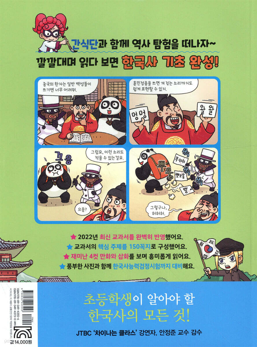 2019년부터 초등 사회 교과서(한국사 포함)가 개정되어 기존 교과서에 없던 내용이 새로 추가되었어요. 백제 역사 유적 지구, 일제 강점기 여성 독립운동가 관련 내용 등이 바로 그것인데요. 『하루 한 꼭지 초등 한국사』는 최신 교과서를 꼼꼼히 분석하고 정리하여 그 내용을 책 속에 충실히 반영하고, 풍부한 자료와 설명을 곁들였어요. 2. 두 권, 150꼭지면 한국사의 핵심이 파악되고 흐름이 잡혀요! 구석기 시대 뗀석기 사용부터 현대의 전 세계적인 한류 열풍까지, 한국사 전체를 150가지 주제로 정리했어요. 한 꼭지 한 꼭지 부담 없이 읽다 보면 초등학생은 물론 어른들까지도 한국사의 주요 사건과 인물, 문화유산들이 머릿속에 쏙쏙 채워져요. 150가지의 핵심 주제는 목차에서 한눈에 파악할 수 있어 궁금한 내용부터 찾아볼 수 있어요. 본문에서는 각 주제별 핵심 내용과 중요한 키워드를 콕 집어 강조 표시하고 있어 학습한 내용을 정리하기에도 편리해요. 혼자서 공부하는 용도로도, 학원과 공부방의 수업용으로도 강력히 추천해요! 3. 초등 한국사 베스트셀러 제작진이 뭉쳐 만든 새로운 어린이 한국사! 초등 베스트셀러 〈용선생 한국사〉 시리즈 개발에 참여한 저자들과 편집진이 시대 변화에 맞춰 새롭게 만든 어린이 한국사 책이에요. 그동안 유익한 한국사 도서를 개발했던 노하우를 바탕으로 부모님과 선생님들의 요구 사항을 책의 곳곳에 촘촘히 반영했어요. 초등 저학년 도서에서 접하기 어려웠던 근현대사 부분을 충분히 다뤘고, 어느 한쪽에 치우치지 않는 객관적 관점으로 역사 내용을 서술했어요. 다양한 형태의 코너로 학습성을 극대화하였고, 오랫동안 한국사를 연구해 온 교수님이 내용 전반을 꼼꼼히 감수했어요. 이처럼 신뢰할 수 있는 제작진과 감수자가 심혈을 기울여 만든 책이라 아이들에게 자신 있게 권할 수 있어요! 4. 만화책보다 재미있는 줄글책, 아이들의 독해력도 향상돼요! 생동감 있는 역사 인물들의 대사와 친숙한 입말체 서술로 옛날이야기 읽듯이 술술 읽을 수 있어요. 매 꼭지 각 주제의 핵심 내용을 위트 있게 풀어 놓은 4컷 만화, 시대 분위기가 한눈에 파악되는 삽화가 실려 있어 줄글책이지만 만화책보다 더 재미있게 읽으면서 역사 공부를 할 수 있어요. 아이들이 좋아하는 인기 학습만화의 캐릭터 간식단이 출연하여 시키지 않아도 아이들이 먼저 찾아 읽게 돼요. 흥미롭게 책을 읽다 보면 어느새 아이들의 독해력도 함께 향상돼요. 5. 풍부한 사진과 알찬 코너로 한국사능력검정시험까지 대비해요! 개정된 초등 사회 교과서에 실린 사진을 포함해 방대한 양의 사진 자료들을 수록했어요. 중요한 유물과 유적을 사진으로 생생하게 체험하면서 한국사를 공부할 수 있어요. 매 꼭지마다 핵심 키워드를 확인하면서 효과적으로 학습하고, 〈쏙쏙 퀴즈〉로 학습 내용을 체크해요. 단원 말미에는 시대별 핵심 내용을 요약한 〈역사 탐험 보고서〉, 흥미로운 액티비티 〈간식 타임〉으로 학습 내용을 충실하게 정리할 수 있어요. 여기에 더해 최근 시행된 한국사능력검정시험(기본)의 기출 문제를 풀어 보면서 한국사능력검정 시험까지 대비할 수 있어요. |