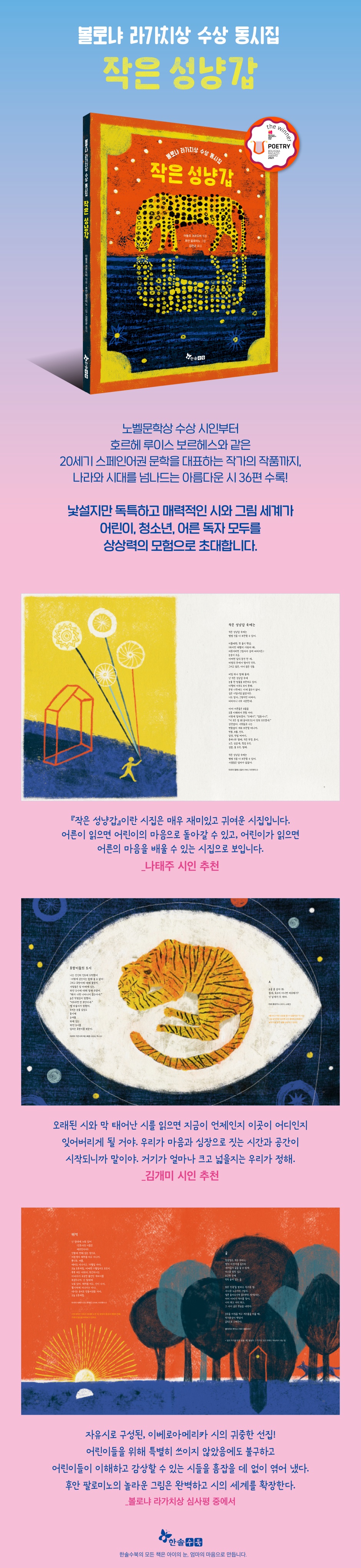 한 줄기 햇살, 눈송이 조금, 나무 열매, 별, 그리고 비밀 이야기……. 나라와 시대를 넘나드는 아름다운 시들을 읽고, 나만의 ‘작은 성냥갑’을 채워 보세요. 『작은 성냥갑』은 2021년 볼로냐 라가치상 특별 부문 수상 동시집입니다. 이베로아메리카 10개국 36명의 시인들이 최근 100년 동안 쓴 시를 엄선해 담았지요. 그중 가장 오래된 것은 1920년에 발표되었고, 가장 최근 것은 2020년에 발표되었습니다. 가브리엘라 미스트랄, 후안 라몬 히메네스와 같은 노벨문학상 수상 시인들을 비롯해서 호르헤 루이스 보르헤스, 후아나 데 이바르부루 등 20세기 스페인어권 문학을 대표하는 작가들의 작품이 다수 포함되어 있습니다. 멕시코의 작가이자 저널리스트인 아돌포 코르도바는 압운과 율격이 없는 자유시와 산문시를 모아 어린이와 청소년을 위한 특별한 시선집을 만들고 싶어 이 책을 기획하게 되었습니다. 그는 여러 나라를 돌아다니며 보석 같은 시들을 찾아내고, 그 시들이 한 권의 책 속에서 서로 조화롭게 어울릴 수 있도록 견고하게 구성했습니다. 그렇게 열 개의 나라 36명의 시인들의 작품이 『작은 성냥갑』 안에 담기게 되었지요. 후안 팔로미노의 그림은 이 책을 더욱 특별하게 만들어 주었습니다. 볼로냐 라가치상 심사평에서 “후안 팔로미노의 놀라운 그림은 완벽하고 시의 세계를 확장하는 한편, 풍부한 색채와 극적인 이미지는 독자의 적극적인 상상력을 위한 충분한 여지를 남겨 준다.”라는 평을 받았습니다. 후안 팔로미노의 시에 대한 탁월한 해석과 감각적인 표현은 독자로 하여금 시의 세계를 더욱 깊이 있게 감상할 수 있게 합니다. 아돌포 코르도바는 시들을 구성할 때 “하나의 성냥 머리에서 다른 성냥 머리로 옮겨 붙는 불의 이미지를 염두에 두었다”고 합니다. 시들은 각각 독립적인 목소리를 내면서도 서로 긴밀하게 연결되어 있지요. 책을 읽다 보면 시간과 공간을 넘나드는 다양한 목소리를 들을 수 있을 것입니다. 그 목소리들 틈에서 독자는 자유롭게 상상하고 자신의 목소리를 찾을 수 있습니다. 독특하고 아름다운 시와 그림으로 가득한 『작은 성냥갑』은 어린이와 청소년, 어른까지 모든 독자들을 상상력의 모험으로 초대하고 예술적 영감을 선사합니다. 초등교과 연계 국어 2-1 1. 시를 즐겨요 | 11. 상상의 날개를 펴요 국어 2-2 1. 장면을 떠올리며 | 5. 간직하고 싶은 노래 국어 3-1 1. 재미가 톡톡톡 | 10. 문학의 향기 국어 3-2 4. 감동을 나타내요 국어 4-1 1. 생각과 느낌을 나누어요 국어 4-2 9. 감동을 나누며 읽어요 |