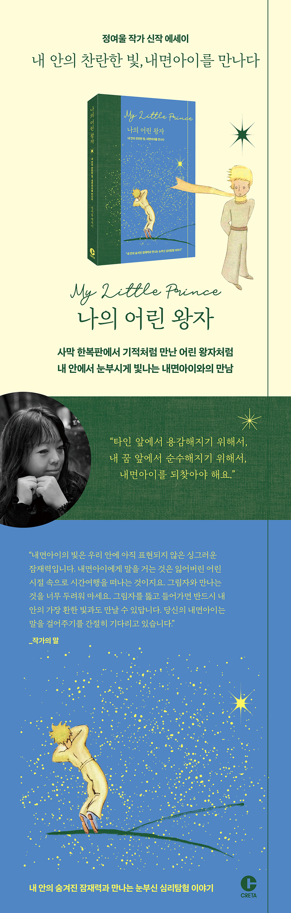 사막 한복판에서 기적처럼 만난 어린 왕자처럼 내 안에서 눈부시게 빛나는 내면아이와의 만남문학작품 『어린 왕자』에 대해 해설하는 글은 무수히 많다. 하지만 대부분 『어린 왕자』의 작품 속 맥락 안에서 삶을 대하는 자세를 배운다. 문학평론가이자 작가 정여울은 단순히 작품 해석의 차원을 넘어 독자들에게 『어린 왕자』가 자신의 인생에서 어떤 의미였는지 고백한다. 정여울 작가는 인생의 사막 한복판에서 호기심 어린 눈을 반짝이며 자신에게 끊임없이 질문을 던지는 어린 왕자를 기적처럼 발견한다. 작가의 마음속 어린 왕자는 우리가 살면서 반드시 만나야 할 내면아이였고, 정여울 작가는 그와 대화하기 위해 ‘조이’라는 이름을 지어준다. 내면아이와 대화는커녕 노크하기도 힘든 사람들에게 작가는 이렇게 친절히 알려준다. “내면아이에게 말을 거는 것은 잃어버린 어린 시절 속으로 시간여행을 떠나는 것입니다. 희미해진 부분을 선명하게 만들어서 ‘내가 되찾아야 할 나’를 보다 명확하게 만드는 것은 결국 나 자신에게 도움이 됩니다. 내면아이의 상처가 선명하게 깨어나는 순간, 그때 돌보지 못했던 나의 소중한 부분도 함께 깨어나는 것입니다. 그림자와 만나는 것을 너무 두려워하지는 말았으면 좋겠습니다. 그림자의 층을 뚫고 들어가면 반드시 내 안의 가장 환한 빛과도 만날 수 있습니다. 상처 때문에 나의 잠재력을 발전시키지 못했다는 것을 알게 되는 것입니다. ‘너는 이것밖에 못 하니’, ‘저 아이는 저렇게 잘하는데’라는 어른들의 비난을 들으면서 급격하게 소심한 성격으로 바뀌었던 순간들이 기억났습니다. 저도 표현하고 싶은 마음, 재능, 꿈이 많았는데, 그것을 잘 표현하지 못하는 어른이 되어버렸어요. 다행히도 글쓰기라는 탈출구가 있었기에, 제 안의 잠재력을 깨닫게 되었습니다. 누구에게나 표현의 탈출구가 필요합니다. 그 표현의 탈출구를 열어주기 위해, 내면아이와의 대화가 필요한 것이지요.”내 안의 숨겨진 잠재력과 만나는 눈부신 심리탐험 이야기“내면아이와의 대화를 통해 나만의 ‘베프’를 만나세요.”『나의 어린 왕자』는 총 10개의 챕터로 구성했다. 각 챕터는 루나와 조이의 대화를 전면에 배치하고, 정여울 작가가 생텍쥐페리의 『어린 왕자』 영문판을 직접 번역한 ‘어린 왕자의 말’, 그리고 독자가 직접 참여할 수 있는 질문으로 구성되어 있다. 정여울 작가가 던지는 질문은 각자의 경험에 따라 새로운 의미로 다가오는 독자만의 특별한 『어린 왕자』가 되길 바라는 작가의 의지가 담겨 있다. 평소 글쓰기를 격려하는 작가는, 내면아이와의 진솔한 대화를 꿈꾸는 독자들에게 도움이 되길 바라는 마음으로 질문을 몇 번이고 고치고 다듬었다. 독자들은 작가의 질문을 통해 생각하며 마음속 누군가에게 마음을 전하는 계기를 만날 수 있다. 또한 책 전체를 구성하는 10개의 챕터는 마치 이야기의 전개처럼 내면아이 조이와 성인자아 루나의 첫 만남에서부터, 마침내 세상에 둘도 없는 친구가 되기까지의 흐름이 자연스럽게 이어진다. 내면아이와의 대화를 주저하는 독자들에게 정여울 작가는 말한다. “당신의 내면아이는 당신의 성인자아가 말을 걸어주기를 간절히 기다리고 있습니다. 저의 내면아이는 저의 성인자아에게 이렇게 묻습니다. ‘그때 너는 왜 당당하게 너의 길을 가지 않았니? 넌 충분히 꿈을 펼칠 수 있었는데.’ ‘어린 시절 동생들과 시골 할머니 집 대청마루에 누워서 별 보던 거 기억나니? 그때 넌 참 괜찮은 어린이였는데.’ 그런 내면아이의 해맑은 속삭임에 귀 기울이기 시작하자, 좀 더 여유롭고 지혜로운 또 하나의 나와 만나기 시작했습니다. 내면아이의 말을 들어주기만 해도, 당신은 이미 반 이상은 낫기 시작한 것입니다.” 정여울 작가는 “우리 모두 내면아이와의 대화를 통해서 더 나은 인간이 될 수 있는 발판을 마련할 수 있다”면서, “내면아이의 한 맺힌 심정을 들어주고, 현실세계에서 그 내면아이의 슬픔을 풀어주는 행위를 어떻게든 해주면, 분명 내 안의 불안과 공포가 녹아내리기 시작한다”고 전한다. “나를 치유할 수 있는 힘이 내 안에 있다는 것이 너무 다행이지 않나요. 우리는 내면아이를 달래어 세상 밖으로 용감하게 나오도록 이끌 수 있는 건강한 성인자아가 되어가고 있는 것입니다. 내면아이와 만나 속 깊은 대화를 할 수 있다는 것은 나에게 더 나은 어른이 될 수 있는 멋진 기회를 주는 것입니다. 복잡하다 싶으면, 이것만 기억해 두세요. 내면아이와 친구가 되는 것은 나만의 ‘베프’를 내 안에 간직하는 일이라는 것.”정여울 작가가 독자에게 안내하는 치유와 극복의 에너지“운명 앞에서 용감해지기 위해 반드시 내면아이를 되찾으세요.”자신 안의 잠재력을 제대로 펼치지 못한 많은 이들에게 정여울 작가는 말한다. “내면아이의 빛은 우리 안에 아직 표현되지 않은 싱그러운 잠재력”이라고. 작가는 때로 ‘당신의 내면아이가 되어’ 당신의 성인자아에게 속삭이며 응원하고 싶다. “넌 음악을 사랑하잖아. 넌 글을 무척 잘 쓴단다. 난 네가 글을 썼으면 좋겠어.” 이렇게 당신의 내면아