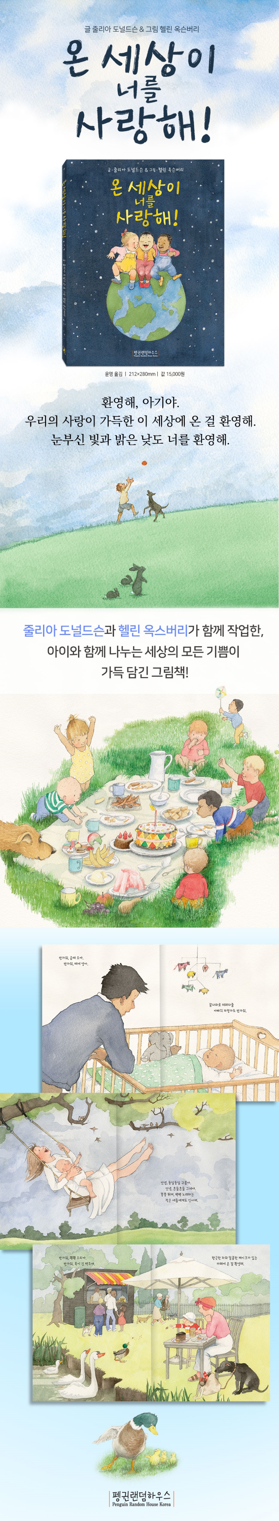 1. 『곰 사냥의 떠나자』의 그림 작가 헬린 옥슨버리의 신작입니다. 2. 영국의 대표 작가 줄리아 도널드슨과 헬린 옥스버리가 함께 작업한 그림책입니다. 3. 아이가 만나게 될 세상의 모두가 보내는 따뜻한 축하 메시지가 가득 담겨 있습니다. 4. 세상의 모든 것들이 궁금한 아이의 눈을 통해 보고, 느끼고, 만나는 즐거움이 가득합니다. 5. 아이들에게 한없는 사랑과 응원을 보내는 부모님와 소중한 아이를 위한 그림책입니다. 줄리아 도널드슨과 헬린 옥슨버리가 함께 작업한 아름다운 그림책! 줄리아 도널드슨은 영국에서 가장 많이 팔린 그림책 중 하나인 『숲속 괴물 그루팔로』로 영국의 권위있는 문학상 중의 하나인 〈네슬레 스마티즈 도서상 금상〉과 〈노팅엄 어린이 도서상〉 그리고 〈블루피터 최고의 어린이 책〉을 수상하며 문학성과 예술성, 대중성을 인정받은 작가입니다. 이후에도 100여권이넘는 어린이와 청소년을 위한 책과 희곡을 쓰고 있습니다. 『곰 사냥을 떠나자』의 헬린 옥스버리는 영국의 대표 그림책 작가 존 버닝햄과 결혼한 뒤 그림책 작업을 시작했습니다. 〈케이트 그린어웨이 상〉과, 〈보스턴 글로브 혼 북 상〉, 〈스마티즈 북 상〉 등 다수의 상을 받으면서 작품성을 널리 인정받았습니다. 이 책은 줄리아 도널드슨과 헬린 옥슨버리가 함께 작업한 두 번째 그림책으로 아기와의 첫 만남에 대한 신비롭고 놀라운 경험을 『온 세상이 너를 사랑해!』에 가득 담았습니다. 『온 세상이 너를 사랑해!』(원서 Welcome to the World)는 섬세한 관찰력과 표현력이 돋보이는 줄리아 도널드슨의 아름다운 글과 따뜻하고 부드러운 색감이 가득한 헬린 옥슨버리의 그림이 짝을 이룬 환상적인 그림책입니다. 따뜻한 집 안에서의 생활과 모험이 가득한 야외 활동, 재미있는 안경 놀이와, 처음 만난 오리에게 먹이를 주는 즐거움까지, 아이와 함께 나누는 세상의 모든 기쁨들이 가득 담겨 있습니다. 반복적인 내용으로 읽는 재미를 살리고 아이의 시선으로 볼 수 있는 모든 것을 따뜻한 그림으로 표현한 이 책을 아이와 함께 읽으며 세상의 기쁨을 함께 나누어 보세요. |