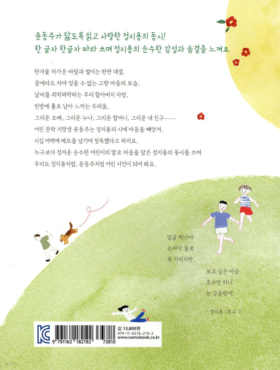 짝꿍시가 잘 떠오르지 않으면 그냥 정지용 동시를 따라 써도 좋아요. 그것만으로도 정지용의 동심 속으로 가까이 다가가는 경험을 할 수 있지요. 여러분이 정지용 동시를 보며 무슨 생각을 할지, 시인과 어떤 대화를 나누게 될지 궁금하군요. 이 책을 읽고 짝꿍시를 쓰는 동안 마음속의 꿈과 감성도 함께 쑥쑥 자랄 거예요
