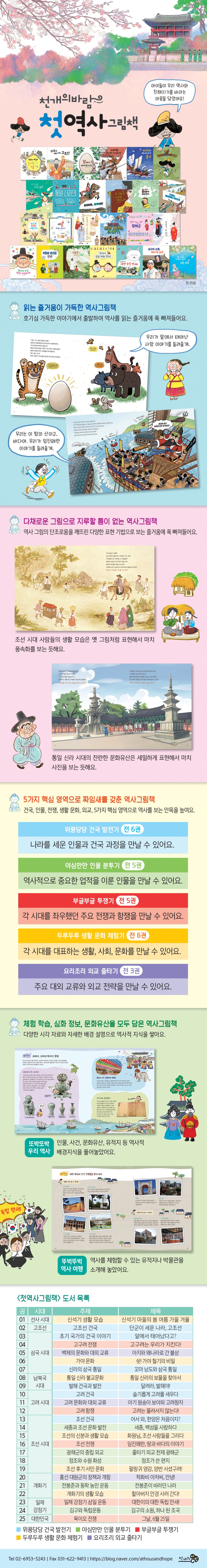 하일식 (연세대학교 사학과 교수) 읽는 즐거움이 가득한 역사그림책 [첫역사그림책]은 호기심을 불러일으키는 상상력에서 이야기가 출발해요. ‘그때 그 시절에 이런 사람이 있지 않았을까?’ 하는 상상에서 가상의 주인공을 창조하여 역사 이야기를 꾸몄어요. 역사적 사건을 가장 재미있고 친근하게 전달하기 위해 이야기를 들려주는 화자를 다양하게 설정했어요. 역사적 인물, 가상의 인물, 동물, 땅, 불상, 척화비 등과 같은 무생물 들이 이야기의 화자로 등장하지요. 어린 친구들이 이야기를 읽는 즐거움에 푹 빠져들 수 있어요. 다채로운 그림으로 만나는 역사그림책 [첫역사그림책]은 역사책에 실리는 그림의 단조로움을 깨뜨리는 데 집중했어요. 다양한 표현 기법을 도입하여 각 권의 특성을 살려 다채롭게 그려냈지요. 사진을 보는 듯한 세밀한 그림, 낄낄 깔깔 만화풍의 그림, 풍속화와 같은 옛 그림, 애니메이션을 보는 듯한 그림, 힘 있고 따뜻한 수채화 그림, 깔끔한 도식화 같은 그림 등을 만나다 보면 지루할 틈이 없어요. 역사를 처음 접하는 어린 친구들에게 친숙한 그림이 먼저 말을 걸어 준답니다. 한국사를 아우르는 5가지 핵심 영역으로 만나는 역사그림책 한국사 통사를 ‘건국, 인물, 전쟁, 생활 문화, 외교’, 5가지 핵심 영역으로 구성하여 역사적 관점을 기르는 데 필요한 짜임새를 갖췄어요. '위풍당당 건국 발전기', '야심만만 인물 분투기', '부글부글 투쟁기', '두루두루 생활 문화 체험기', '요리조리 외교 줄타기', 총 5가지 핵심 영역으로 한국사 통사를 훑어볼 수 있어요. 역사를 어떤 시각으로 바라보고 접근해야 하는지를 처음 배우는 어린 친구들에게 쉽게 다가갈 수 있는 구성이지요. 핵심 영역으로 구성된 이야기를 읽으면서 다양한 시각을 기를 수 있답니다. 체험학습, 심화 정보, 문화유산을 모두 담은 역사그림책 부록 ‘뚜벅뚜벅 역사 여행’에서는 가족이 함께 역사를 체험할 수 있는 유적지나 박물관 등을 사진 자료와 함께 소개했어요. 역사 체험 학습을 준비하거나 가상의 역사 체험을 진행하는 어린 친구들에게 효과적인 학습의 장이 되어 줄 수 있지요. 부록 ‘또박또박 우리 역사’에서는 꼭 다루어야 하는 인물, 사건, 문화유산, 유적 등 역사적 배경지식을 풀어서 설명해 놓았어요. 어려운 단어는 쉽게 풀었을 뿐만 아니라, 사진 자료를 통해 배경 이해를 돕고 있지요. |