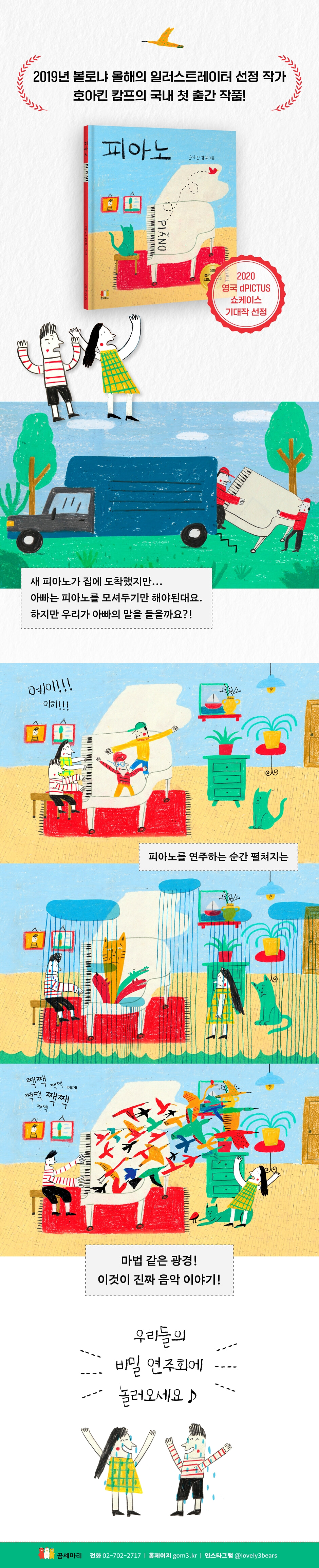 동기부여가 저절로! ★ 2019 볼로냐 올해의 일러스트레이터 선정 ★ ★ 2020 영국 디픽투스(dPICTUS) 쇼케이스 기대작 선정 ★ 피아노와 친구가 되는 순간, 눈앞에 상상의 세계가 펼쳐져요 부모님들은 우리 아이가 공부는 물론 피아노 연주도 잘했으면 좋겠다는 마음으로 피아노 학원에 보냅니다. 그런데 아이들은 피아노보다는 친구들과 더 놀고 싶어 하죠. 아이들은 왜 피아노에 흥미를 잃어버리게 되는 걸까요? 이 책을 통해 우리는 아이들의 속마음을 엿볼 수 있습니다. 새 피아노가 집에 온 날, 아빠는 아이들에게 피아노를 만지지 말라고 말합니다. 하지만 아이들은 아빠 몰래 피아노를 가지고 놀기 시작하죠. 피아노 건반을 눌러 보며 아이들은 작은 새들, 무서운 괴물들, 우스꽝스러운 춤을 추는 사람들을 풍부하게 상상해 내며 즐거워합니다. 이뿐만 아니라, 피아노가 만들어 내는 음악 속에서 아빠 몰래 피아노를 칠 때의 긴장과 설렘, 친구들과 함께 시간을 보낼 때 느끼는 기쁨과 환희뿐만 아니라, 마음속 깊이 꾹 눌러두었던 짜증과 화 그리고 울컥 올라오는 슬픔까지… 다양한 감정을 느끼고 또 표현하게 되지요. 무엇이든 잘하는 아이의 비결,스스로 즐거움을 찾는 힘 이 책 속 아이들에게 피아노는 열심히 배워야 하는 것, 반복 연습해서 잘 해내야만 하는 것이 아닙니다. 상상력을 자극하는 신나는 놀잇감이죠. 피아노와 함께 시간을 보내며 즐거움을 경험한 아이는 스스로 피아노를 열심히 배우려고 합니다. 그리고 이렇게 동기 부여하는 법을 터득한 아이들은 무엇이든 잘하는 사람으로 성장하게 됩니다. 책 속에 있는 QR코드를 찍어 보세요. 『피아노』만을 위해 작곡된 멜로디가 살아 움직일 거예요. 아이와 함께 ‘움직이는 그림책’을 보며, 장면마다 아름답게 변주되는 음악에 흠뻑 빠져 보세요. 아이도 부모도 당장 피아노를 연주하고 싶은 생각이 저절로 들 거예요. 전 세계 그림책 출판사의 기대를 모은, 호아킨 캄프의 국내 첫 출간작! 세계 최고의 그림책 전문 출판사들이 모인 플랫폼 디픽투스(dPICTUS)의 기대작으로 선정된 『피아노』는 호아킨 캄프의 한국 첫 출간 작품입니다. 호아킨 캄프는 ‘2019 볼로냐 올해의 일러스트레이터’로 선정되기도 했죠. 개성 있는 그림 스타일과 흡인력 있는 스토리로 현재 미국, 영국, 캐나다, 스페인, 아르헨티나 등 다양한 국가의 출판사와 계약을 맺은 떠오르는 작가이기도 합니다. 작가는 정성스럽게 연주해 한 편의 음악을 완성하듯, 그림과 글 모두에 정성을 담아 이 책을 완성했다고 해요. 『피아노』와 함께 시간을 보내며 저마다의 즐거움을 찾아가기를 바랍니다. |