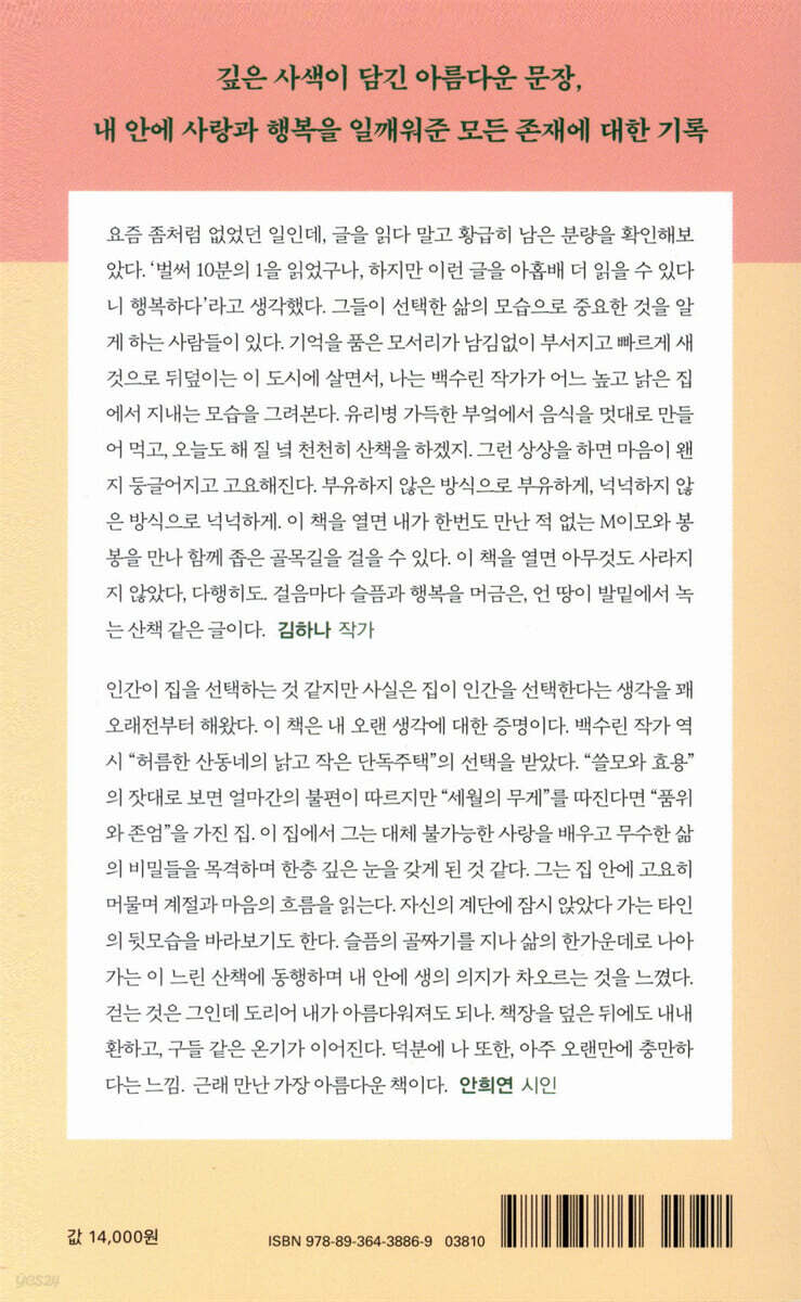 인간이 집을 선택하는 것 같지만 사실은 집이 인간을 선택한다는 생각을 꽤 오래전부터 해왔다. 이 책은 내 오랜 생각에 대한 증명이다. 백수린 작가 역시 “허름한 산동네의 낡고 작은 단독주택”의 선택을 받았다. “쓸모와 효용”의 잣대로 보면 얼마간의 불편이 따르지만 “세월의 무게”를 따진다면 “품위와 존엄”을 가진 집. 이 집에서 그는 대체 불가능한 사랑을 배우고 무수한 삶의 비밀들을 목격하며 한층 깊은 눈을 갖게 된 것 같다. 그는 집 안에 고요히 머물며 계절과 마음의 흐름을 읽는다. 자신의 계단에 잠시 앉았다 가는 타인의 뒷모습을 바라보기도 한다. 슬픔의 골짜기를 지나 삶의 한가운데로 나아가는 이 느린 산책에 동행하며 내 안에 생의 의지가 차오르는 것을 느꼈다. 걷는 것은 그인데 도리어 내가 아름다워져도 되나. 책장을 덮은 뒤에도 내내 환하고, 구들 같은 온기가 이어진다. 덕분에 나 또한, 아주 오랜만에 충만하다는 느낌. 근래 만난 가장 아름다운 책이다. - 안희연 (시인)