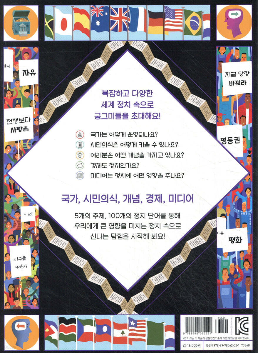 『열두 살 궁그미를 위한 인문교양』의 첫 번째 책은 『정치』입니다. “우리가 숨을 쉬는 것도 정치”라는 말을 들어봤을 겁니다. 정치는 우리 삶의 가장 가까이에서 영향을 주는 것으로, 세상이 어떻게 움직이는지 알기 위해서는 정치를 알아야 합니다. 사회의 변화를 추구하기 위해서도, 전통적인 것을 유지하기 위해서도 정치를 알아야 하지요. 『정치』에는 주요한 정치 용어 100개를 다섯 가지 주제어로 나누어 소개했습니다. 한눈에 들어오는 이미지와 유머러스한 일러스트레이션이 정치를 더욱 쉽게 이해할 수 있도록 돕고 있습니다. 정치가 내 삶에 영향을 미친다고? 국가, 시민의식, 개념, 경제, 미디어 등 정치의 기초 개념 완벽 정복! 『정치』에서는 다섯 가지 흥미진진한 주제를 다루고 있습니다. 첫째, ‘국가’에서는 나라를 운영하고 통치하는 일을 설명하는 단어들을 설명합니다. 둘째, ‘시민의식’에서는 사회 구성원으로서 갖춰야 할 개인의 역할에 관한 단어들을 설명하고요. 셋째, ‘개념’에서는 우리가 사는 방식에 영향을 미치는 생각들에 관한 단어들을 설명하지요. 넷째, ‘경제’에서는 살아가는 데 필요한 자원과 서비스를 생산하고 소비하는 활동에 관한 단어들을 설명해요. 다섯째, ‘미디어’에서는 세상일에 대한 정보를 주고받는 활동에 관한 단어들을 설명한답니다. 모호하고 개념이 잘 잡히지 않는 정치를 안다는 것은 쉬운 일이 아닐 거예요. 그러나 5개의 주제로 개념부터 접근하는 이 책은 복잡하고 다양한 세계 정치를 이해하는 데 좋은 길잡이가 되어 줄 것입니다. 국가는 어떻게 운영되는지, 어떻게 하면 시민의식을 키울 수 있는지, 우리가 살아가는 데 영향을 미치는 개념들은 무엇인지, 경제와 미디어가 영향을 미치는 세상을 어떻게 이해할 수 있는지 우리 궁그미들이 성장하면서 끊임없이 가질 궁금증들을 명쾌하게 배울 수 있답니다. |
