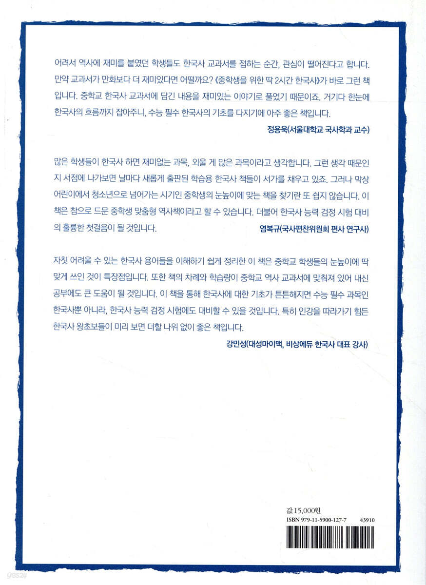 수능 필수 한국사의 기초를 잡아준다, 흐름 잡는 딱 2시간! 어려서는 역사에 재미를 붙였던 아이들도 이상하게 한국사 교과서만 접하면 그 관심이 바닥을 칩니다. 왜냐? 재미가 없으니 그렇습니다. 자고로 교과서 재미있다는 말은 들어본 역사가 없으니 아이들이 재미를 붙일 재간이 없습니다. 그런데 만약 교과서가 만화보다 더 재미있다면? 한번 잡으면 놓을 수 없을 만큼 흥미진진하다면? 수능 한국사도 술술, 내 나라 역사에 대한 이해도 술술! 그야말로 일석이조 아닙니까? 길게 붙들어 둘 생각 없습니다. 딱 2시간이면 끝납니다. 그것도 아주 드라마틱한 즐거움까지 선사하면서 빠져들게 만드는 마법 같은 능력! 그게 바로 뜨는 선생 ‘구쌤’의 맛있는 강의, 그 핵심입니다. 왜 ‘딱 2시간 한국사’냐고? 2 한국사 인강 듣기 전에 우선 이 책부터, 초보들을 위한 딱 2시간! 인강은 수능 대비의 핵심 과정입니다. 하지만 틀어놓고 있다고 다 공부가 될까요? 기초가 잡혀 있어야 강의 내용을 따라잡을 수 있는 법입니다. 한국사의 흐름을 어느 정도 파악하고 있어야 인강의 효과도 톡톡히 누릴 수 있습니다. 알파벳을 모르고는 영어 공부가 되지 않는 것과 같은 맥락입니다. 책의 차례와 학습량이 중학교 역사 교과서와 딱 맞춰져 있어 내신 잡고, 수능도 잡고! 게다가 한국사 능력 검정 시험으로 스펙 쌓기 위한 교재로도 제격입니다. 중학생을 위한 눈높이 맞춤 교육으로는 구쌤의 강의를 따라잡을 것이 없습니다. 구쌤에게 맡기시죠. 인강 들어가기 전에 기초라면 구쌤이 다 닦아줄 테니까요. 왜 ‘딱 2시간 한국사’냐고? 3 엄마가 먼저 읽고 아이 앞에서 기 세우기, 애어른 할 것 없이 딱 2시간! 수능 한국사, 한국사 능력 검정 시험, 운운하지만 사실 어른들도 역사는 잘 모릅니다. 학교 때 줄줄 외워가며 만점만 받았대도 다 잊은 지 오래입니다. 게다가 아빠에 비해 상대적으로 역사에 약한 엄마들은 두말 할 나위가 없을 것입니다. 눈치 빠른 요즘 아이들은 아는 게 늘어나면 엄마아빠 실력도 살살 테스트합니다. 아는 걸 함께 공유하고 싶은 욕구가 발현되는 까닭이기도 합니다. 그렇다면? 아이 주려고 사서 엄마가 먼저 읽고 기 세우기에도 이보다 훌륭한 지침서가 없습니다. 애어른 할 것 없이 2시간이면 한국사의 흐름이 머릿속에 딱 그려지기 때문입니다. 한국사 분야별 권위자들의 평가만 보고도 그 특장점이 딱 잡히는 책! 중학생 아이라면, 중학생 아이를 둔 엄마라면… 딱 2시간만 구쌤과 함께 ‘한국사 흐름 잡기’에 도전해 보십시오. “수능 필수 한국사의 기초를 잡아주는 책” 정용욱(서울대학교 국사학과 교수) “한국사 능력 검정 시험 대비의 첫걸음” 염복규(국사편찬위원회 편사 연구사) “한국사 왕초보가 인강 듣기 전에 봐야 할 책” 강민성(대성마이맥, 비상에듀 한국사 대표 강사) |