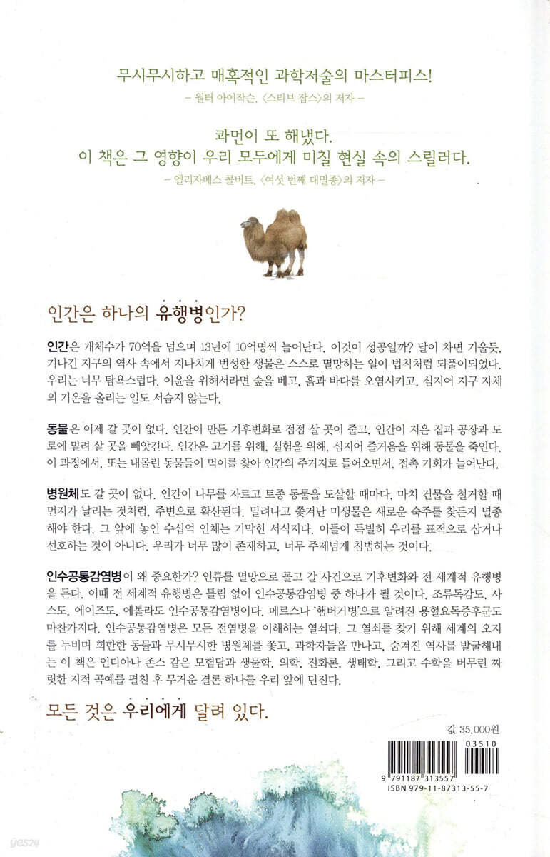왜 듣도 보도 못한 새로운 질병들이 특정한 시점에, 특정한 장소에서, 특정한 방식으로 나타날까? 왜 다른 곳에서, 다른 방식으로, 다른 시점에 나타나지 않을까? 이런 병들은 과거보다 더 자주 나타나는가? 우리는 어쩌다 이런 병들을 끌어낸 것일까? 또 다른 무시무시한 전 세계적 유행병을 겪기 전에 이런 경향을 바꾸거나 최소화할 수 있을까? 이 행성에서 함께 살아가는 다른 모든 감염된 동물종에게 무서운 해악을 끼치지 않고 그렇게 할 수 있을까? 동물이 없다면 인수공통감염병도 없다. 그러나 다시 강조하건대 동물이 없다면 지구는 더 이상 살아 있는 별이 아니다.