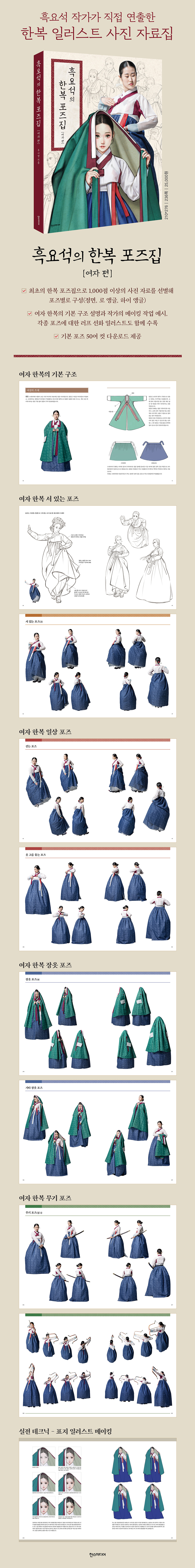 『흑요석의 한복 포즈집』에 대하여 : 한복 의상에 대하여 | 부록 사진 자료 다운로드 안내 서장 - 여자 한복의 기본 구조 여자 한복의 기본 구조 | 여성의 쓰개 | 저고리와 치마의 구조 | 여성 속곳의 종류 | 저고리 그릴 때의 주의점 | 치마 그릴 때의 주의점 | 여성의 머리 모양과 머리 치레 1장 - 여자 한복 서 있는 포즈 2장 - 여자 한복 일상 포즈 걷는 포즈 | 오르는 포즈 | 내리는 포즈 | 뛰는 포즈 | 뒤돌아보는 포즈 | 부채를 든 포즈 | 옷고름 묶는 포즈 | 앉은 포즈 | 절하는 포즈 | 앉아서 비녀 꽂는 포즈 | 앉아서 부채 든 포즈 | 앉아서 차 마시는 포즈 | 편하게 다리 뻗고 앉은 포즈 | 쓰러져 애원하는 포즈 | 쓰러진 포즈 | 엎드려 턱 괴고 생각하는 포즈 | 반듯이 누운 포즈 3장 - 여자 한복 장옷 포즈 장옷 포즈 | 장옷 앉은 포즈 | 기타 장옷 포즈 4장 - 여자 한복 무기 포즈 무기 포즈(활) | 무기 포즈(검) | 기타 무기 포즈 5장 - 실전 테크닉 - 표지 일러스트 메이킹 저자 프로필 |