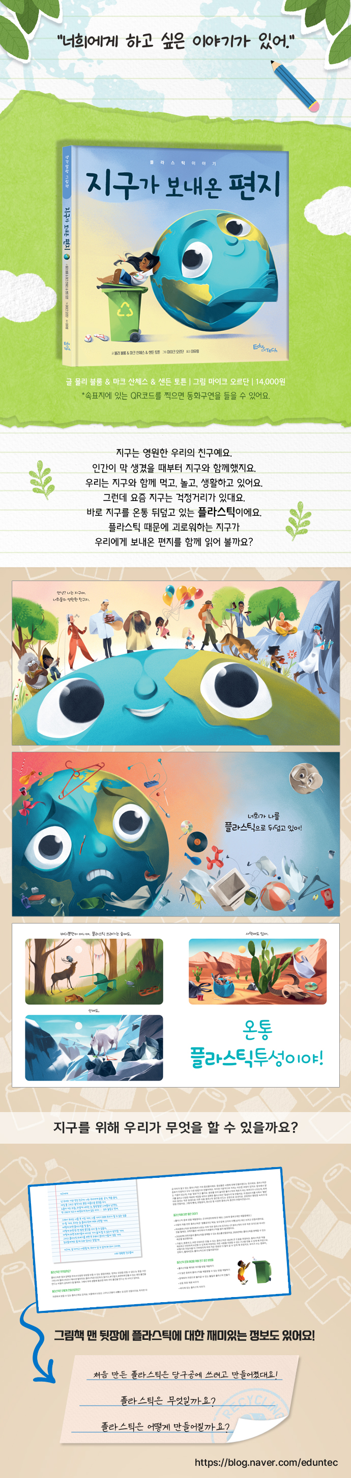플라스틱은 가볍고, 튼튼하고 어떤 모양으로든 만들 수 있어서 편리하게 쓸 수 있는 물질이에요. 과학자들이 플라스틱을 개발하고 나서, 플라스틱은 우리 생활 모든 곳에서 활용되고 있지요. 이렇게 유용한 플라스틱은 치명적인 문제가 하나 있어요. 바로 자연 속에서 스스로 사라지지 않는다는 거예요. 『지구가 보내온 편지』에서는 플라스틱이 우리에게 어떤 편리함을 가져다줬는지 알려 주는 한편, 사라지지 않는 플라스틱이 지구에 어떤 영향을 주는지 이야기하고 있어요. 책 뒤쪽에 플라스틱이 무엇인지, 플라스틱 문제를 해결하기 위한 우리의 다짐과 할 일을 자세하게 풀어 주는 부록이 있어 아이들도 플라스틱에 대해 쉽게 이해할 수 있어요. 지구 환경 문제에 공감하고 실천할 수 있는 일을 찾아요 『지구가 보내온 편지』는 지구를 의인화하여, 지구가 보낸 편지를 읽는 기분을 느낄 수 있는 그림책이에요. 또한, 환경을 지키기 위해 아이들이 쉽게 실천할 수 있는 방법을 제시하고, 격려하면서 아이들이 생활 속에서 환경을 생각할 수 있게 하지요. 환경 문제를 막연하게 생각했던 아이들이 그림책을 읽고 나면 지구에게 친근함을 느끼고, 지구 환경 문제에 공감할 거예요. 그리고 할 수 있는 일을 하나하나 실천해 나갈 거예요. |