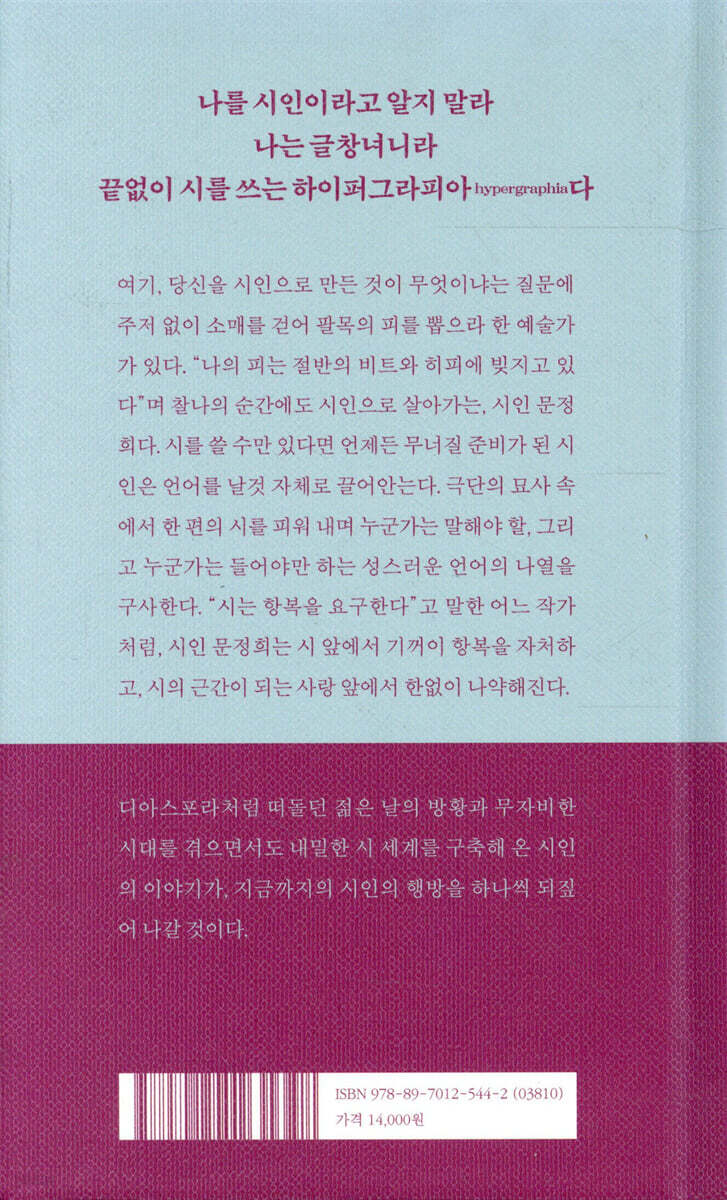 --- p.12 나는 툭하면 짐을 싸고 어디론가 떠나기를 좋아한다. 나는 집시요, 유목민을 꿈꾼다. 무엇보다 떠돌이를 사랑한다. 장소와 공간에서의 떠돌이만을 의미하는 것은 아니다. 시인으로서 내가 마셔야 할 유일한 음식은 고독이요, 유일한 공기는 자유라고 말한다. --- p.28 가끔 연애하는 시인? 시인은 모국어를 떠나서도 살 수 없고, 사랑과 자유를 떠나서도 살 수 없는 영원한 유랑의 존재임에 틀림없다. --- p.59 첫사랑이든 짝사랑이든 다시 한번 운명을 건 절절한 사랑을 할 수 있다면 참 좋겠다. 나에게는 온몸으로 뛰어들어 온 생애를 불같이 태우는 그런 치명적인 사랑을 못 한 열등감이 있다. --- p.93 나는 그것을 시로 썼다. 「초대받은 시인」은 그렇게 태어났다. 고상한 체, 잘난 체하는 속물, 유치한 스나브 시인을 있는 그대로 폭로하고 묘사한 것이다. …… 이 시에서 특히 눈에 띄는 시어는 ‘글창녀’다. 이런 극단의 표현 속에서 단순히 웃음으로 넘길 수만은 없는 나의 시대 의식과 아이러니, 고뇌가 숨어 있다고 변명하고 싶다. 우리는 그런 시대를 거쳐 왔다. --- p.110 모든 예술가에게는 창조의 영감을 가져다준 뮤즈가 있다. 보통 뮤즈는 사랑과 매혹의 대상이며 예술가의 생애에 절대적인 영향을 끼치는 존재다. 특히 시인에게 있어 사랑의 존재는 그 자체가 시가 되고, 눈동자가 되고, 광기가 된다. 불멸의 노래가 돼 사람들의 가슴에 보석처럼 남아 영원히 빛난다. --- p.114 아마도 내 피의 절반은 비트와 히피에 빚지고 있을 것이다. 그리고 내 문학의 상당 부분은 노마드적 체험과 상상력의 소산일 것이다. --- p.162 “시는 선택받은 자들의 빵이자 저주받은 양식”이라 말한 사람은 옥타비오 파스였다. 그렇다. 시라는 저주받은 양식에 나는 저주받았다. 나는 끝없이 시를 쓰는 하이퍼그라피아hypergraphia다. --- p.187 나에게 사랑과 고통과 상처를 준 나의 삶이여, 뮤즈들이여. 네가 준 절망, 네가 준 죄의식, 네가 준 사랑에 감사한다. 네 피를 찍어 나는 시를 썼노라! --- p.222 |