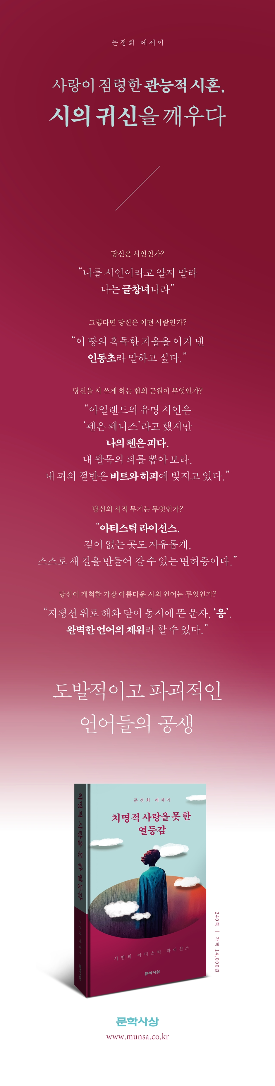 모든 시인은 ‘시적허용’을 뜻하는 아티스틱 라이선스artistic license를 가진다. 시인은 시가 부르는 곳, 펜이 이끄는 곳이라면 망설이지 않고 질주한다. 시인은 그저 쓰면 된다. 시로 목소리를 내고, 시로 사랑을 말하고, 시로 자유를 갈구하는 것만이 시인의 업, 즉 카르마이기 때문이다. 문정희 시인은 여러 종류의 사랑이 낳고 기른 시혼을 깨워 시와 에세이로 풀어썼다. 비록 언어도단의 막막함을 실감하고, 단단한 시 세계가 흔들리는 한계에 부딪칠 때도 있겠으나, 시인은 멈추지 않는다. 누군가 시인의 앞을 가로막는다면, 시인은 핸들을 꺾는 대신 아티스틱 라이선스를 꺼내 흔들어 보일 것이다. 시인으로서의 자격이 아닌, 시의 가치를 존중받는 것. 그것이 바로 이 시대의 모든 시인에게 부여된 아티스틱 라이선스다. 예술가들과 함께한 노마드적 체험 『치명적 사랑을 못 한 열등감』은 총 3부로 구성되어 있다. 시인에게 시적 영감을 준 예술가, 즉 뮤즈들과의 노마드nomad적 체험을 3개의 테마로 나눠 펼친다. 1부는 세계적 명작을 탄생시킨 예술가들에게서 받은 영감을 시인의 세계로 끌어들이는 과정에 주목한다. 문정희 시인은 보리스 파스테르나크, 예세닌과 이사도라 덩컨, 조지프 브로드스키 등 한 세대의 신드롬을 일으키고 트렌드를 선도한 거장들의 발자취를 좇는다. 그들의 흔적이 고스란히 묻은 도시, 거리, 집을 찾아가 그들의 작품 세계를 골몰하고, 시적 소재가 될 오브제를 가져왔다. 바로 그 오브제가 시에 차용되어, 때론 처절하고 때론 기쁨에 찬 시대의 희극과 비극을 정의한다. 2부는 한국문학으로 시대를 풍미하고 한국 문단의 주축이 된 스승들에게서 받은 영감을 고백한다. 삶을 대하는 진실한 태도를 온몸으로 보여 준 지식인, 부당한 권력에 맞서 투쟁한 시인 김지하, 시 산맥의 절정 미당 서정주 등. 문학이 나아갈 올곧은 길을 개척한 스승들과의 이야기로 이루어져 있다. 특히 김지하 시인은 문정희를 ‘시 귀신’이라 부르며 시인의 시정신을 찬미했고, 서정주 시인은 문정희의 첫 시집 『꽃숨』의 제목을 지어 주기도 했다. 이들의 열정을 이어받은 문정희 역시 현재 많은 문인들의 선배로서, 스승으로서 한국문학의 밝은 미래를 천착하고 있다. 3부는 시인과 어깨를 나란히 한 동료들, 이 나라의 빼어난 여성 시인들의 작품을 소개하고 작품에 내포된 의미를 되짚는다. 엄혹한 시대와 사회적 제도 탓에 소외될 수밖에 없었던 여성 시인들의 작품을 소개하면서, 시대를 거슬러 올라가 조선시대 기녀들의 작품을 해체하기까지 이른다. 성에 국한되어 빛을 보지 못한 작품들의 ‘텍스트’를 파헤치며, 텍스트 자체가 내포하는 ‘인간의 보편적 감성’을 다룬다. 여성으로서, 여성이기에 같은 수식으로 설명할 필요 없는 세상을 간절히 바라며, 작품과 시인이 동등한 자격으로 설 수 있는 미래를 꿈꾸면서 말이다. 『치명적 사랑을 못 한 열등감』은 이렇듯 시를 사랑하고 한국문학사를 이어 나가려는 문정희 시인의 오랜 연구가 스며들어 있다. 도발적이고 파괴적인 언어들의 공생 문정희의 시를 보면 다소 파멸적이고 치기 어린 시어들이 눈에 띈다. 특히 ‘글창녀’나 ‘매문’, ‘얼음 번개’, ‘하이퍼그라피아’ 등의 시어는 독자로 하여금 구체적 이미지를 연상시키기보다, 이질적이고 낯선 분위기를 느끼게 한다. 문정희의 시는 장면의 연쇄성보다 서사적 구성이 주를 이루기 때문인데, 그렇기에 단편적인 이미지에만 집중해서는 시의 메시지를 온전히 받아들일 수 없는 것이다. 거칠고 생경한 언어에 쉽게 다가가기 어려울지도 모르지만, 사실 그 속을 들여다보면 “온몸으로 뛰어들어 온 생애를 불같이 태우는 그런 치명적인 사랑을 못 한 열등감”의 의미를 알 수 있다. 사랑을 욕망하는 동시에 사랑하지 못한 부끄러움을 후회할 수 있다니. 과연 시어의 확장성을 이보다 더 다정하고 애틋하게 목격할 수 있을까. “나의 펜은 페니스가 아니다. 나의 펜은 피다”라는 시인의 말을 빌려, 도발적이고 파괴적인 언어가 공생하는 이유를 설명해 본다. 시인의 언어가 탄생시킨 또 다른 평행세계 ― 편집자의 말 문정희 시인의 에세이 『치명적 사랑을 못 한 열등감』은 2016년 문예중앙(현 중앙북스)에서 출간된 도서의 개정판이다. 이미 독자들에게 한 번 소개되었던 책이나, 신간으로 새롭게 선보이는 만큼 책의 구성과 흐름을 달리했다. 이 책의 가장 큰 특징은 여러 에세이와 시가 묶여 하나의 작품으로 완성되는 것이다. 독자는 에세이를 읽은 다음 시를 감상함으로써, 비로소 이야기의 마침표를 찍고 흩어진 상념을 그러모을 수 있다. 이를 효과적으로 나타내기 위해, 책은 시집처럼 좁고 긴 모습이다. 에세이는 시처럼, 시는 에세이처럼 자연스럽게 이어져 독서의 호흡이 고를 수 있도록 고려했다. 또한, 수록된 에세이의 순서를 재배치하여 세 개의 테마로 나누었다. 앞서 언급했듯 1부는 예술계의 거장들로부터 받은 영감, 2부는 시인의 스승들로부터 받은 영감, 3부는 시인 자신과 이 땅의 여성들로부터 받은 영감으로 이뤄진다. 무엇보다 시인의 시 세계를 내밀하게 파고들고자, 응축된 