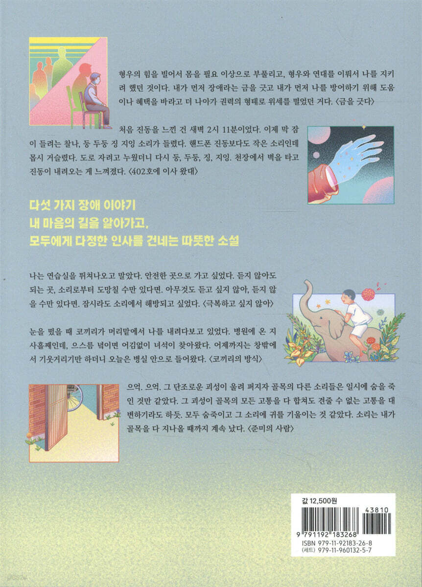 금을 긋다_박하령 교통사고로 장애인이 된 해인이는 삶을 포기하고 싶은 마음인데 “네 눈치 안 보고 나도 좀 살자!”는 누나의 공격에 살고 싶은 오기가 생겼다. 휠체어를 타고 학교생활을 하는데 도움을 받아야 하는 상황이 오고, 기꺼이 자신을 돕겠다는 친하지 않았던 형우. 형우의 도움을 받는 해인이는 형우가 고마우면서도 점점 불편해진다. 어느새 장애를 빌미로 역차별을 하는 꼴이 되어 버린 해인이는 불편한 마음과 잘못 꿰어진 듯한 형우와의 관계를 정리하려고 한다. 402호에 이사 왔대_문이소 율희는 402호에서 들려오는 소리에 잠을 이루지 못한다. 결국 항의하러 갔다가 ‘미확인 지적생명체 신체기능 탐구’ 체험학습을 위해서 지구에 왔다는 이상한 정체의 말을 믿고 만다. 사실은 (외)계인이가 건네는 금덩어리가 탐이 났다. 시급 3만원을 조건으로 휠체어를 탄 계인이를 데리고 홍대를 한번 갔다 온 율희는 힘이 다 빠져버렸다. 지구인 신체 착용감과 지구 사회 체험서를 제출해야 한다는 계인이는 과연 뭐라고 쓸까? 극복하고 싶지 않아_황유미 지형이는 청각장애를 극복하고 무대에 서는 장면을 찍고 싶다는 예능 PD의 제안을 입시 때문에 거절하지 못했다. 가사만 써서 주다가 힙합 동아리 아이들과 호흡을 맞춰 공연을 준비해야 하는데 의사소통이 쉽지 않다. 아이들의 눈치를 보다가 매번 박자를 놓치고, 그 자리에 있기가 힘든 지형이는 동아리실을 도망쳐 나온다. 지형이는 동아리 아이들과 잘 화해하고 공연도 잘 마칠 수 있을까? 코끼리의 방식_김혜정 병원과 집에서만 생활하는 나의 즐거움은 이야기와 상상이다. 삶의 시간이 얼마 남지 않았다는 것을 직감할 즈음 코끼리 한 마리가 다가와 지금 하고 싶은 것들을 할 수 있게 도와주고, 꿈도 꾸지 못했던 것을 도전하도록 도와준다. 몸은 자유롭지 못해도 마음과 정신으로 자유로움을 누리며 건조한 삶을 환희의 삶으로 만드는 나와 코끼리. 나는 상상의 코끼리와 소통하며 죽음을 자연스럽게 맞이한다. 준미의 사람_박영란 사고로 식물인간이 되어 버린 준미와 준미를 책임지는 준미네 식구들. 옆집 여자는 책을 좋아하는 준미에게 참고서, 교과서, 소설 등을 읽어 주며 준미와 시간을 보낸다. 그러다 준미의 소식이 외부에 알려지고 자원봉사자들이 찾아들면서 준미 엄마는 자존심이 짓밟힌다. 옆집 여자의 책 읽기도 거부하고 도망치듯 이사를 가 버린 준미네. 시간이 흐른 후, 나는 불쑥 준미와 옆집 여자를 떠올린다. 이사를 가는 준미가 마지막까지 꼭 껴안고 있었던 건 한 권이 책이 아니라 사람이지 않았을까? |