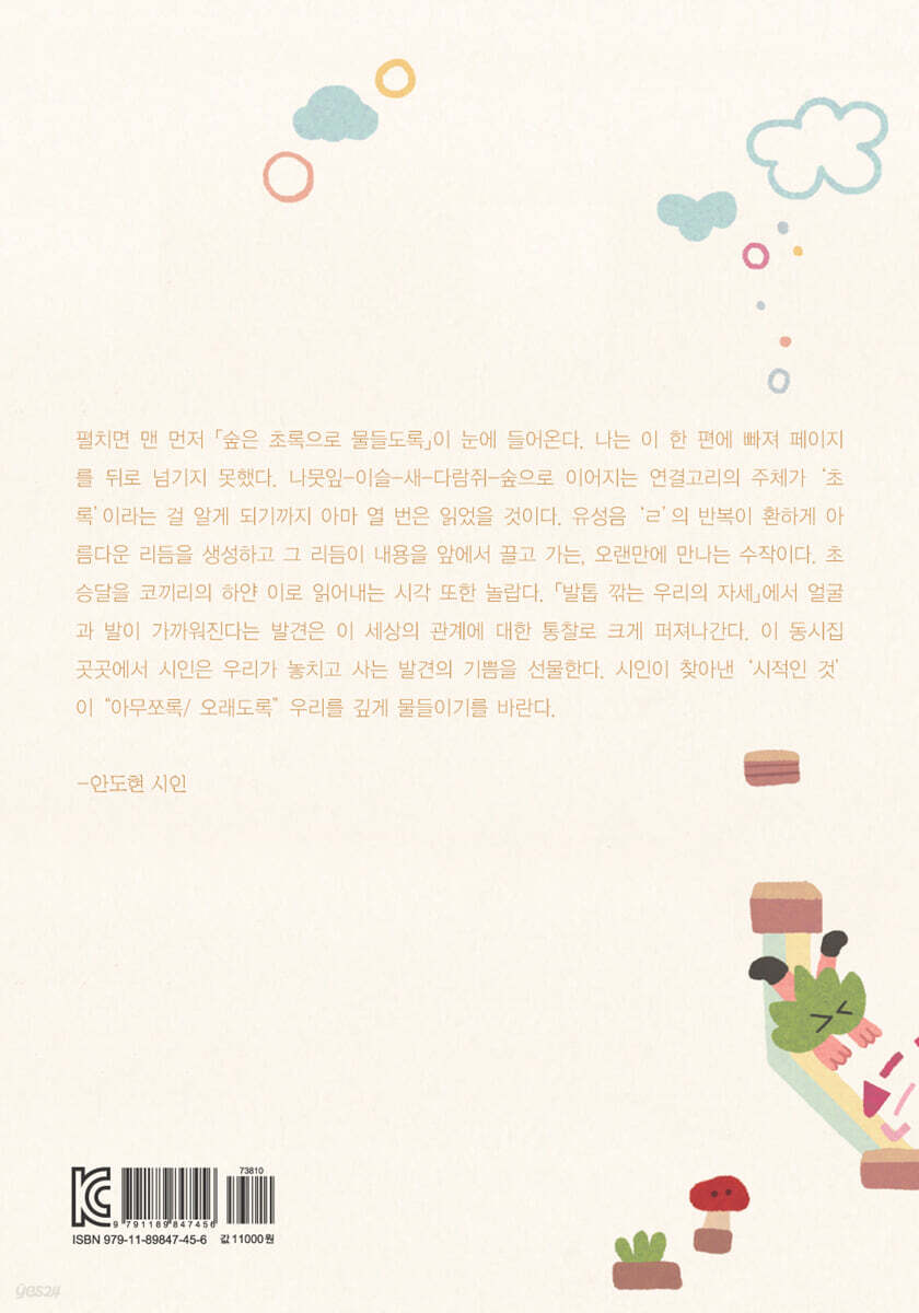 1부 별들의 이사 숲은 초록으로 물들도록 12 가을 13 담쟁이는 문제를 풀었을까요? 14 벌들의 이사 16 날개의 쓸모 18 무량수전 배흘림 기둥 20 수양버들 21 주산지에서 22 아는 척할 게 23 새 친구 새친구 24 호기심 26 초승달 28 2부 겨드랑이는 따뜻해 똑똑해야 하는 이유 30 뒤바뀌다 32 겨드랑이는 따뜻해 33 똑같은데 34 발톱을 깎는 우리의 자세 36 달팽이처럼 37 내가 살아남는 법 38 달 위로라는 건 말이야 40 두고 가세요 41 봄날 42 벌써 일 년이 지나버렸어 43 하루살이 44 훔치다 46 3부 너도 공이니? 내 이름은 0618 W39N94 48 지구는 어떡하지? 50 그냥이 52 꽃밭에서 54 *주의사항* 55 묻다 56 너도 공이니? 58 등대의 말 60 새아기 62 알맞은 운동 64 은퇴 후의 삶 66 특별 68 접시꽃 피는 날 70 4부 토끼를 기다리는 이유 꽃바퀴 72 빗자루 73 도시락 74 노루궁뎅이 76 도토리 키재기 78 물수제비 80 바이킹 82 생일케이크 84 일곱 별 언덕 집 85 저한테 왜 그러세요? 86 호랑가시나무 88 토끼를 기다리는 이유守株待兎90 해설_담쟁이 넝쿨을 타고 올라온 시_임수현 |
