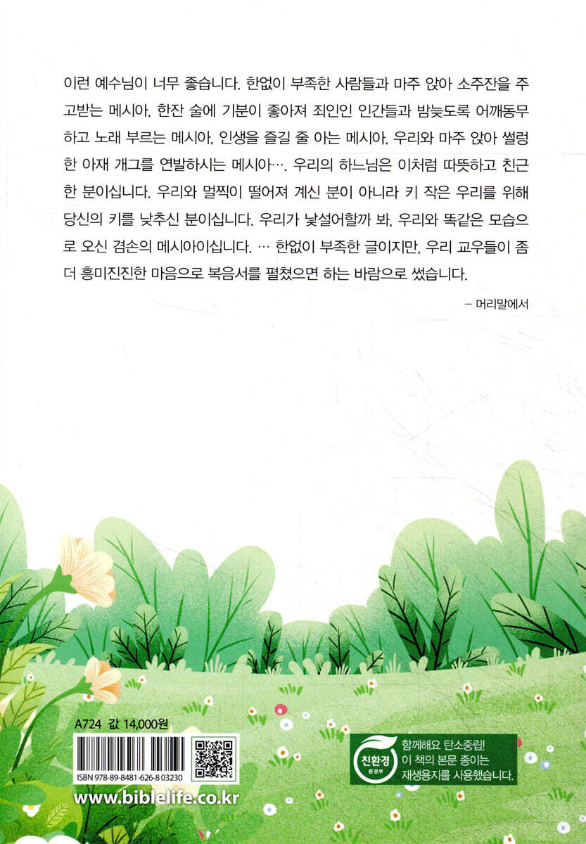 찬란한 봄날이 찾아왔다 … 12 자상하고 친절한 낚시 오빠 … 21 먹보요 술꾼인 친구 … 31 무한 리필 에너지 충전소 … 40 갈릴래아 호수 퐁당 사건 … 50 영혼의 집 리모델링 달인 … 59 칭찬의 달인 … 67 수제자 베드로가 받은 참교육 … 76 집 나간 둘째 아들은 언제 돌아온댜? … 85 예수님께선 다 계획이 있으셨구나! … 94 그분과 함께 꽃길만 걸으세요 … 103 나에게 오는 것을 막지 마라 … 112 낯 뜨거운 인사 청탁 사건 … 121 “여인이시여”에 담긴 진의 … 130 말귀 알아듣는 귀 … 139 하느님도 꼼짝 못한다? … 146 또 다른 착한 사마리아인 … 154 너와 나 사이의 다리 … 161 분노와 슬픔이 가득한 성전 정화 … 169 하늘을 움직이는 믿음 … 178 소년 예수님의 특별한 대답 … 185 진흙덩이 발 불덩이 손 … 193 안타까워하시는 예수님 … 201 손도 씻고 마음도 씻어야 … 208 |