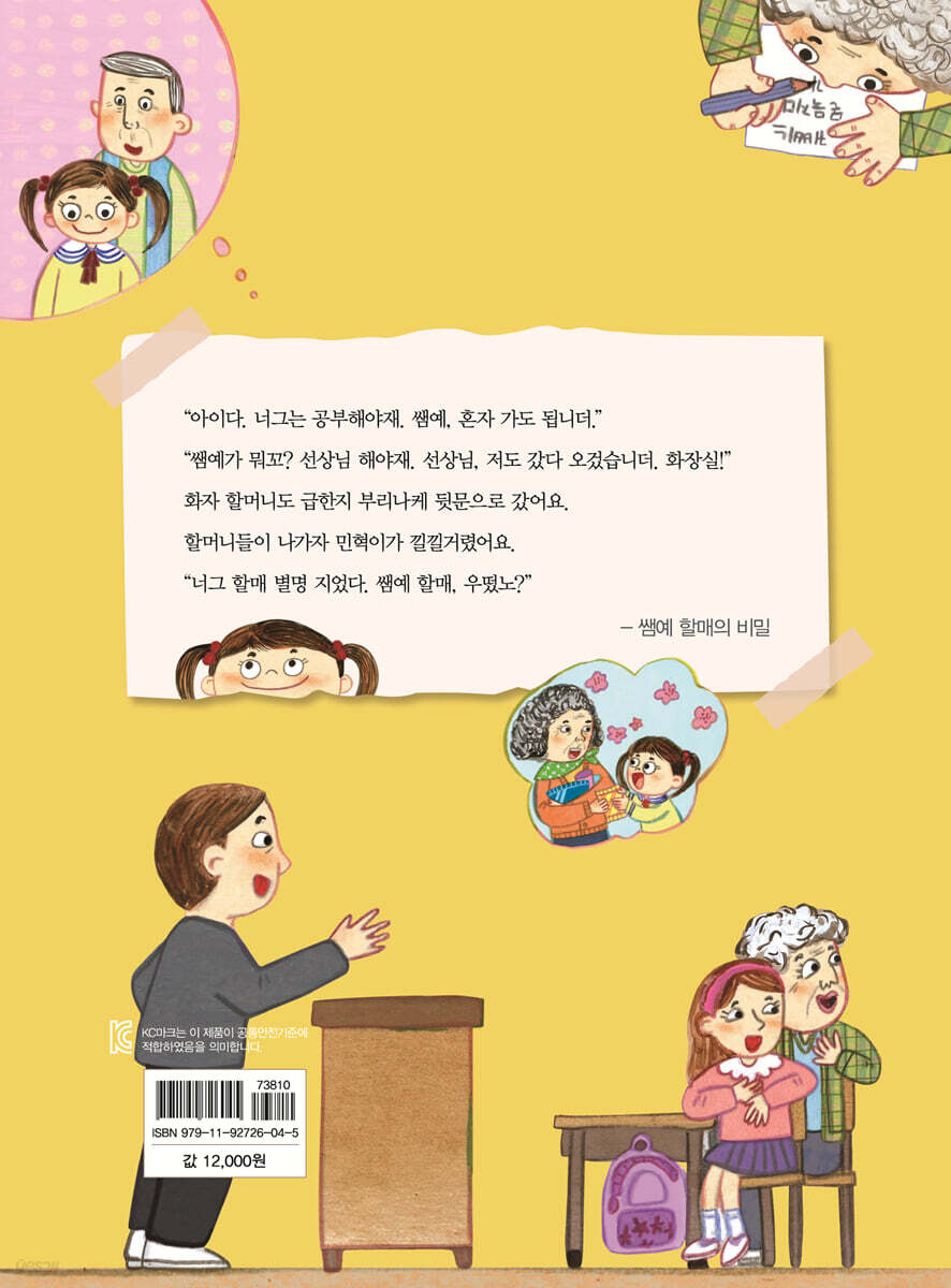 친구 같은 할머니를 응원하며 배우는 즐거운 학교생활과 꿈 동화구연가로 활동하는 정영혜 작가의 첫 번째 장편동화입니다. 이야기의 흐름을 더 생생하게 전해주는 김청희 작가의 그림이 더해져 ‘책 먹는 고래’ 제37권으로 나왔습니다. 주인공인 할머니의 좌충우돌 학교 이야기를 다룬 작품은 할머니와 손녀의 학교생활이 어우러지는 설정입니다. 설정부터 호기심을 유발하는 작품은 사건의 전개를 유쾌하게 이끌어 가면서 누구나 즐겁게 읽는 따뜻한 가족 동화로 그려냈습니다. 쌤예 할매가 학교에 다니며 부닥치는 일들은 어린이들 역시도 학교생활에서 똑같이 겪는 일이기도 합니다. 아이들에게 쌤예 할매의 학교생활 모습은 바로 자신이고 친구의 모습입니다. 아이들은 그런 할머니를 응원하며 친구, 선생님과 함께하는 학교생활의 지혜를 배웁니다. 또한 어려움도 씩씩하게 이겨내는 할머니를 통해 꿈을 향해 나아가는 도전과 용기도 배우게 됩니다. 비밀이 드러난 채 학교에 간 쌤예 할매의 학교생활 분투기 김순해 할머니에게는 한 가지 비밀이 있습니다. 그건 바로 초등학교에 다니지 못한 것입니다. 초등학교에 다니지 못해 글자도 모르고 셈도 서툽니다. 손녀가 글을 읽어달라고 하면 눈이 아프단 핑계를 대며 도망치는 게 일상입니다. 그러던 어느 날 인구 감소로 문을 닫는 초등학교가 늘어나자 노인들도 학교에 입학해 공부할 수 있게 됩니다. 초등학교에 다니지 못한 사실이 드러나는 걸 감수하고 할머니는 가족들의 응원에 힘입어 손녀 은애와 손을 잡고 초등학교에 입학하게 됩니다. 처음 가보는 학교에서 손자 손녀 같은 아이들과 어울리고, 자신과 비슷한 입장의 할머니들을 만나고, 또 담임 선생님이 생기면서 할머니의 좌충우돌 학교생활이 시작됩니다. |