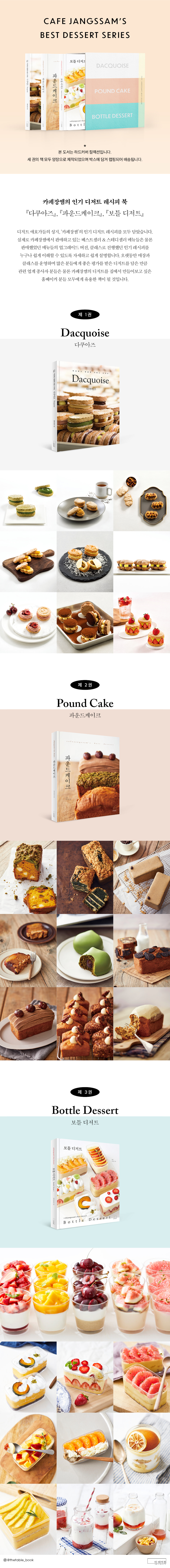 PROLOGUE 프랑스 정통 디저트, 다쿠아즈 이 책을 활용하는 법 CLASS 01. 준비하기 01. 필수 도구 02. 기본 재료 03. 오븐 사용법 04. 짤주머니 사용법 CLASS 02. 다쿠아즈 시트 만들기 01. 플레인시트 반죽 02-1. 틀을 이용한 반죽 성형 02-2. 유산지를 이용한 반죽 성형 03. 굽기 CLASS 03. 다쿠아즈 크림 만들기 01. 파타봄브 방식 크림 02. 앙글레즈 방식 크림 CLASS 04. 장쌤의 다쿠아즈 레시피 01. 진한 말차 다쿠아즈 02. 얼그레이 다쿠아즈 03. 바닐라 다쿠아즈 04. 진저레몬 다쿠아즈 05. 캐러멜헤이즐넛 다쿠아즈 06. 오레오까망베르 다쿠아즈 07. 망고치즈 다쿠아즈 08. 쑥인절미 다쿠아즈 09. 더블초콜릿 다쿠아즈 10. 군고구마 다쿠아즈 11. 시나몬단호박 다쿠아즈 12. 카페라테 다쿠아즈 13. 둘깨 다쿠아즈 14. 카야코코넛 다쿠아즈 15. 체리 다쿠아즈 16. 애플파이 다쿠아즈 17. 트리플베리 다쿠아즈 18. 민트초코 다쿠아즈 19. 아몬드크럼블 다쿠아즈 20. 티라미수 다쿠아즈 CLASS 05. 다쿠아즈 케이크 01. 오렌지쇼콜라 02. 피스타치오딸기 미니케이크 03. 래밍턴 04. 몽블랑 05. 당근케이크 SPECIAL CLASS. 다쿠아즈 더 맛있게 즐기기 최상의 맛을 위한 다쿠아즈 보관법 디저트 데코레이션을 위한 과일, 채소 건조법 안전한 보관을 위한 진공 밀폐법 망가진 다쿠아즈 시트 활용법 - Editor's Pick - 모양 틀 없이 시트를 만들 수 있는 패턴 제 2권. Pound Cake 파운드케이크 PREPARATION 01. 파운드케이크 알아보기 02. 재료와 도구 03. 틀 준비 04. 반죽 정리 05. 파운드케이크의 보관 Class 01. 3가지 기법으로 만드는 기본 파운드케이크 01-1. 슈거배터법(공립법) 01-2. 슈거배터법(별립법) 02. 플라워배터법 Class 02. 3가지 기법을 응용한 파운드케이크 03. 초코마블 파운드케이크 04. 단호박치즈 파운드케이크 05. 코코패션 파운드케이크 06. 쑥콩 파운드케이크 Class 03. 녹인 버터로 만드는 파운드케이크 07. 오렌지 파운드케이크 08. 에스프레소 파운드케이크 09. 무화과라벤더 파운드케이크 10. 레몬바질 파운드케이크 Class 04. 머랭으로 만드는 파운드케이크 11. 애플캐러멜 파운드케이크 12. 밤말차 파운드케이크 13. 피스타치오체리 파운드케이크 14. 오레오까망베르 파운드케이크 Class 05. 오일로 만드는 파운드케이크 15. 당근크림치즈 파운드케이크 16. 흑임자 파운드케이크 17. 올리브콘 파운드케이크 Class 06. 특별한 날의 파운드케이크 18. 부쉬드노엘 파운드케이크 19. 생과일 파운드케이크 20. 카시스몽블랑 파운드케이크 21. 호두 파운드케이크 22. 레드벨벳 파운드케이크 SPECIAL CLASS 01. 크럼블 - 녹차 크럼블 - 콩 크럼블 - 시나몬 크럼블 02. 글레이즈&아이싱 - 말차 글레이즈 - 커피초콜릿 글레이즈 - 체리 글레이즈 - 콩가루 글레이즈 - 라벤더 아이싱 - 레몬 아이싱 03. 캐러멜 호두 04. 머랭 쿠키 05. 깨 튀일 - 파운드케이크 Q&A 제 3권. Bottle Dessert보틀 디저트 BEFORE BAKING 베이킹을 시작하기 전에 이 책을 활용하는 법 보틀 케이크의 판매 이 책에서 사용한 틀 이 책에서 사용한 보틀 젤라틴의 이해 BOTTLE PUDDING 보틀 푸딩 Pudding 01. 호로록 우유 푸딩 - 기본 판나코타 Pudding 02. 호로록 우유 푸딩 - 딸기 Pudding 03. 호로록 우유 푸딩 - 망고 Pudding 04. 호로록 우유 푸딩 - 얼그레이 & 자몽 Pudding 05. 호로록 우유 푸딩 - 캐러멜 & 무화과 Pudding 06. 호로록 우유 푸딩 - 피스타치오 & 체리 * 호로록 우유 푸딩 판매 팁 BOTTLE CAKE 보틀 케이크 Cake 01. 순수 단호박 케이크 Cake 02. 프레지에 Cake 03. 과일 믹스 프레지에 Cake 04. 피스타치오 & 자몽 케이크 Cake 05. 복숭아 티라미수 Cake 06. 호지차 & 감귤 케이크 Cake 07. 흑임자 & 유자 케이크 Cake 08. 체리 & 쇼콜라 케이크 Cake 09. 레몬 마들렌 케이크 Cake 10. 고구마 케이크 Cake 11. 쑥 & 인절미 케이크 Cake 12. 밤 & 말차 몽블랑 Cake 13. 코코넛 & 망고 케이크 BOTTLE BEVERAGE 보틀 음료 Beverage 01. 딸기 우유 Beverage 02. 복숭아 우유 Beverage 03. 밀크티 |