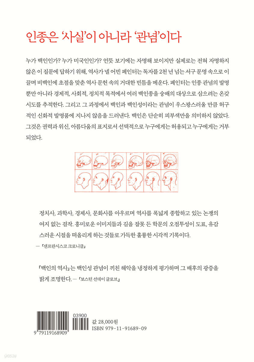 인종 왜곡에 관한 놀라운 이야기. 페인터는 세련되게, 효율적으로, 눈이 휘둥그레질 정도로 뛰어나게 노예제와 백인성의 창조를, 인종 범주들이 왜 거짓이고 파괴적인지를 밝혀낸다. 최고의 스토리텔링이다. - 엘런 굿맨 (워싱턴 포스트)