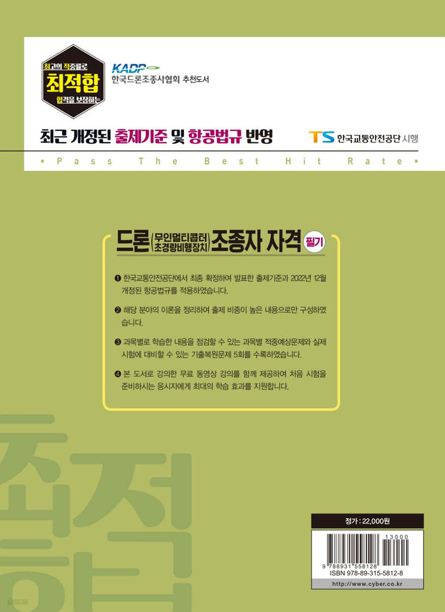 1 단위 환산/스칼라·벡터국제단위계접두어 2 태양계/지구계/대기권 특징/대기 구성 성분/공기 밀도 3 국제표준대기(ISA)/평균해수면(MSL)/항공기 고도 4 기상현상의 정의/종류 및 관측의 기술상 기준과 방법 5 기온/온도/열전달/대기안정도/기온역전층 6 기압/저기압/고기압 7 습도/이슬점/착빙/우박 8 안개/박무/연무/스모그 9 구름/운형/운량/운고 10 바람/항상풍/제트기류/계절풍/국지풍 11 강수/뇌우/뇌전/벼락 12 시정/시정장애 현상 13 기단/전선/태풍/용오름/토네이도/회오리바람 14 난류의 강도 및 종류 15 일기도/일기예보·특보비행관련정보 - 적중예상문제 Part 2· 비행이론(Flight Theory) 1 항공기(aircraft)의 정의 2 항공기 개발의 역사 3 비행기(airplane)의 분류 4 비행기 기체(airframe)의 구성요소 5 비행기의 동력장치(engine, 엔진) 6 비행계기의 종류 7 비행기의 재료 및 연료/윤활유 8 비행기의 날개골(airfoil, 에어포일) 9 유체(fluid)의 흐름 10 비행기에 작용하는 힘 11 양력의 발생 이론 및 항력의 종류 12 비행기의 조종성과 안정성 13 비행기의 선회(turn) 및 실속(stall) 14 비행기의 비행 단계별 특징 15 헬리콥터의 비행 원리 - 적중예상문제 Part 3· 드론 운용(Drone Operation) 1 드론 및 드론 시스템의 개념 2 드론의 분류 3 드론의 과거·현재·미래 4 무인멀티콥터의 특성 5 무인멀티콥터의 구성 6 비행제어장치(FC; Flight Controller) 7 센서(sensor)의 종류 및 기능 8 모터(motor) 및 전자변속기(ESC) 9 프로펠러(propeller) 10 배터리(battery)의 관리 11 무선통신 방식 및 조종기/비행 모드의 종류 12 무인멀티콥터에 작용하는 힘 13 무인멀티콥터의 비행 원리 14 무인멀티콥터의 비행절차별 특징 15 무인멀티콥터의 캘리브레이션(calibration) 16 항공안전과 인적요인(human factors) - 적중예상문제 Part 4· 항공법규(Aviation Laws) 1 국제 항공법규의 발달과정 2 국내 항공법규의 발달과정 3 주요 항공법규의 목적 및 세부 내용 4 용어의 정의 5 항공기, 경량항공기, 초경량비행장치의 구분 6 초경량비행장치의 신고 7 초경량비행장치의 안전성 인증 8 초경량비행장치의 조종자 증명 9 무인비행장치 조종자 전문교육기관 10 초경량비행장치의 공역(airspace) 11 비행승인 및 특별비행승인 12 초경량비행장치 조종자 준수사항 13 초경량비행장치의 사용사업 14 초경량비행장치의 사고·보고통보 15 청문, 벌칙, 과태료, 행정처분 - 적중예상문제 Part 5· 기출복원문제 1회 기출복원문제 2회 기출복원문제 3회 기출복원문제 4회 기출복원문제 5회 기출복원문제 |