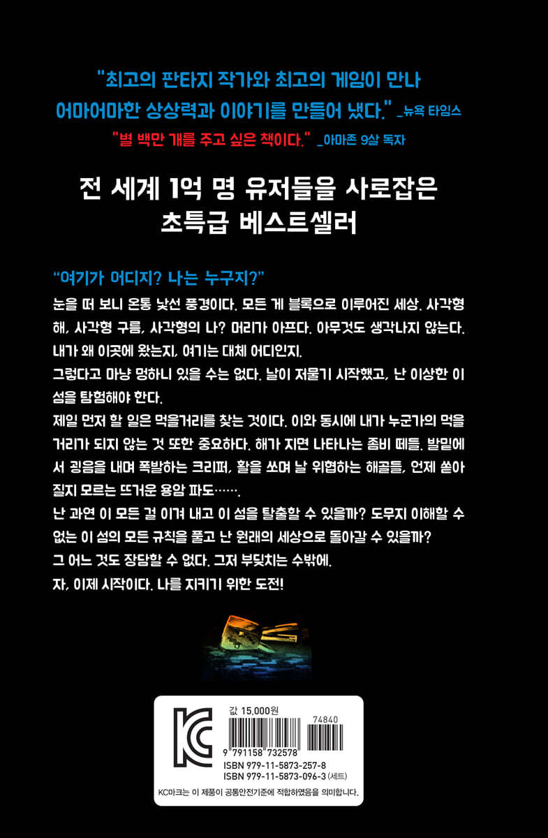 일어나 보니 물속이었다. 그것도 물속 깊이 빠져 있었다. 춥고 어두웠다. 수면은 어디지? 나는 수면 위로 오르려고 몸부림을 쳤다. 이쪽저쪽으로 몸을 비틀고 팔을 휘저었다. 그때 무언가 눈에 들어왔다. 빛이었다. 빛은 어둡고 흐리고 멀리 떨어져 있었다. 본능적으로 그 빛을 향해 헤엄치니 주변이 점점 환해지는 게 느껴졌다. 빛은 수면을, 햇빛을 가리키는 게 분명했다. 잠깐, 그런데 수면에 비친 해의 모양이 이상했다. 사…… 사각형? 그럴 리 없지. 아마 물속에 있어서 그렇게 보였을 거다. ‘무슨 상관이야! 곧 숨이 찰 거야. 어서 빠져나가야 해.’ 허파는 부풀어 올랐고 입술 사이로는 작은 공기 방울이 빠져나와 멀리 있는 빛을 향해 달려갔다. 나는 우리 안에 갇힌 짐승처럼 발버둥 치며 사방을 할퀴었다. 몸부림칠 때마다 물결이 출렁거리는 수면이 가까워지는 게 보였다. 하지만 그래도 여전히 멀리 떨어져 있었다. 몸이 아팠고 특히 허파는 불에 타는 듯 고통스러웠다. --- p.11~12, 「1장 낯선 섬에 버려지다」 중에서 “그어어.” 가래가 끓는 듯한 쉰 소리에 등골이 오싹해졌다. 어디서 나는 소리인지 알기 위해 사방을 둘러보았지만 여기저기서 들리는 듯했다. 나는 닭들이 조용해지길 바라며 가만히 서 있었다. 냄새가 났다. 곰팡이 냄새와 섞인 썩은 내였다. 마치 오랫동안 빨지 않은 양말 속에 들어 있는 죽은 쥐 냄새 같았다. 그 냄새의 정체는 내 앞에서 열 몇 걸음 정도 사이를 두고서야 눈에 들어왔다. 처음에는 사람인 줄 알고 한 발짝 다가갔다. 그러나 곧바로, 본능에 따라 걸음을 멈추고 뒤로 물러섰다. ‘그것’의 옷은 누더기였고 매우 더러웠다. 살은 얼룩진 초록색이었다. 눈은, 눈이라고 불러도 되는지 모르겠지만, 무표정한 얼굴에 찍힌 생기 없는 검은 점이었다. 내 머릿속은 이야기에서나 들었을 뿐 실제로 보지 못한 괴물들의 모습으로 가득 찼다. 그리고 바로 눈앞에 그 괴물 중 하나가 두 팔을 뻗은 채 내게 다가오고 있었다. --- p.33~34, 「2장 으악, 좀비가 나타났다」 중에서 녹은 용암이 쏟아져 바닥을 덮고 입구를 막았다. 나는 얼른 화장실 나무 문을 닫았지만 문은 곧 불에 타고 말았다. 나는 벌거벗은 상태로 갇히고 말았다. 전날 잠자리에 들기 전에 다 벗은 탓이다. 출구를 만들 도구도 없었고 입구를 막을 조약돌 블록 하나 없었다. 환기 뚜껑을 올려다봤지만 점프하기에는 너무 높았다. 남은 출구는 단 한 곳, 변기였다. 용암이 화장실 문을 녹이는 동안 나는 변기 뚜껑을 열고 안으로 뛰어들었다. 즉시 물길은 나를 하수구로 실어 내렸다. 바다에 빠진 나는 수면으로 헉헉거리며 올라갔다. 용암이 내는 불꽃에 집이 타고 있었다. 삽시간에 불길이 퍼진다는 표현이 눈앞에서 생생하게 펼쳐지고 있었다. 판자를 따라 퍼지는 불길은 집 전체를 먹어 버리겠다고 위협했다. 그 모습을 보고 있자니 숨이 멎을 것 같았다. --- p.225, 「17장 난 멈추지 않는다」 중에서 “좋아!” 나는 다가오는 악당들에게 소리쳤다. “너흰 다른 괴물보다도 더 이 벌을 받아야 해.” 나는 지렛대를 툭 쳐서 에너지가 흐르는 레일을 따라 수레를 내려보냈다. 나무, 금, 그리고 빠질 수 없는 레드스톤을 조합한 방법으로 다가오는 두 마녀에게 자동 미사일을 쏘았다. 두 마녀는 정신 나간 듯 깔깔대며 절벽으로 고꾸라져 액체 불길 속으로 빠졌다. “그래도 웃음이 나와?” 하지만 둘은 마지막까지 괴상한 웃음소리를 냈다. “그래도…… 내가 이겼어.” --- p.291~292, 「22장 끝과 시작」 중에서 |