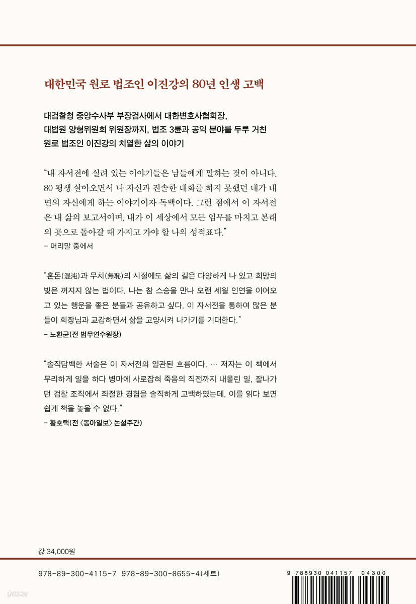 대검찰청 중앙수사부 부장검사, 대한변호사협회장을 거쳐 대법원 양형위원회 위원장까지, 법조 3륜과 공익 분야를 두루 경험한 원로 법조인 이진강의 치열한 삶의 고백을 소개한다. 1965년 대학 재학 중 제5회 사법시험에 합격하여 법무관 복무 후 1971년 검사로 임명된 저자는 이후 23년간 검사로서 다양한 분야에서 다양한 경험을 한 후 변호사로 개업하여 서울지방변호사회장, 대한변호사협회장까지 역임한다. 이어 법조계를 잠시 떠나 방송통신위원회 위원장 등 공익 분야에 투신하기도 한 저자는 이후 대법원 양형위원회 위원장을 역임함으로써 검찰 · 법원 · 변호사협회의 법조 3륜을 모두 경험한다. 대한민국 법조계의 산증인이자 존경할 만한 사회의 어른인 이진강 전 대한변호사협회장의 자서전을 통해 우리나라 법조인의 삶과 한국 현대사의 한 흐름을 엿볼 수 있다. 베트남전쟁 중 살인사건에서 12 · 12 내란사건까지 이 책에는 저자의 어린 시절에서부터 현재에 이르기까지 다양한 삶의 궤적이 담겨 있다. 그러나 아무래도 가장 관심이 가는 부분은 검사로서, 변호사로서 담당한 사건 기록이다. 저자는 군 법무관 시절 베트남전쟁에 파병되어 경험한 부대 내 살인사건에서부터 강릉지청 검사로서 조사한 탄광 내 승강기 추락사건, 그리고 변호사 개업 이후 변호에 참여한 12 · 12/5 · 18 내란사건 재판에 이르기까지 다양한 사건들을 소개한다. 이러한 사건들을 통해 저자의 균형 잡힌 객관성, 가슴 따뜻한 인간미와 더불어 법조인의 역할이 무엇인가에 대해 치열하게 고민한 흔적을 느낄 수 있다. 사실 저자는 중앙수사부 1과장 시절이던 1987년,〈중앙일보〉신성호 기자가 박종철 고문치사 사건의 1보 특종을 터뜨릴 때 검찰 내부에서 박 군의 사망 사실을 확인해 준 장본인이다. 이렇게 세상으로 펴져 나간 박종철 고문치사 사건은 결국 독재정권을 쓰러뜨리고 민주화를 불러오는 데 결정적 동력을 제공했다. 당시의 사연을 본인이 직접 집필하지는 않았으나, 권말에 수록된〈신동아〉2007년 인터뷰를 통해 당시의 실상을 확인할 수 있다. 개인적 아픔을 이겨내다 검찰 출신 법조인의 자서전이라면 으레 딱딱하고 엄격한 분위기일 것이라 상상하기 쉽다. 그러나 이 책에서 저자는 개인적인 아픔과 가족사, 즐겨 읽는 문학 작품도 솔직하게 다룸으로써 독자의 인간적 공감을 자아낸다. 1980년대 중반, 시국이 혼란한 가운데 중앙수사부에서 밤낮 없이 수사에 몰두하던 저자는 그만 건강을 잃고 죽음 직전까지 내몰린 데 이어 잘나가던 검찰 조직에서도 물러나는 좌절을 겪는다. 이러한 고통 속에서 건강을 되찾고자 필사적으로 노력한 저자와 그에게 헌신적인 도움을 아끼지 않은 법대 동기동창 출신 아내의 삶의 이야기는 법조인뿐만 아니라 삶에 지쳐 있는 이들, 무엇이 삶에서 가장 가치 있는 일인지 고민하는 독자들에게도 하나의 지침서가 될 수 있을 것이다. |