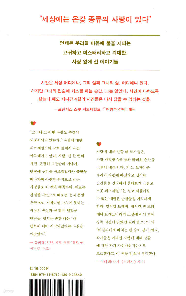 “그러나 그 어떤 사랑도 똑같이 되풀이되지 않는다.” 사랑에 대한 피츠제럴드의 고백 앞에서 나는 아득해지고 만다. 사랑. 단 한 번의 사건. 온전히 그들만의 이야기. 단숨에 우리를 사로잡았다가 불현듯 떠나가며 아련한 흔적으로 남는 사정들로 이 책은 빼곡하다. 때로는 간절한 사연으로 때로는 웃지 못할 촌극으로, 시작하면 그치지 못하는 사랑의 속성과 꼭 닮은 열일곱 단편들. 펼치는 순간 나는 “내 행복이 이미 시작되었다는 사실을 깨달았다”. - 유희경 (시인)