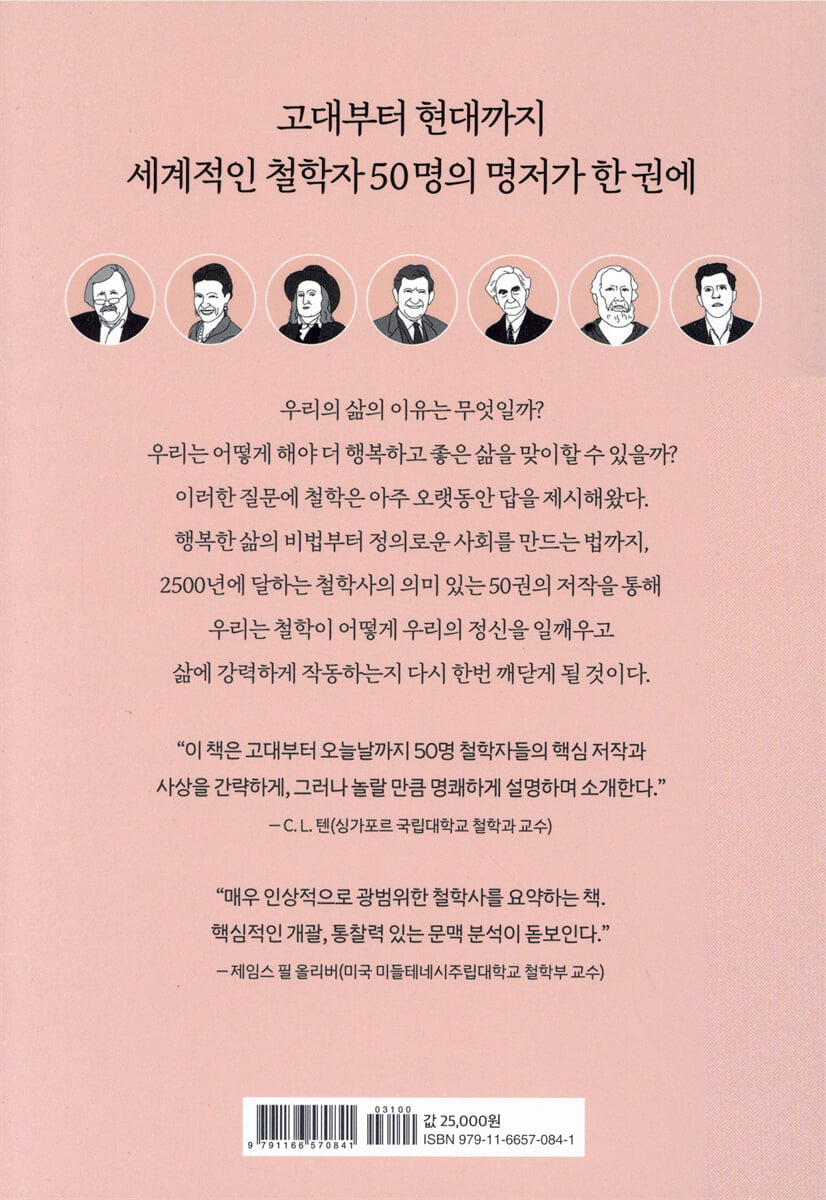“이 책은 고대부터 오늘날까지 50명 철학자들의 핵심 저작과 사상을 간략하게, 그러나 놀랄 만큼 명쾌하게 설명하며 소개한다.” - C. L. 텐 (싱가포르 국립대학교 철학과 교수)