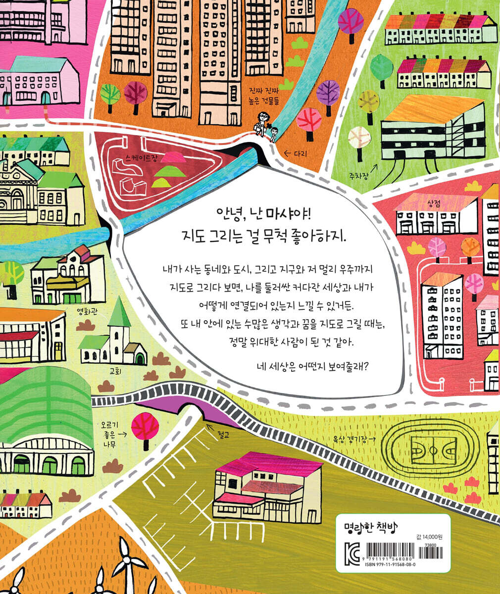나를 둘러싼 세상을 더 잘 이해하기 위한 지도 그림책 아이들은 성장하면서 점점 더 커다란 세상을 만나게 됩니다. 우리 집이 전부였던 유아기를 지나면, 유치원과 학교, 동네와 도시, 그리고 국가와 세계라는 큰 세상을 알게 되지요. 나와 세상이 이어져 있음을 보여주기 위해 이 책은 지도를 선택합니다. 광활한 우주 공간까지 시선을 확장한 후, 우주 속 지구, 지구 속 우리 도시와 동네, 우리 집과 내 방까지 시선을 좁혀 들어오는 구성은 흥미와 몰입도를 극대화합니다. 마샤는 지도를 그리면서 거대한 세상 속의 ‘나’와 ‘나를 둘러싼 세상’을 이해합니다. 이러한 마샤처럼, 각각의 지도에서 나의 위치를 찾아보며 세상과 내가 어떻게 연결되어 있는지 느껴 보세요. 나와 가족, 나와 이웃, 나와 국가 그리고 세계의 관계도 생각해 보세요. 세상 속에서 나는 아주 작지만 내가 품은 생각과 질문, 꿈은 절대 작지 않아요! 이따금 날 둘러싼 세상이 얼마나 거대한지 느껴질 때면, 작은 ‘나’의 존재에 대해 생각해 보게 됩니다. 광활한 우주에서 마샤는 너무 작아서 보이지 않습니다. 하지만 우주에서 지구, 도시와 동네를 거쳐 나의 모습과 생각까지 이른 마샤는 자신은 더 이상 작지 않다고 말합니다. 내 안에 이렇게 많은 질문과 생각과 꿈이 있는 한 작을 수 없다고요. 마샤는 책 읽기와 만들기를 좋아합니다. 호기심이 많고 모험을 꿈꾸지요. 끝없이 생각하고 질문을 던지며, 아주 많은 것들에 흥미를 느낍니다. 모든 어린이는 좋아하는 것과 꿈꾸는 것, 자신만의 특별함과 개성이 있습니다. 이 모든 호기심과 관심거리는 배움의 기쁨을 주지요. 어린이의 매일매일이 배움의 기쁨으로 가득 채워지길 바랍니다. 한 장 한 장 무궁무진한 이야깃거리를 만들어줄 책! 지도는 참 흥미롭습니다. 세상 속에 내가 어디 있는지 한눈에 보여주고, 내가 좋아하는 상점, 자 주 가는 도서관, 친구네 집, 놀이터와 학교 등 모든 것들이 서로 연결되어 있지요. 또 그 공간을 살아가는 사람들의 이야기도 상상하게 해줍니다. 이 책은 주변 세상을 늘 궁금해하고, 탐험하고, 호기심이 많은 어린이에게 무궁무진한 이야깃거리를 만들어 줄 것입니다. |