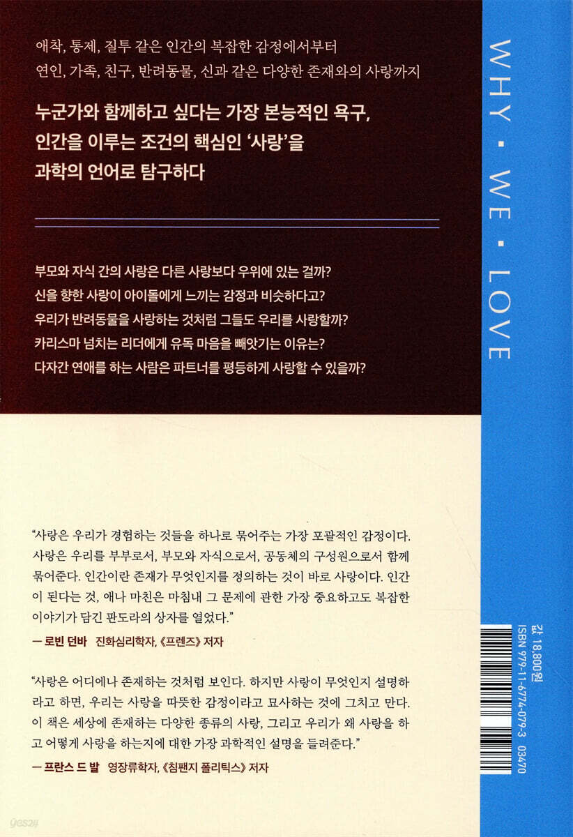 “사랑은 어디에나 존재하는 것처럼 보인다. 하지만 사랑이 무엇인지 설명하라고 하면, 우리는 사랑을 따뜻한 감정이라고 묘사하는 것에 그치고 만다. 이 책은 세상에 존재하는 다양한 종류의 사랑, 그리고 우리가 왜 사랑을 하고 어떻게 사랑을 하는지에 대한 가장 과학적인 설명을 들려준다.” - 프란스 드 발 (영장류학자, 《침팬지 폴리틱스》 저자)