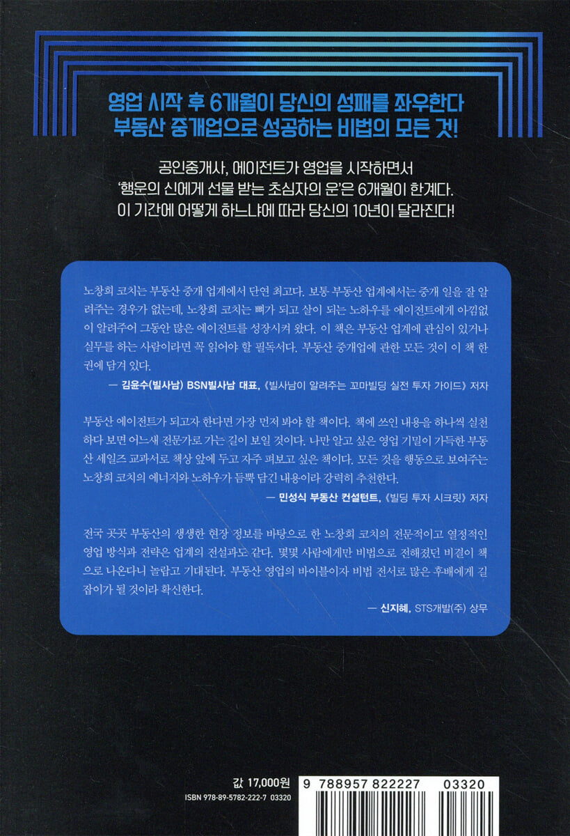 부동산 영업에는 왕도가 있다! 공인중개사 자격증을 획득하고 개업하지 않은 사람이 10만 명이 넘는다는 통계가 있다. 저자는 공인중개사 자격증은 ‘혹시나 나중에 노느니, 재테크를 위해, 노후를 위해’ 이런 이유로는 딸 필요가 없는 자격증이라고 말하며 공인중개사라는 직업은 이제 소일거리로 할 게 아니라고 이야기한다. 풀타임으로 몰입해도 성공할지 망할지 알 수 없는 고도의 산업으로 업그레이드되었기에 장롱 면허증 소지자는 더욱 영업하기가 힘든 시대가 온 것이다. 저자는 자격증을 획득했다면 바로 ‘거절의 파도’를 타면서 부동산 세일즈를 하라고 권한다. 이 책은 부동산 비즈니스를 처음 시작하는 공인중개사, 에이전트가 거절의 파도를 타며 멋지게 서핑하는 법, 즉 부동산 영업에서 성공하는 방법과 노하우를 아낌없이 담았다. 저자는 30년 가깝게 부동산 에이전트이자 세일즈 코치로 생활하며 부동산 세일즈에는 왕도가 있다는 사실을 깨달았다. 부동산 영업은 오래 했다고 무조건 잘하는 것이 아니라, 짧게 일했더라도 제대로 배운 사람이 잘하는 것이라고 이야기한다. 부동산 영업을 하다 보면 세부적인 스킬이나 미묘한 심리전, 높은 수준이 요구되는 전문 분야도 접하게 되겠지만, 거래를 위한 기본적인 고객 발굴, 물건 발굴이라는 마케팅 과정은 짧은 시간이라도 얼마든지 만들어 낼 수 있다고 단언한다. 그리고 부동산 영업에서 성공한 사람들에게는 몇 가지 공통점이 있다는 사실을 알아냈다. ‘일찍 출근하고, 많은 사람을 만나려고 노력하고, 만나는 모든 사람에게 자신의 직업을 밝히고 명함을 건네고, 사무실 안에서 최소한의 시간만 머물고, 스스로 동기부여를 유지하기 위한 다양한 멘털 강화 및 힐링 프로그램을 갖고, 매사에 긍정적이고 악바리 정신이 있다’는 것이다. 저자는 24시간 부동산 관점으로 모든 세상을 바라봐야 부동산 세일즈에 성공할 수 있다며 이야기를 시작한다. 그리고 특히 공인중개사, 신입 에이전트가 영업을 시작하면서 ‘행운의 신에게 선물 받는 초심자의 운’은 6개월 정도가 한계인데, 이 기간에 어떻게 하느냐에 따라 10년을 좌우한다고 말한다. 처음 부동산 공인중개사, 에이전트 생활을 시작했다면 미래 10년의 먹을거리를 위해서는, 다람쥐가 도토리를 모으듯이 잠재고객을 꾸준히 모아야 한다고 강조한다. 아무리 프롭테크가 발전하고 아파트나 원룸 등의 거래는 스마트폰으로 다 해버리는 시장이 오겠지만, 정말 부자들은 더욱더 고품질의 대면 부동산 서비스를 찾을 것이다. 그게 부자 마인드이기 때문이다. 결국 당신은 성공한 부동산 에이전트라는 직업을 통해 부자가 될 테니, 곧 이 부자 마인드를 이해하게 될 것이다. 단, 세상에는 공짜가 없다. 당신에게 필요한 투자금은 오직 본문에서 여러 차례 언급한 시간, 열정, 자기 자신이다. |