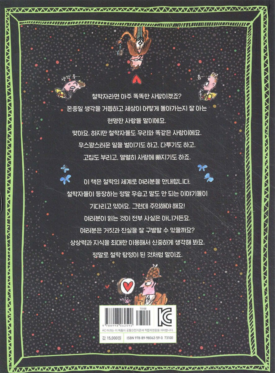 호기심과 상상력을 자극하는, 철학자들과 관련된 다양한 수수께끼 여러분이 직접 철학 탐정이 되어 진실을 찾아보아요! 철학자들은 온종일 생각에 생각을 거듭하고, 세상이 어떻게 돌아가는지 잘 아는 현명한 사람들이에요. 하지만 철학자도 우리와 똑같은 사람이랍니다. 우스꽝스러운 일을 벌이기도 하고, 서로 다투기도 하고, 고집도 부리고, 열렬히 사랑에 빠지기도 하죠. 괴짜인 경우도 많고요. 이 책에는 철학자들과 관련된 재미있으면서도 엉뚱한 이야기들이 담겨 있어요. 일종의 철학자들과 관련된 소문들이지요. 이 소문들이 터무니없이 부풀려지거나 오해가 생기지 않도록 여러분이 직접 철학 탐정이 되어 진실을 밝혀내는 거예요. 소크라테스는 왜 독약을 마시고 죽었는지, 엄청난 교육책을 쓴 장 자크 루소는 자기 자녀들을 어디로 보냈는지, 메리 울스턴크래프트는 왜 노르웨이로 가는 배에 올랐는지, 제러미 벤담의 머리는 대체 누가 가져갔는지, 시계처럼 규칙적인 삶을 살았던 이마누엘 칸트가 산책을 거른 이유는 무엇인지, 비트겐슈타인과 포퍼는 무엇을 두고 싸웠는지, 시몬 드 보부아르는 왜 맨 엉덩이로 사진을 찍었는지… 듣기만 해도 정말 궁금하지 않나요? 각 장에는 하나의 사건과 관련된 철학자가 등장하고, 철학 탐정이 해결해야 하는 문제들이 나와요. 그런데 답을 찾기 위해 제공된 정보들이 전부 사실은 아니기 때문에 주의해야 해요. 무엇이 진실이고, 무엇이 거짓인지 주의 깊게 따져 보고, 여러분의 생각과 상상력을 동원해 신중하게 답을 찾아보세요. 또한 제논이 고안해 낸 아킬레우스와 거북이의 역설부터 니체의 사상, 필리파 풋의 트롤리 문제와 주디스 버틀러의 성 역할 논의까지, 생각해 볼 만한 철학적 이야기들도 담겨 있답니다. 사건을 풀기 위해 추리하면서 답을 찾아가다 보면 상상력이 풍부해지고 자연스레 철학에 대한 호기심이 생길 거예요. 함께 수록된 삽화는 재미를 더해 준답니다. 이 책을 통해 철학자들의 몰랐던 모습을 발견하고, 그들의 사상을 알게 되고, 우리 주변 세상에 대해 생각해 볼 수 있는 시간을 갖게 될 거예요. 자, 그럼 사건을 해결하러 가 볼까요? |