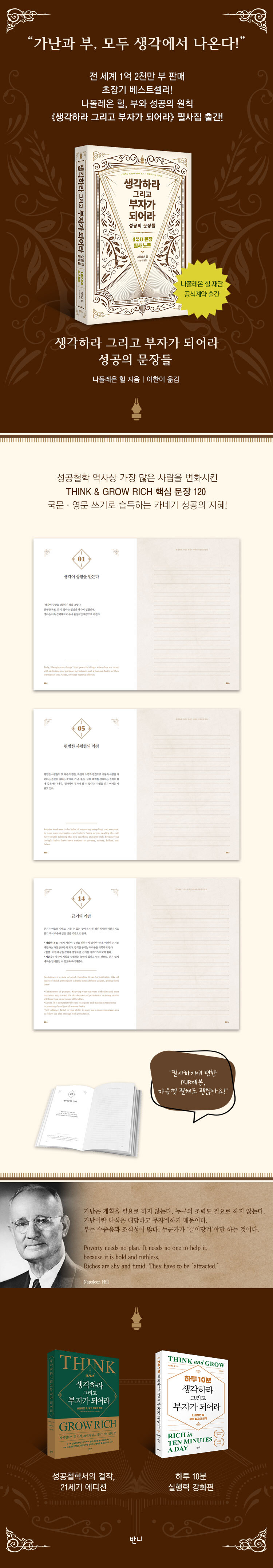 Think and Grow Rich 핵심 문장 120 국문, 영문 쓰기로 습득하는 카네기 성공의 지혜! 80년간 전 세계인의 사랑을 받아온 『생각하라 그리고 부자가 되어라(Think and Grow Rich)』가 21세기 에디션으로 새롭게 출간되면서 또다시 국내 독자들의 많은 사랑을 받고 있다. 이 책이 전하는 메시지는 단순하다. 가난과 부는 모두 당신의 마음에 달려 있다는 것이다. 부자가 되고 싶다면 부를 끌어당기는 마음을 가져야 한다. 하지만 생각만으로 부자가 되는 건 아니다. 잠재의식에 새겨진 부의 열망과 함께 구체적인 행동과 실천이 뒤따라야 한다. 『생각하라 그리고 부자가 되어라 성공의 문장들』은 나폴레온 힐의 성공철학을 직접 써보면서 부와 성공에 대한 자신의 열망과 실천을 강화할 수 있는 필사집이다. 원서는 문장 하나하나가 곱씹어볼만한 내용들로 가득 채워져 있다. 수많은 독자들이 밑줄을 치며 이 책을 읽는 이유다. 이번 필사집은 한 장에 하나의 문장 혹은 문단으로 구성되어 있어, 핵심 문장에 더욱 집중할 수 있다. 국문과 영문으로 된 문장을 옮겨 적는 행동 자체가 당신의 잠재의식에 부에 대한 열망을 강하게 새겨 넣을 수 있다. 이 책은 『생각하라 그리고 부자가 되어라(Think and Grow Rich)』와 『하루 10분, 생각하라 그리고 부자가 되어라』를 잇는 3번째 책이다. 나폴레온 힐의 성공철학에 많은 독자들이 동감하고 삶의 지침으로 삼는 것을 보면서 나폴레온 힐 재단과의 공식 계약을 통해 국내 출판사가 처음 기획 출간하게 되었다. 『생각하라 그리고 부자가 되어라』는 한 번의 독서로 깊은 성공의 지혜를 체득하기에는 어려움이 있다. 확실하게 내용을 이해하고, 인생을 바꾸는 자신의 노력을 흔적으로 남기고 싶은 독자에게 이번 필사집이 큰 선물이 될 것이다. |