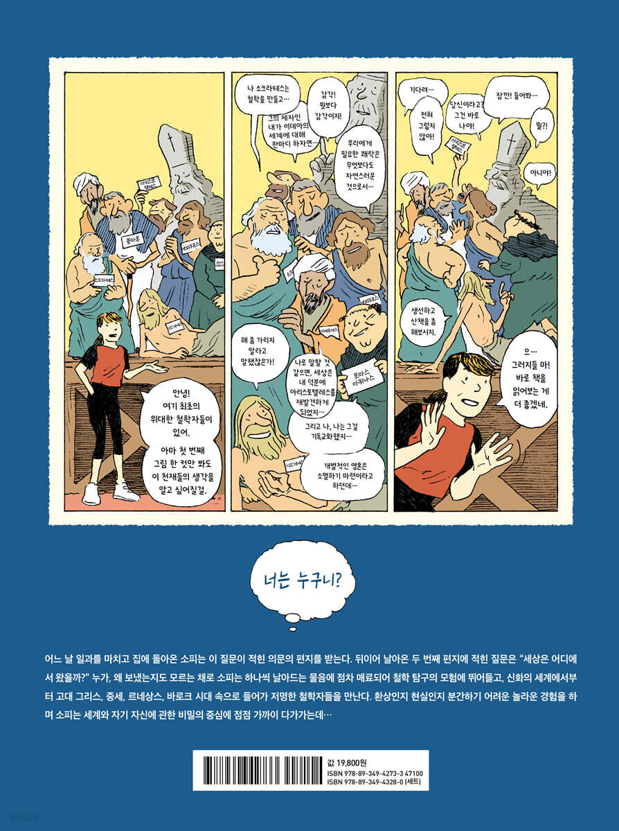 철학 소설의 고전 《소피의 세계》를 오늘의 문제의식을 담은 만화로 만난다! 〈사피엔스 그래픽 히스토리〉 알뱅 미셸 출판사의 또 하나의 걸작 그래픽노블 “너는 누구니?” 어느 날 일과를 마치고 집에 돌아온 소피는 이 질문이 적힌 의문의 편지를 받는다. 뒤이어 날아온 두 번째 편지에 적힌 질문은 “세상은 어디에서 왔을까?” 누가, 왜 보냈는지도 모르는 채로 소피는 하나씩 날아드는 물음에 점차 매료되어 철학 탐구의 모험에 뛰어들고, 고대 신화의 세계에서부터 고대 그리스, 중세, 르네상스, 바로크 시대 속으로 들어가 저명한 철학자들을 만난다. 환상인지 현실인지 분간하기 어려운 놀라운 경험을 하며 소피는 세계와 자기 자신에 관한 비밀의 중심에 점점 가까이 다가가는데… 출간 30년이 지나도록 한결같은 사랑을 받고 있는 철학소설 《소피의 세계》가 만화로 독자를 찾아왔다. 프랑스의 대표적 출판사 알뱅 미셸에서 《사피엔스 그래픽 히스토리》(현재 2권까지 출간)에 이어 야심 차게 기획한 지식교양 만화이다. 열다섯 살 소녀 소피가 의문의 철학 선생님과 편지와 대화를 주고받으며 서양철학사 전반을, 그리고 자신이 누구이고 그를 둘러싼 세계가 무엇인지 알아가는 《소피의 세계》를 재미있고 섬세한 만화로 재탄생시켰다. 총 2부작으로 출간될 예정인데, 이번에 나온 1권에는 신화 시대에서 바로크 시대까지의 내용을 담았다. 데카르트부터 현대 철학자들을 다루는 2권은 2023년 가을에 출간될 예정이다. 레고인간 데모크리토스, 생선 산책자 디오게네스 - 섬세한 각색으로 역동적이고 유쾌하게 구성해낸 서양철학사 《소피의 세계》가 각광받은 것은 흥미로운 이야기 구조 안에 2500년 서양철학사의 주요 주제를 풀어낼 수 있었던 까닭이다. 노르웨이에서 철학교사로 일하기도 했던 요슈타인 가아더는 다소 복잡하지만 흥미로운 액자소설의 구성 안에 소크라테스 이전 철학자들부터 사르트르에 이르기까지 주요한 서양철학자들의 사상을 10대의 눈높이에 맞추어 소개했다. 뿐만 아니라 ‘나는 누구이며, 어디에서 왔는가? 세계는 무엇으로 되어 있는가’와 같은 물음을 파고드는 소피의 모습을 보여주면서 오래된 철학 질문이 어떻게 나의 ‘철학함’과 연결될 수 있는지를 훌륭하게 보여주었다. 출간되자마자 호평을 받으며 여러 언어로 번역되었고, 우리나라에서도 금세 청소년 필독서로 자리잡았을 뿐 아니라 성인들에게도 철학입문서로 사랑받았다. 《소피의 세계》가 일찌감치 영화와 뮤지컬로 제작되기도 한 것을 고려하면, 이 작품이 만화로 나온 것은 오히려 좀 늦은 감이 있다. 《만화로 보는 소피의 세계》는 놀라운 상상력이 돋보이는 만화적 요소들을 활용해 소피의 철학 모험을 한층 역동적으로, 흥미롭게 펼쳐보인다. 북유럽 신화의 토르가 종이봉투 안에서 화를 내며 망치를 내리친 탓에 거대한 몸집으로 자라난 그리스 철학자들이 봉투 밖으로 쏟아져나오는가 하면, 원자설을 주장한 데모크리토스는 레고블록으로 조립된 모습으로 등장해 자신의 사상을 그대로 체현한다. 생선을 끌고 산책하는 디오게네스처럼, 원작에는 없지만 재미있는 이야기도 보충했다. 주인공 소피는 떠다니는 글자를 잡아타고 현실 세계와 철학의 세계를 오가기도, 때로는 만화의 사각 프레임을 뜯고 나오기도 한다. 《숨을 참는 아이》로 국내 독자들에게도 이름을 각인시킨 만화 시나리오 작가 뱅상 자뷔스와 노련한 그림작가 니코비는 원작자인 요슈타인 가아더에게 ‘완전한 자유’를 허용받고 작업했다고 한다. 10대 소녀 소피가 의문의 철학 선생님과 편지와 대화를 주고받으며 서양철학사 전반을, 그리고 자신이 누구이고 그를 둘러싼 세계가 무엇인지 알아가는 큰 스토리는 그대로이지만, 섬세한 각색을 거쳐 현대적으로 재탄생한 이 작품은 원작과는 또 다른 재미를 안겨준다. 스마트폰을 들고 기후시위에 나선 소피 - 오늘의 세계, 오늘의 독자를 위한 소피의 세계 《소피의 세계》 한국어판이 처음 출간된 것이 1990년대 중반이었니, 벌써 한 세대 가까운 시간이 흘렀다. 《만화로 보는 소피의 세계》에는 그간 달라진 문화가 반영되었다. 호기심 많고 자신과 세계에 대해 철학적인 질문을 던지는 명민한 주인공의 성격은 그대로이지만, 2020년대의 소피는 스마트폰을 들고 SNS로 소통하며, 기후위기 문제의 해결을 촉구하는 시위에 나선다. 여성을 불완전한 존재로 보는 뒤떨어진 철학에 맞서는 시선은 조금 더 예리해졌다. 운명론과 이미 짜인 각본에 맞서 자신의 인생을 개척하려는 소피, 문제의식을 갖고 세상을 바꾸고자 고민하고 참여하는 소피의 모습은 대한민국의 고민하는 10대의 모습과 크게 다르지 않다. 스스로 생각하며 당당한 주체로 서기를 바라는 젊은 독자들은 소피의 모습에 깊이 공감할 수 있을 것이다. 소설 《소피의 세계》가 처음 나왔을 당시 이 책을 읽은 청소년과 대학생들 중에는 이제 소피와 비슷한 나이의 자녀를 두고 있는 이가 많을 텐데, 《만화로 보는 소피의 세계》는 이들 모두가 함께 읽고 이야기를 나누기 좋은 책이기도 하다. 작중 소피의 어머니와 소피가 