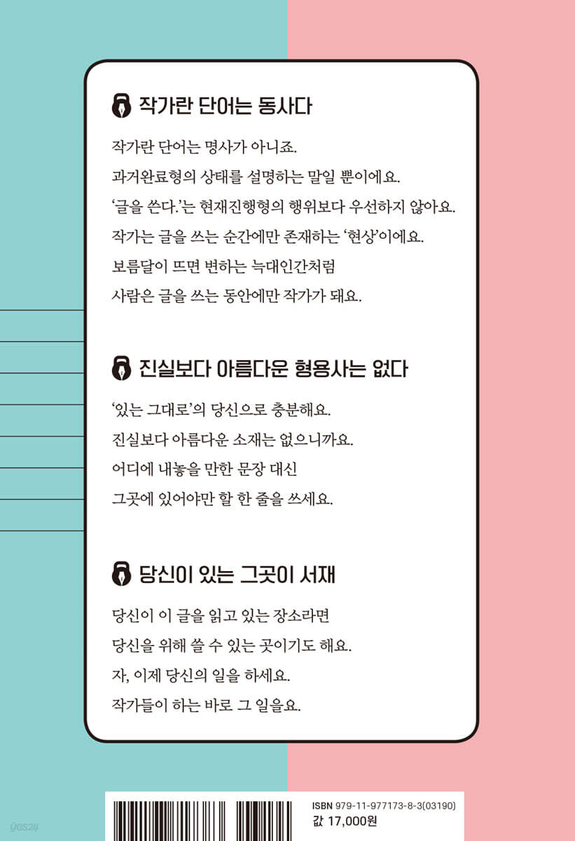 트레이닝 Step 1. 한 페이지로 끝내는 글쓰기 수업 트레이닝 Step 2. 라이팅 트레이닝 ⓦⓣ 트레이닝 Step 3. 글쓰기에 실패는 없다 트레이닝 Step 4. 빨간 펜으로 쓴 책은 없다 트레이닝 Step 5. 일기는 작가의 적금 트레이닝 Step 6. 모두에게 말하면 누구도 듣지 않는다 트레이닝 Step 7. 짧고, 쉬운 문장으로, 계속해서 트레이닝 Step 8. 제목은 구조 신호다 트레이닝 Step 9. 뮤즈는 발신번호를 남기지 않는다 트레이닝 Step 10. 글쓰기 공모자 되어 버리기 트레이닝 Step 11. 몸에 좋은 약은 “쓰다” 트레이닝 Step 12. 글쓰기로 자유로워지기 트레이닝 Step 13. 여행기는 치트키(cheat key) 트레이닝 Step 14. 이름 부를 꽃이 피었다 트레이닝 Step 15. 필사적으로 필사하기 트레이닝 Step 16. 글쓰기라는 세계 트레이닝 Step 17. 글을 쓰는 당신이 알아야 할 용어들 트레이닝 Step 18 진실을 드러내는 글쓰기 트레이닝 Step 19. 라이팅 블루 트레이닝 Step 20. 작가란 단어는 동사다 트레이닝 Step 21. 글쓰기 체력 체크하기 트레이닝 Step 22. 작가가 되고 싶다면 트레이닝 Step 23. 즉흥적으로 쓰기 트레이닝 Step 24. Turn your scar into a star 트레이닝 Step 25. 가족은 건드는 게 맞다 트레이닝 Step 26. 슬럼프에 빠졌을 때 트레이닝 Step 27. 트레이너 팁 트레이닝 Step 28. 진실보다 아름다운 형용사는 없다 트레이닝 Step 29. 신인상은 평생 한 번 뿐 트레이닝 Step 30. 쓸 수밖에 없기에 트레이닝 Step 31. 쓸모없는 글쓰기의 기쁨 트레이닝 Step 32. 소재가 없다는 거짓말 트레이닝 Step 33. 시간이 없다는 핑계 트레이닝 Step 34. 재미없을 거라는 착각 트레이닝 Step 35. 재능이 없다는 변명 트레이닝 Step 36. 카카오톡하듯 쓰기 트레이닝 Step 37. 버린 문장만큼 단단해진다 트레이닝 Step 38. 아무 생각 없이 모든 생각 늘어놓기 트레이닝 Step 39. 글이 써지지 않을 때 글감을 준비한다 트레이닝 Step 40. 말장난을 부탁해 트레이닝 Step 41. 살아있는 글은 몸으로 쓴다 트레이닝 Step 42. 연습 삼아 쓰지 않기 트레이닝 Step 43. 지운 문장은 있어도 사라진 글은 없다 트레이닝 Step 44. 의식의 흐름대로 쓰기 트레이닝 Step 45. 글쓰기가 두려워 질 때 트레이닝 Step 46. 작가의 단어장 part 1 트레이닝 Step 47. 작가의 단어장 part 2 트레이닝 Step 48. 작가의 단어장 part 3 트레이닝 Step 49. 꼭지 제목은 문장으로 트레이닝 Step 50. 종이 위에서 생각하기 트레이닝 Step 51. 작가의 사전에 ‘쓸모’라는 단어는 없다 트레이닝 Step 52. 작가가 알아야 할 사이트 트레이닝 Step 53. 당신 방에서 편집자를 쫓아내세요 트레이닝 Step 54. 타인의 문장 맛보기 트레이닝 Step 55. 가볍게 쓰기 트레이닝 Step 56. 책상에 빈손으로 앉지 않기 트레이닝 Step 57. 모은 메모로 글쓰기 트레이닝 Step 58. 메모의 힘 트레이닝 Step 59. 당신이 있는 그곳이 서재 트레이닝 Step 60. 냅다 문부터 열어버리기 트레이닝 Step 61. 예쁘게 피우려다 꽃이 시든다 트레이닝 Step 62. 지금의 이름을 짓다 트레이닝 Step 63. 작가는 기억력보다 기록력! 트레이닝 Step 64. 가계부도 멋진 글감 트레이닝 Step 65. 글쓰기는 느리게 말하기 트레이닝 Step 66. 초고는 커다란 글감 트레이닝 Step 67. 작가의 취향 트레이닝 Step 68. 일곱 난쟁이 법칙 트레이닝 Step 69. 작가라는 단어는 현재진행형 트레이닝 Step 70. 일상의 에피소드가 인생의 스토리가 된다 트레이닝 Step 71. 글쓰기는 불피우기 트레이닝 Step 72. 눈은 손보다 먼 곳을 본다 트레이닝 Step 73. 버린 글의 부피 만큼 문장은 질량을 얻는다 트레이닝 Step 74. 돈쓰기보다 글쓰기 트레이닝 Step 75. 오래된 물건은 보물 창고 트레이닝 Step 76. 종이 위에 나를 내려놓기 트레이닝 Step 77. 지름길로는 닿지 못할 곳 트레이닝 Step 78. 당신에게 필요한 낱말은 트레이닝 Step 79. 당신은 이미 작가입니다 트레이닝 Step 80. 퇴고로 글을 쓰다, 듬다 트레이닝 Step 81. 퇴고 = 빼기의 기술 트레이닝 Step 82. 투고 전 체크리스트 트레이닝 Step 83. 싸움에 임하기 전에 트레이닝 Step 84. 어떤 출판사에 원고를 맡길 것인가 트레이닝 Step 85. 생면부지의 편집자에게 구애하기 트레이닝 Step 86. 출판의 종류에 관하여 트레이닝 Step 87. 거절당해도 당당하게 트레이닝 Step 88. 투고 문구의 진화 과정 살펴보기 트레이닝 Step 89. 출간 제안서 써보기 트레이닝 Step 90. 계약 과정 꼼꼼히 살피기 트레이닝 Step 91. 출간 계약서 살펴보기 트레이닝 Step 92. 편집 과정에 대해서 트레이닝 Step 93. 이야기에게 말을 거는 삶 에필로그 |