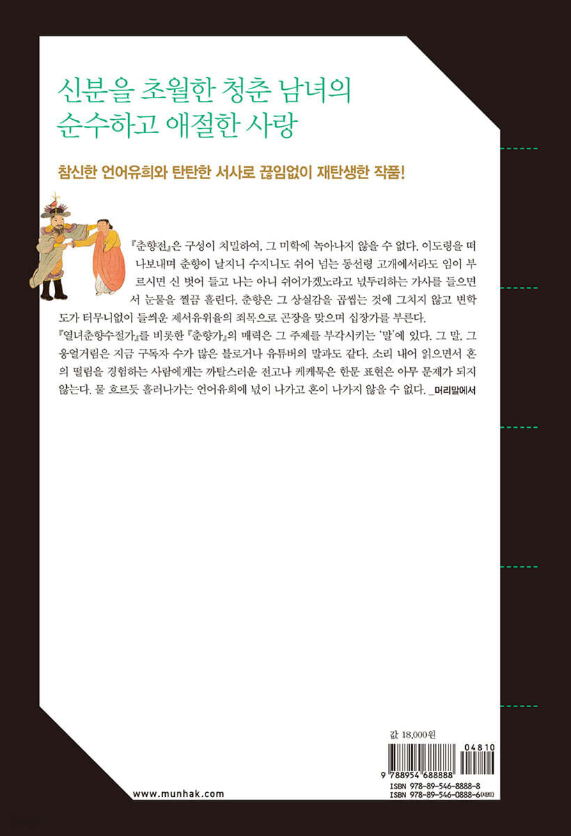 조선시대에도 청춘 남녀의 사랑은 문학작품의 인기 소재였다. 『춘향전』은 기생의 딸 성춘향과 양반 자제 이몽룡(이도령)의 만남을 극적으로 그려 재미와 감동을 준다. 오월 단옷날 녹음이 우거진 곳에서 붉은 치맛자락을 풀풀 날리며 그네를 타는 춘향의 모습을 보고 이도령은 춘향에게 첫눈에 반한다. 이도령은 춘향의 집을 찾아가서 춘향과 평생 함께하자는 언약을 맺고 바로 그날 밤 춘향과 사랑을 나눈다. 하지만 이도령이 아버지를 따라 한양으로 가게 되면서, 몽룡과 춘향은 곧 헤어지게 되는데, 그 가슴 절절한 이별 장면이 압권이다. 이도령이 눈물을 왈칵 쏟으며 이별을 전하자, 춘향은 머리를 쥐어뜯으며 자탄가 조로 신세한탄을 늘어놓는다. “서방 없는 춘향이가 세간살이 무엇 하며, 단장하여 누구 눈에 곱게 보일꼬. 몹쓸 년의 팔자로다. 이팔청춘 젊은 것이 이리될 줄 어찌 알았으랴.” 둘은 서로 얼굴을 대보고 손을 만지며 한참 동안 슬피 운다. 춘향은 이도령과 헤어지고 나서 밥도 못 먹고 잠도 못 이루어 나날이 수척해져가는 중에 진양조장단의 울음을 터뜨린다. “갈까보다 갈까보다. 임을 따라 갈까보다./ 천리라도 갈까보다. 만리라도 갈까보다./ (…) 임이 와 날 찾으면, 나는 신발 벗어 손에 들고 나는 아니 쉬어갈래.” 한편 춘향 모는 춘향과 이도령을 이어주는 조력자의 역할을 톡톡히 해낸다. 두 사람이 만나기 전 청룡이 나오는 꿈을 꾼 춘향 모는 꿈 몽 자에 용 용 자를 연상할 수 있는 이름을 가진 이몽룡이 딸의 인연임을 직감한다. 춘향 모는 이도령과의 첫 만남에서 어떻게 보여야 할지 딸에게 조언을 해주는가 하면 향단을 시켜 이도령과 춘향의 술상을 차리고 자리와 등촉을 잘 살피게 한다. 이도령에게는 자신이 딸을 지극정성으로 키웠다고 얘기해주며, 그동안 딸이 절개를 지켜온 점을 칭찬한다. 딸과 이도령이 헤어질 때는 딸이 버림받는 거라며 이도령을 혼쭐내기도 한다. 춘향 모는 이도령이 한양에서 높은 벼슬에 오르게 해달라고 신들께 빌기도 하는데, 이도령은 장모의 정성에 감동받는다. “내 춘향을 첫 장가로 맞은 부인처럼 여길 터이니 시부모를 모셔야 한다고 염려 말고, 내가 아직 정식 혼례를 치르기 이전이라고 염려 마오. 대장부가 한번 먹은 마음으로 박대하는 행실을 하겠는가? 허락만 해주오.” (『춘향전』 71쪽) 흥미로운 언어유희와 생생한 민중의 생활 이도령과 춘향은 언어유희와 말놀이의 대가다. 이도령은 춘향과 하룻밤을 보내고 집에 돌아오자마자 춘향을 그리워하며 도통 공부에 집중을 못한다. 여러 경서의 구절을 한 줄 한 줄 읽을 때마다 끝에 가서는 모두 춘향을 떠올리는 말을 내뱉는다. 『맹자』를 읽을 때는 “맹자께서 양혜왕을 만날 때 왕이 말하였다. 노인께서 마다않고 오시니, 춘향을 보려고 오셨습니까?”라며 자신도 모르는 사이에 춘향을 떠올린다. 이도령은 잠자리를 하면서 우스갯소리도 하며 자연히 〈사랑가〉를 부른다. “사랑 사랑 내 사랑이야/ 동정호 칠백 리 달이 질 무렵 무산같이 높은 사랑/ 시선 다하도록 끝이 없는 강물에 하늘같이 바다같이 깊은 사랑.” 이도령은 동음이의어를 이용해 ‘정(情)’ 자 말놀이 노래도 부른다. “너와 나와 유정하니 어이 아니 다정하리./ (…) 난세 평정, 우리 둘이 천년 인정.” 이도령과 춘향은 홀딱 벗고 업음질을 하며 야릇한 말을 섞으며 세월 가는 줄 모르고 온갖 장난을 하며 논다. 『춘향전』에는 민중의 생활을 엿볼 수 있는 장면도 곳곳에 배치돼 있다. 춘향은 꿈을 꾸고 불길한 예감에 앞이 보이지 않는 시골 봉사에게 점을 쳐달라고 부탁한다. 봉사는 점칠 때 쓰는 산가지를 넣어준 산통을 철겅철겅 흔들고서 점괘를 풀이하고 해몽도 해준다. 한편 이도령은 암행어사로 전라도를 순행하면서 백성이 부르는 노래를 듣는다. 농사철이라 〈농부가〉를 부르는가 하면 노인들이 끼리끼리 모여 〈백발가〉를 부르며 밭을 일구기도 한다. “가는 홍안 절로 가고 백발은 시시로 돌아와/ 귀밑에 살쩍이 잡히고 검은 머리 백발 되니/ 아침에는 푸른 실 같더니 저녁에는 흰 눈 같은 법, 무정한 게 세월이라.” 탐관오리와 암행어사의 대결 『춘향전』은 백성을 착취해 원망이 자자한 탐관오리에게 벌을 주는 암행어사의 이야기로 지배 계층을 비판하기도 한다. 남원 부사로 부임한 변학도는 춘향이 아름답다는 소문을 듣고 춘향을 억지로 불러낸다. 춘향은 이도령과 백년가약을 맺고 있어 변학도의 수청을 거절하지만, 변학도는 자신을 능욕했다는 죄로 춘향을 옥에 가둔다. 한편 이도령은 한양에서 장원급제 후 전라도 암행어사로 임명되어 걸인의 모습으로 남원에 온다. 거리를 다니면서 노비, 농부, 빨래터 여인들을 통해 변학도의 횡포와 춘향의 고초를 알게 된다. 변학도의 생일잔치 날, 이몽룡은 암행어사로 출또해 변학도를 파직시키고 춘향을 옥에서 꺼내준다. 『춘향전』은 변학도라는 지방 수령을 통해 조선 후기 향촌 사회에서 신분제나 공동체 규제 같은 기존 체제를 유지하려는 전형적인 수령을 보여준다. 개인적 탐욕까지 채운 수령도 일부 있었는데, 『춘향전』은 변학도로 대표되는 무능