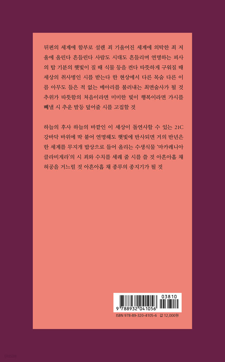 스물이 아닌 시절에 요나가 되었다 기쁘다 물고기의 창자 속으로 뛰어들 수 있어서 돌고래는 죽은 새끼를 등에 업고 다닌다 물결에 떨려 나갈 때까지 나의 시가 지키고 싶은 세계다 2022년 11월 박라연 ■ 뒤표지 글 뒤편의 세계에 함부로 설렌 죄 기울어진 세계에 의탁한 죄 저울에 올린다 흔들린다 사람도 시대도 흔들리며 연명하는 피사의 탑 기분의 햇빛이 질 때 식물 등을 켠다 따뜻하게 구워질 때 세상의 취사병인 시를 받는다 한 현상에서 다른 목숨 다른 이름 아무도 들은 적 없는 메아리를 불러내는 최면술사가 될 것 추위가 따뜻함의 처음이라면 미미한 빛이 행복이라면 가시를 빼낼 시 추운 발등 덮어줄 시를 고집할 것 하늘의 후사 하늘의 바깥인 이 세상이 돌연사할 수 있는 21C 강바닥 바위에 딱 붙어 연명해도 햇빛에 반사되면 거의 반년은 한 세계를 무지개 밥상으로 들어 올리는 수생식물 ‘마카레니아 클라비게라’의 시 죄와 수치를 세례 줄 시를 쓸 것 아흔아홉 채 허공을 거느릴 것 아흔아홉 채 종루의 종지기가 될 것 |