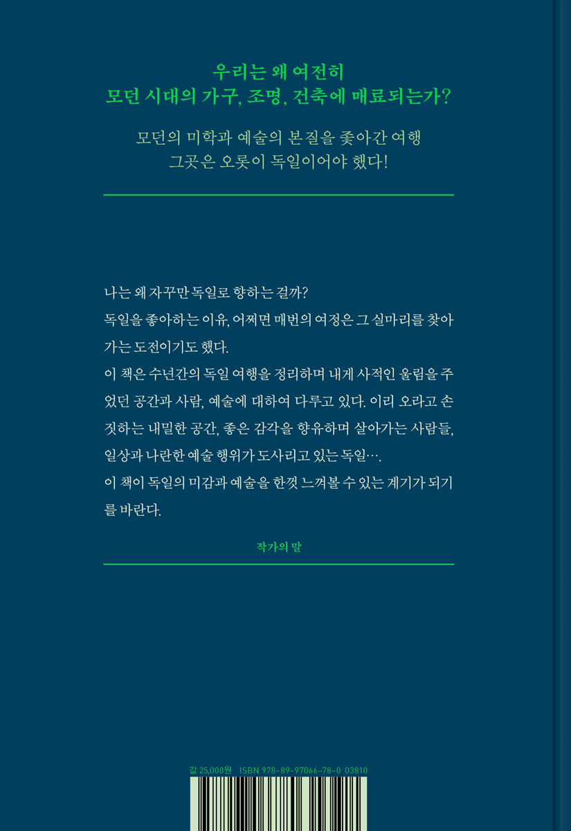 우리의 커다란 편견과 달리, 하나로 규정되지 않는 다채로운 미학이 독일 곳곳에 흩어져 있음을 오랫동안 독일을 여행하며 깨달았다. (…) 이 책은 수년간의 독일 여행을 정리하며 내게 사적인 울림을 주었던 공간과 사람, 예술에 대하여 다루고 있다. 이 책이 누구에게든 독일에 덧씌워진 편견의 꺼풀을 걷어내는 계기가 되기를 바란다.