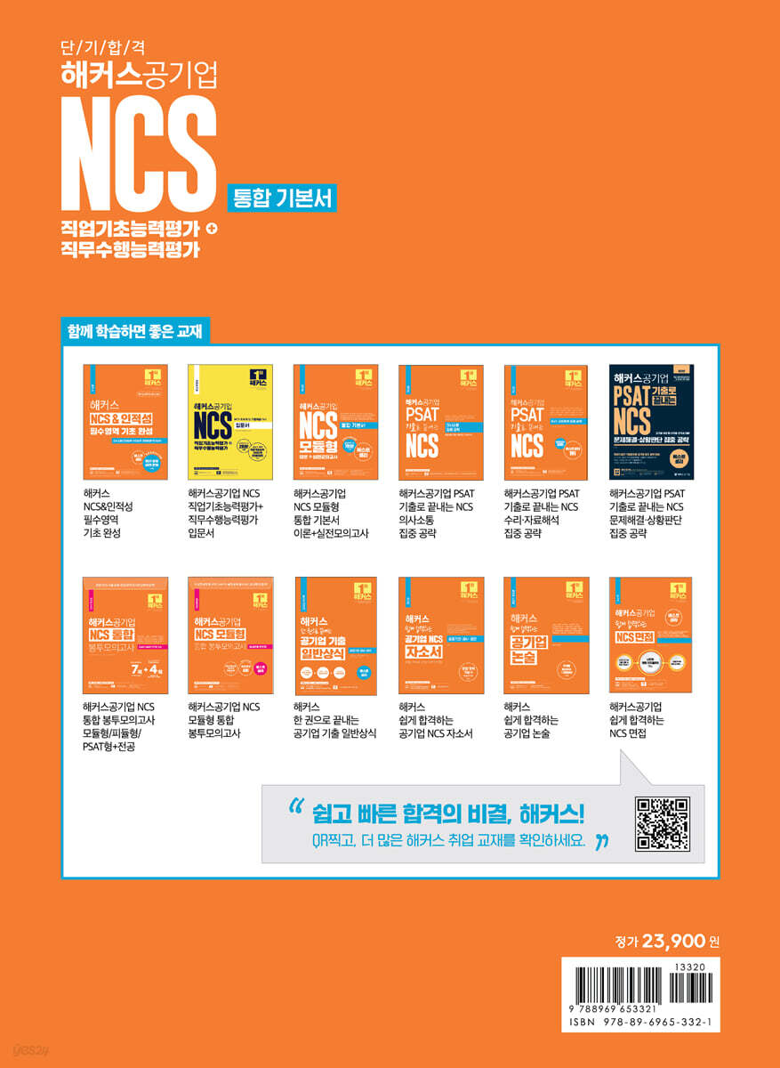 기획재정부 시행 ‘공공기관 채용박람회’ NCS 초청강사 집필! 공사 공단 및 금융권 필기 전형 대비 NCS 통합 기본서 [이런 분들에게 추천합니다] 1. 공사 공단 및 금융권 취업을 준비하는 분들 2. 모듈형부터 PSAT형 문제까지 NCS에 출제되는 기출 유형을 한 권으로 끝내고 싶은 분들 3. 이론 및 유형 학습부터 실전모의고사까지 NCS를 단 한 권으로 완벽하게 대비하고 싶은 분들 [해커스 교재만의 특장점] 1. 최신 출제 경향 및 기출 유형을 모두 반영한 이론과 문제로 실전에 완벽 대비! 1) 가장 최근 시행된 2022 시험까지 포함하여 최신 공기업 NCS 출제 경향을 철저히 분석 및 반영하였습니다. 2) 기획재정부 시행 ‘공공기관 채용박람회’의 NCS 초청강사가 집필한 높은 적중률의 교재로, NCS 10개 영역에서 최근 자주 출제되는 36개 기출 유형을 엄선하여 수록했습니다. 2. [실력 점검 테스트&학습 가이드]와 [맞춤 학습 플랜]으로 전략적 학습 가능! 본 학습 전 ‘실력 점검 테스트’ 및 ‘학습 가이드’로 자신의 실력과 학습 방향을 파악하고, ‘맞춤 학습 플랜’으로 자신의 실력에 따라 학습 플랜을 선택하여 전략적으로 학습할 수 있습니다. 3. 핵심이론부터 실전모의고사까지 한 번에 끝! 체계적인 3단계 학습 시스템 ● 1단계: NCS 핵심이론 학습하기 ① 핵심이론정리 ‘직업기초능력 가이드북’의 방대한 내용 중 꼭 알아야 하는 내용만을 엄선하여 단기간에 영역별 핵심 개념 학습이 가능합니다. ② 실력플러스노트 ‘직업기초능력 가이드북’에는 나오지 않지만 시험 문제 풀이에 필요한 상식 및 공식을 정리하여 시험에 출제되지만 놓치기 쉬운 개념까지 한 번에 정리할 수 있습니다. ● 2단계: 기출 유형별 전략 익히기 및 집중 문제 풀이 ① 대표기출유형 NCS 10개 영역별 최신 출제 경향 및 유형별 특징을 파악하고, 유형별 대응 전략을 익힐 수 있습니다. ② 적중예상문제 유형별 대응 전략을 실제 문제에 적용해보며 문제 풀이 실력을 키우고, 출제 가능성이 높은 문제를 미리 파악할 수 있습니다. ③ 고난도 PSAT형 문제 의사소통능력, 수리능력, 문제해결능력, 자원관리능력의 PSAT 기출 및 기출 변형 문제를 풀어보며 고난도 문제까지 철저히 대비할 수 있습니다. ④ 난이도별 문제 풀이 문제별 난이도 표시로 문제 풀이 후 본인의 실력을 정확히 파악하고 체계적이고 전략적으로 학습할 수 있습니다. ● 3단계: 실전모의고사로 실전 감각 키우기 의/수/문/자 통합형, 전 영역 통합형 등 실제 시험과 동일한 유형의 ‘실전모의고사 4회분’을 제한시간 내 풀고 실제 시험처럼 ‘OMR 답안지’에 직접 답을 체크하며 실전 감각을 극대화할 수 있습니다. 4. 서류부터 직무수행능력평가, 인성검사, 면접까지 모든 채용 단계를 한 번에 대비! 1) NCS 채용 가이드 및 NCS 합격 전략 NCS 기본 정보와 NCS 채용 단계별 합격전략을 한 번에 확인할 수 있습니다. 2) 직무수행능력평가 적중예상문제 경영/경제/행정/기계의 직무별 적중예상문제를 풀어보며 출제 비중이 높아진 직무수행능력평가도 철저히 대비할 수 있습니다. 3) 공기업 인성검사&면접 합격 가이드 인성검사 예시 문항과 기업별 면접 기출 질문까지 담아 인성검사와 면접 전형도 충분한 대비가 가능합니다. 5. 상세한 해설을 수록한 [약점 보완 해설집]으로 약점 극복은 물론 학습 시간 단축까지! 1) 모든 문제에 상세하고 이해하기 쉬운 해설을 제공하여 맞힌 문제뿐만 아니라 틀린 문제도 확실하게 학습할 수 있습니다. 2) 문제 풀이 시간을 단축시키는 ‘빠른 문제 풀이 Tip’, 문제와 관련된 개념 및 이론을 심화 학습할 수 있는 ‘더 알아보기’ 등 풍부한 학습 요소로 더욱 효율적으로 시험에 대비할 수 있습니다. 3) 표시된 문제별 유형을 통해 본인이 취약한 유형을 파악하고 관련 이론 및 문제를 복습하며 약점을 보완할 수 있습니다. 4) 실전모의고사 및 해설집에 수록된 ‘바로 채점 및 성적 분석 서비스’ QR코드를 통해 간편하게 채점하고, 응시 인원 대비 자신의 성적 위치와 학습 방향을 확인할 수 있습니다. [NCS 단기 합격을 위한 해커스만의 추가 학습 콘텐츠 - 해커스공기업(public.Hackers.com)] 1. 본 교재 인강(교재 내 할인쿠폰 수록) 2. 소원쌤의 시험장에서 통하는 수리 SKILL 강의 3. 실력 점검 테스트 해설강의 4. NCS 온라인 모의고사 5. 가이드북에 없는 NCS 필수 암기 노트 6. 초단기 완성 NCS 6개 영역 모듈이론 요약노트 7. 공기업 인성검사&면접 합격 가이드 8. 무료 바로 채점 및 성적 분석 서비스 9. NCS 5일 완성 무료 온라인 스터디 |