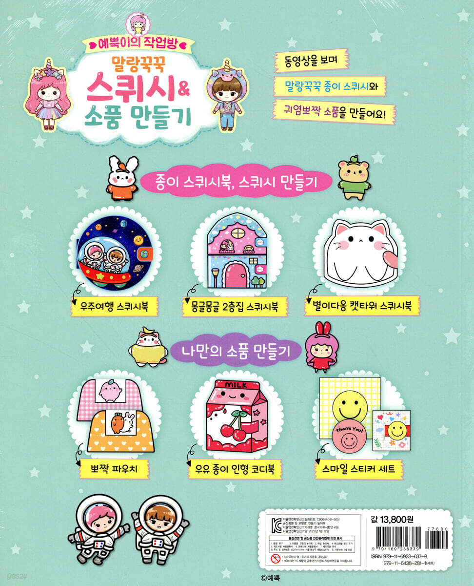 -준비물 소개 01. 별이다옹 캣타워 스퀴시북 02. 몽글몽글 2층집 스퀴시북 03. 우주여행 스퀴시북 04. 무지개 모찌 종이 스퀴시 05. 예뿍이의 종이 스퀴시 06. 스마일 스티커 세트 07. 토뿍&당근 냉장고 08. 뽀짝 파우치 *특별 부록 -예뿍이, 우기 스퀴시 인형 도안 -우유 종이 인형 코디북 도안 -별이다옹 캣타워 스퀴시북 도안 -몽글몽글 2층집 스퀴시북 도안 -우주여행 스퀴시북 도안 -무지개 모찌 종이 스퀴시 도안 -예뿍이의 종이 스퀴시 도안 -스마일 스티커 세트 도안 -뽀짝 파우치 도안 |