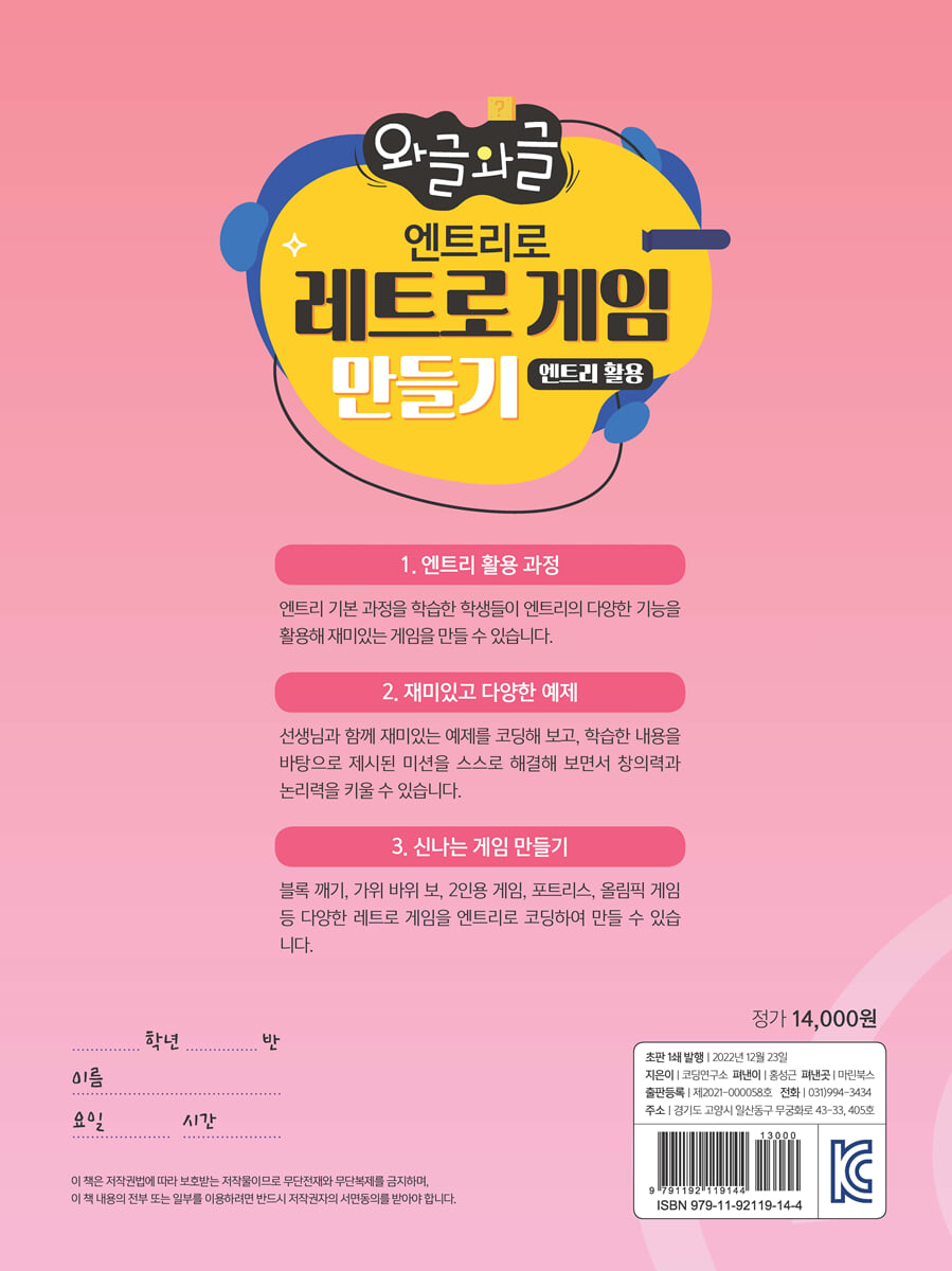 재미있고 신나게 코딩을 배우면서 논리력과 창의력을 키울 수 있습니다. “어려운 코딩도 엔트리로 쉽고 재미있게 학습” ‘게임’이라는 흥미 있는 테마를 중심으로 재미있고 즐겁게 코딩을 학습할 수 있습니다. “나만의 레트로 게임 만들기” 블록 깨기, 가위 바위 보, 포트리스, 자동차 부수기, 우주 전쟁 등 제공되는 코딩 및 이미지 소스를 활용하여 나만의 멋진 레트로 게임을 만들 수 있습니다. “실습 파일 제공” 교재에 사용된 모든 소스 파일과 완성 파일을 빠짐없이 제공합니다.(www.mrbooks.kr 자료실) |