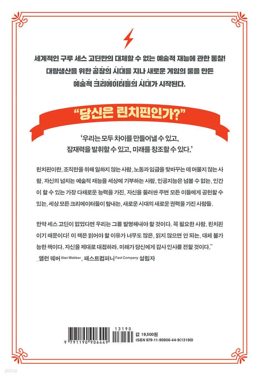 ---「공장의 시대 이후, 새로운 집단이 탄생하다」중에서 “시키는 일만이라도 제대로 하면 좋겠다.” “값싸게 쓸 수 있는 사람을 원한다.” “자꾸 지각하고 골치 아프게 하는 직원은 원하지 않는다.” 사장이 진정으로 이런 것을 원한다면, 회사에서 정한 규칙을 따르지 않는 뛰어난 직원들은 어떻게 해야 할까? 끊임없이 성장하는 사람들, 회사비용을 지출할 수 있는 권한을 가진 사람들, 다른 기업에서 스카우트 제의를 받은 사람들, 언론에 실리는 사람들, 개인비서를 쓰는 사람들은 어떻게 하겠는가? 회사에서 나가야 할까? 기업이 살아남기 위해서 진정으로 찾아야 할 사람은 예술가, 모든 것을 바꿀 사람, 꿈을 실현할 사람이다. 지금의 현실을 냉정하게 볼 수 있고 내일을 더 잘 예측할 수 있는 사람이다. 린치핀이다. ---「나는 어떤 선택을 했는가」중에서 학교가 직장과 닮은 것은 우연이 아니다. 감독, 규칙, 시험, 인성검사와 같은 것이 공장과 학교에서 모두 실시되는 것은 우연이 아니다. 이번 학기에 공부를 잘해야 다음 학기에서도 공부를 잘할 것이고, 졸업 후 직장에 들어가도 일을 잘할 것이다. 공부를 잘하지 못하면, 일을 잘하지 못하면, 규칙에 자신을 끼워 맞추지 못하면, 반항하면, 여지없이 시스템 밖으로 쫓겨날 것이다. ---「나는 어떤 선택을 했는가」중에서 볼링은 점근선의 스포츠다. 300점, 거기서 끝이다. 더 이상 올라갈 수 없다. 마치 품질을 개선하기 위한 식스시그마 접근방식과 비슷하다. 식스시그마의 목표는 지속적인 개선을 통해 궁극적으로 100만 개 생산제품 중 불량품을 3.4개 이하로 떨어뜨리는 것이다. 문제는 이 길에 들어서고 나면 놀라운 개선과 두드러진 혁신을 할 수 있는 여지가 사라진다는 것이다. 스트라이크를 10개 굴리든지 그렇지 못하든지 둘 중 하나다. 극적인 성공을 이뤄내는 조직은 항상 점근선이 존재하지 않는 시장, 점근선을 분쇄할 수 있는 시장에서 나온다. 볼링에서 320점을 얻는 방법을 찾는다면 대단한 선수로 기억될 것이다. 그런 방법을 찾지 못한다면 린치핀이 될 수 없다. 빨리 다른 운동을 찾아보라. ---「새로운 리더, 린치핀 선언」중에서 고객 서비스 담당직원이 불만을 터뜨리는 고객을 열렬한 팬으로 바꾸는 뛰어난 수완 역시 예술이다. 크레이그 뉴마크(Craig Newmark)가 인터넷을 이용해 광고시장에 혁명을 몰고 오는 사업 모델을 개발하고 성공으로 이끈 것 역시 예술이다. 에드 수트(Ed Sutt)가 더 나은 못을 발명해 수많은 생명을 구하고 돈도 번 것도 예술이다. 그래서 지금은 무엇이 예술을 예술로 만드는지, 또 예술이 무엇인지 정의를 내리는 작업이 중요하다. 그래야 예술이 나에게 쓸모가 있는지 없는지 판단할 수 있다. 내가 내린 예술의 정의로 돌아가 보자. “예술이란 상대방을 변화시키기 위한 선물이다.” 예술가란 예술을 창조하는 사람이다. 더 많은 사람을 바꿀수록, 사람들을 더 많이 바꿀수록, 더욱 훌륭한 예술가다. ---「언제까지 톱니바퀴로 살 것인가」중에서 우리는 저항이 존재한다는 사실을 안다. 수없이 느꼈을 것이다. 물론 그처럼 어렴풋한 느낌에 특별한 이름을 붙이지 않았을 것이고, 그러한 모든 증상을 인지하지 못했을 것이다. 하지만 그것이 자신의 일부라는 사실을 확신할 수는 있다. 나는 지금껏 수많은 저항이 개인, 팀, 기업을 파괴하는 모습을 보았다. 저항은 불손하고 영악하다. 온갖 질병으로 몸을 힘들게 만들고 어떤 일이든 질질 끌게 만든다. 무엇보다도 합리화를 만들어낸다. 끊임없이 자신을 합리화한다. 어쩌면 지금 당신도 경험하고 있을지 모른다. ---「왜 남보다 튀는 것을 두려워하는가」중에서 선물은 우리의 예술가적 욕구를 만족시켜줄 뿐 아니라 세상을 향해 나눠줄 것을 많이 가지고 있다는 사실을 알리는 신호다. 이러한 신호는 사람들을 끌어들인다. 자신의 컵에 물이 많을수록 더 많은 사람들이 그 물을 마시러 찾아오는 것과 마찬가지다. 파티에서 나를 만난다면 돈을 내지 않아도 좋으니 마케팅에 대한 조언을 구하기를 바란다. 나는 사람들이 내가 하고 싶은 말에 기꺼이 귀 기울여줄 때마다 황홀하고, 내 생각을 나눌 수 있다는 사실만으로도 기쁘다. 선물은 받는 사람이 누리는 가치보다 주는 사람이 누리는 가치가 훨씬 크다. ---「선물의 힘」중에서 실험 조수는 지시받은 일을 한다. 과학자들은 다음에 무슨 일을 해야 하는지 궁리한다. 과학자가 놀라는 것은 놀랄 일이 아니다. 자신의 일을 제대로 수행해도 당황스러운 일이 벌어진다. 탐험하고, 직감을 따르고, 풍경을 조망하고, 새로운 계획을 짜는 일이 과학자가 하는 일이다. 스스로 놀랄 수 있도록 준비하는 것은 의식적인 선택이다. 과학자들은 모든 것을 완벽하게 이해하고 확정할 수 있다고 생각하지 않는다. 모퉁이를 돌 때마다 새로운 논증이 나타나고 미스터리가 나타난다는 사실을 안다. 결국 지도는 결코 완성되지 않는다는 뜻이다. 인간의 게놈을 처음으로 해석한 크레이그 벤터(Craig Venter)는 다음에 뭘 해야 하는지 알려주기를 기다리지 않았다. 다음에 무엇을 해야 하는지 아는 것이야말로 바로 린치핀이 필요한 이유다. ---「지도 없