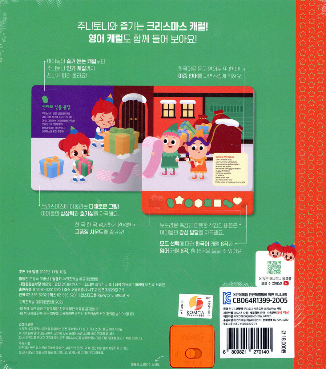 ‘주니 토니’는 글로벌 500만여 명의 구독자, 누적 조회 수 43억 뷰를 기록한 유튜브 ‘주니토니 동요동화’ 채널의 주인공입니다. 호기심 많은 돌직구 소녀, 주니와 능청스러운 해결사 소년, 토니가 들려주는 수많은 콘텐츠는 우리나라뿐만 아니라, 영어·중국어·스페인어·인니어 등 다양한 언어로 전 세계 어린이들의 마음을 사로잡고 있습니다. 주니토니 유튜브에서만 들을 수 있었던 캐럴을 이제 사운드북으로도 들어 보세요. 사운드북에서 흘러나오는 신나는 캐럴을 들으며 언제 어디서나 크리스마스 분위기를 느껴봐요! 한국어로 한 번 듣고 영어로 또 한 번! 누구에게나 사랑받는 인기 캐럴부터 주니토니 유튜브에서만 들을 수 있는 특별한 캐럴까지! 주니토니가 엄선한 ‘Best 8’ 캐럴을 사운드북에 알차게 담았어요. 모드 버튼을 선택하면 한국어 캐럴 8곡과 영어 캐럴 8곡(총 16곡)을 들을 수 있어요. 두 가지 언어로 캐럴을 듣다 보면 아이들의 이중언어 실력이 쑥쑥 늘어나요! 품질과 안전은 기본, 활용도는 더 높게~ 누를 때마다 기분 좋은 촉감의 노래 버튼 8개, 한국어, 영어 모드 전환 버튼, 2단계로 음량을 조절하거나 전원을 끌 수 있는 전원 버튼 등 총 10개의 버튼을 조작할 수 있어요. 귀를 편안하게 하는 고품질 사운드는 기본! 내 목소리로 노래 부르고 싶은 아이들 마음, 너무 큰 음량은 부담스러운 부모님 마음까지 세심하게 살펴 만들었습니다. 안전을 위해 모서리는 둥글게 처리하고 어린이 제품 안전 검사를 거쳐 KC 인증 마크를 획득한 제품이니 안심하고 사용하세요. |