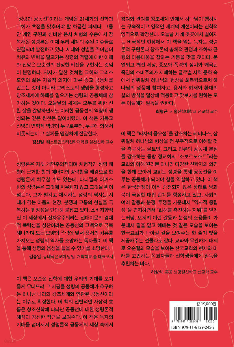 성령론은 자칫 개인주의적이며 체험적인 성령 체험에 근거한 힘과 에너지의 강력함을 배경으로 한 성령론에 치우칠 수도 있는데, 다니엘라 어거스틴의 성령론은 그것에 치우치지 않고 그것을 뛰어넘는다. 그가 펼치고 제시하는 성령의 역사는 시대가 겪는 아픔의 현장, 분쟁과 고통의 현실을 극복하는 현장성을 단단히 붙잡고 있다. 소비지향적인 이 세상에서 신자유주의라는 전대미문의 경제적 폭력성을 성찬이라는 공동선의 고백으로 극복해나가며 모든 모양의 폭력에 맞서 용서의 치유를 가져오는 성령의 역사를 소망하는 독자들이 이 책을 통해 성령의 음성을 들을 수 있기를 소망한다. - 김종일 (동네작은교회 담임, 개척학교 숲 대표코치)