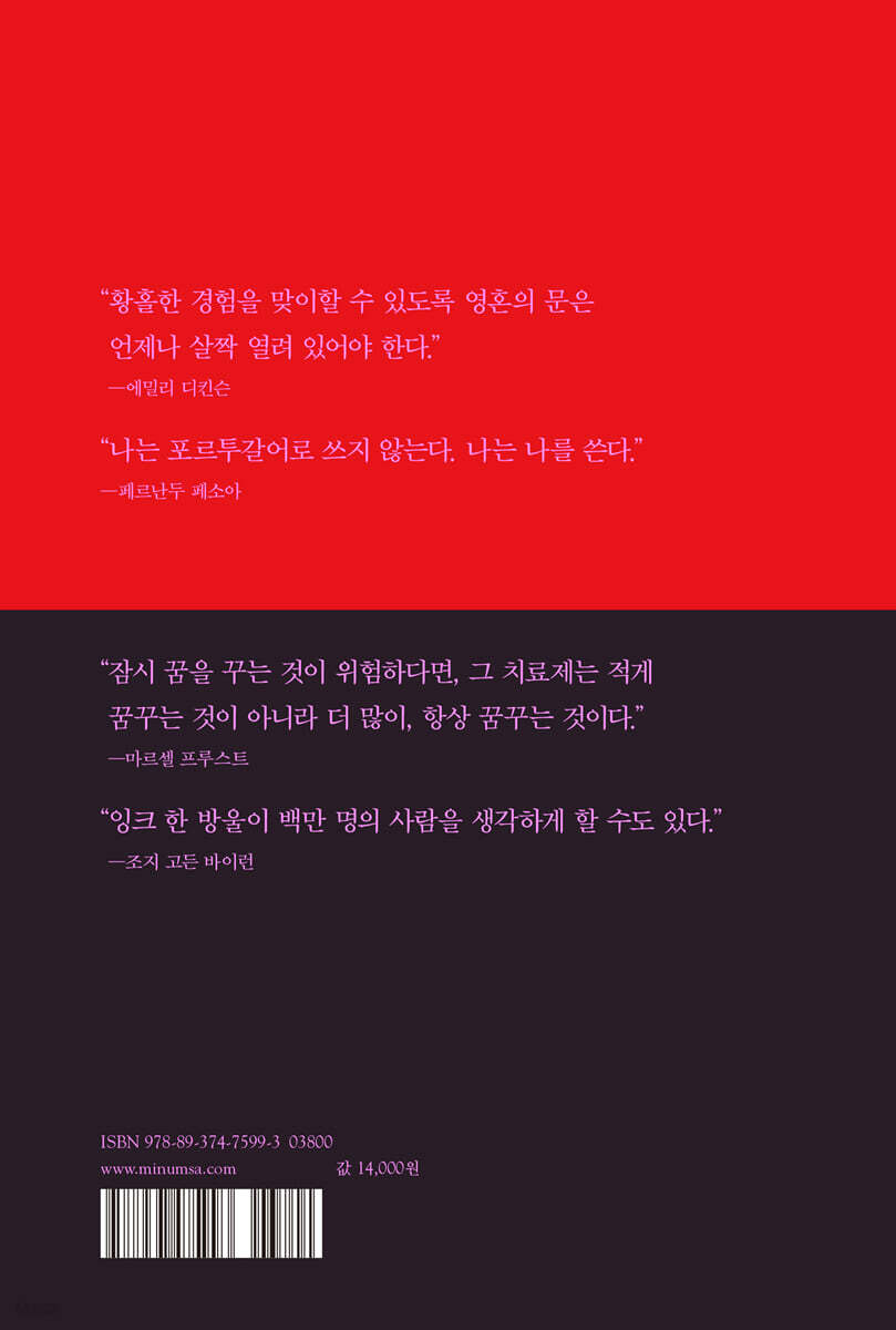 에밀리 디킨슨, 페르난두 페소아, 마르셀 프루스트, 조지 고든 바이런의 시를 선별하여 엮은 세계시인선 필사책 19세기를 대표하는 시인 에밀리 디킨슨, 페르난두 페소아, 마르셀 프루스트, 조지 고든 바이런의 작품을 선별하여 엮은 민음사 세계시인선 필사책 『밤을 채우는 감각들』이 출간되었다. 세계시에 친숙하게 다가가지 못했던 독자들, 세계시를 음미하고 싶었던 독자들을 위해 민음사 세계시인선 『고독은 잴 수 없는 것』, 『시는 내가 홀로 있는 방식』, 『시간의 빛깔을 한 몽상』, 『차일드 해럴드의 순례』에서 접할 수 있었던 작품 중 한 번 더 깊이 감상하면 좋을 시들을 엄선하였다. 고독과 허무, 죽음을 주제로 했던 에밀리 디킨슨은 우주적 사색을 짧은 글에 담은 시인으로, 삶과 죽음의 의미에 대해 따라 읽고 쓰며 숙고하기 좋은 작품들을 써냈다. 소박하게 더듬거리는 말로 인간의 가슴은 듣고 있지 허무에 대해- 세계를 새롭게 하는 힘인 ‘허무’- -에밀리 디킨슨, 「소박하게 더듬거리는 말로」 ‘시인들의 시인’이라 불리는 페르난두 페소아는 철학을 가장 시적으로 담아냈다는 평가를 받는다. 70개가 넘는 이명(異名)을 사용하여 각기 다른 문학적 자아를 창조했으며, 그중 이명들의 스승이자 페소아가 “유일한 자연 시인”이라고 칭한 알베르투 카에이루, 그리스 철학을 애호하는 리카르두 레이스의 시가 필사책에 실려 있다. 생각한다는 건 바람이 세지고, 비가 더 내릴 것 같을 때 비 맞고 다니는 일처럼 번거로운 것. 내게는 야망도 욕망도 없다. 시인이 되는 건 나의 야망이 아니다. 그건 내가 홀로 있는 방식. -페르난두 페소아, 「양 떼를 지키는 사람」 중에서 제임스 조이스, 프란츠 카프카와 함께 20세기 현대문학을 연 마르셀 프루스트는 필생의 대작 『잃어버린 시간을 찾아서』로 공쿠르상을 수상했다. 필사책에는 그 단초가 된 산문시집 『시간의 빛깔을 한 몽상』 중 자연과 심리 묘사가 유연하게, 음악적으로 표현된 시를 발췌하였다. 욕망은 영광보다 더 우리를 도취시킨다. 욕망은 모든 것을 아름답게 꽃피우지만, 일단 소유하게 되면 모든 게 시들해진다. 마찬가지로 자신의 삶을 꿈꾸는 것이 현실에서의 삶보다 더 낫다. 되새김질하는 짐승의 우매하고 산만한 꿈처럼, 어둡고 무거워 신비감이나 명확성이 떨어질지라도 꿈은 좋은 것. 삶 자체가 어차피 꿈꾸는 것이긴 하지만 말이다. -마르셀 프루스트, 「꿈으로서의 삶」 중에서 19세기 영국의 대표 낭만주의 시인 조지 고든 바이런은 젊음과 열정, 모험을 대표하는 시인으로, 「차일드 해럴드의 순례」가 대표작으로 꼽힌다. 그중 특히 바이런의 낭만적, 영웅적 면모가 드러난 시들을 필사책에 실었다. 자, 나의 작은 배여, 너와 더불어 어서 가자, 거친 바다를 가로질러 다시 고향만 아니라면 어느 나라로 날 싣고 가든 상관없다. 오너라, 어서 오너라, 검푸른 파도여, 이윽고 그 파도 내 눈길에서 사라질 때 오너라 사막도 동굴도. 고향이여, 잘 있거라! -조지 고든 바이런, 「이별」 중에서 |