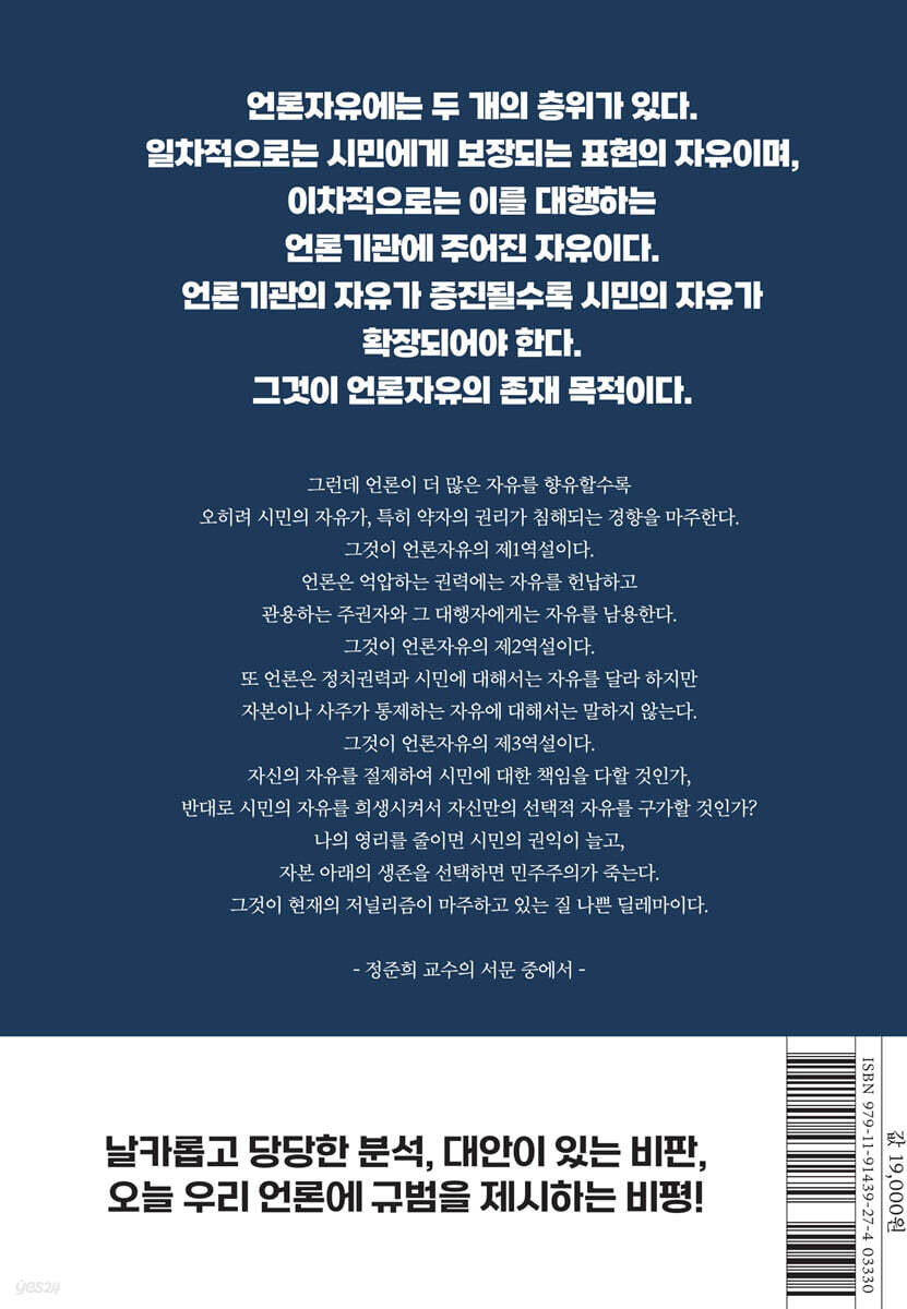 ---「여는 말 ‘탄탈로스의 형벌, 혹은 물난리 속의 마실 물 같은 언론자유’」중에서 표현의 자유와 언론의 자유가 서로 구분되는 자유가 아니라면 기자에게만 두 가지 자유를 모두 부여할 그 어떤 도덕적 명분도, 법적 근거도 없다. 반대로, 기자가 스스로에게 부여된 자유는 표현의 자유 단 하나뿐이라고 생각한다면, 그래서 기자와 기자가 아닌 시민 사이에 아무런 권리의 차이가 없다고 주장한다면 이것은 기만이다. 국가와 정부는 기자에게 일반 시민들에게는 허용되지 않은 공간과 정보에 대한 접근을 허락하고 있다. 기자는 매일 대통령실에서 대통령을 만나 질문을 할 수 있고, 외국 순방에 나서는 대통령을 취재하기 위해 대통령 전용기에 동승할 수도 있다. 시민들에게는 허용되지 않는 이 모든 ‘특권’이 표현의 자유를 행사한 결과라고 할 수 있겠는가? 기자에게는 표현의 자유와 함께 언론의 자유가 보장되어 있기 때문에 누리는 특권이 있다. ---「1장 ‘언론의 자유는 언론을 위한 특권인가, 모두를 위한 자유인가?’」중에서 언론이 시민을 대리한다는 관념은 정말 허구적인 것일까? 최소한 자유주의에서는 그렇다. 시민과 동등한, 시민의 한 유형인 언론이 시민을 대리할 수 없고 시민의 알권리를 명분으로 언론에 부과되는 사회적 책무는 언론(과 그 소유주)의 언론자유에 대한 간섭이 될 수 있 다. ‘기레기 담론’과 같은 언론에 대한 신랄한 비판은 대리자로서 의 무를 제대로 이행하라는 정당한 요구가 아니라 언론자유에 대한 심 각한 위협으로 간주된다. 언론을 사회적 제도로 인정하고 시민의 알 권리를 대리한다는 공적 기능을 정당화하기 위해서는 자유주의를 넘어서는 그 무엇이 필요하다. ---「2장 ‘언론자유라는 도그마와 언론의 책무’」중에서 종이신문의 구독자수와 그에 바탕을 둔 구독료 매출은 지속적으로 줄어들었고, 그만큼 광고 수입과 (수익 목적의 컨퍼런스 개최 등, 언론 행위와는 거리가 먼) 기타수익사업의 비중이 크게 확대되고 있다. 광고 재원의 질도 급격히 나빠졌다. 파급력은 물론 영향력과 신뢰성에 수반되는 ‘후광효과’에 대해 큰돈을 지불하던 광고주 대신, 페이지뷰 단위로 푼돈을 매겨주는 소형 광고주나 아예 기사 자체를 홍보도구로 활용하겠다는 광고주가 크게 늘었다. 이것은 언론자유를 ‘시장 행위의 자유’와 사실상 동일시했던 자유주의 상업언론이 맞부딪힌 필연이라고도 볼 수 있지만, 무엇보다 디지털 플랫폼 주도의 저널리즘 기술 환경 변화와 그에 부응하여 자신의 문화적 권위를 효과적으로 재구축하지 못했던 언론 자신의 실패에 기인하는 바가 크다. 기술 환경의 변화와 그에 따른 문화적 권위의 상실, 또 그에 결합되어 나타난 경제적 재생산 구조의 불안정성 증대. 바로 그것이 현재 언론 문제를 ‘신뢰의 위기’라는 틀을 통해 진단하는 배경이다. ---「3장 ‘언론자유 개념의 사회학적 실패 혹은 자기과장’」중에서 이런 상황에서 언론자유는 언론의 무한 경쟁을 보장하고, 자본의 언론 지배를 공고하게 해주는 도구로 사용된다. 언론이 자본주의하에서 이윤 추구를 목표로 할 때 언론자유는 체제 유지를 위한 수단으로 전락하고 만다. 따라서 경합적 민주주의에 기반을 두고 사회적인 담론의 경쟁을 활성화하려는 노력과 함께, 언론 환경이 점점 더 기득권을 옹호하고 사회적인 약자에 대한 착취를 강화하는 현상을 해소하려는 비판적인 디지털 정치경제학 차원의 노력이 함께 중요해지게 된다. 이러한 사회철학적인 기반 위에 실질적으로 수용자들이 할 수 있는 방안을 고민해볼 수 있다. 현재 언론 수용자 입장에서 시도해볼 수 있는 방안은 우선 언론 수용자노조를 결성하여 주목 노동의 착취가 이루어지는 것과 비례하여 수용자로서 정당한 권리와 통제권을 가져오는 것이다. 또한, 현재 언론의 콘텐츠가 불만스럽다면 과감한 시민 불복종civil disobedience 운동의 한 형태로 ‘언론 보지 않기 운동’을 펼쳐가는 것이다. 이러한 운동은 언론을 거부하는 운동이 아니라 언론을 시민의 통제권하에 두면서 공론의 장을 활성화하기 위한 장치로 거듭나게 하려는 것이다. ---「4장 ‘언론자유의 패러독스와 시장 모델의 실패’」중에서 현재의 불평등과 소외 및 자유의 침해 문제들을 극복하기 위해서는 기존의 표현의 자유 개념을 소통의 권리 개념으로 대체해야 한다. 사회적 소통과정에서 특정 언론과 집단 및 단체만이 표현의 효 과를 독과점하고 있으며 시민들은 단절되어 있거나 고립되어 있는 상태에서 독백적으로 표현할 뿐이며, 종종 적극적으로 서로를 배제하거나 혐오한다. 언론과 표현의 자유를 소통의 권리로 전환하기 위해 소통의 기본적 원칙들을 확인하여 이를 토대로 해당 헌법의 개정 작업을 해나가야 한다. 언론과 시민과의 관계를 전면적으로 새롭게 구성하기 위해 지금 우리에게 요구되는 것은 급진적인 소통 공간의 창출이며 그것의 핵심적 조직 원리로 ‘평등성’, ‘수행성’, ‘상호성’이 되어야 한다. ---「5장 ‘표현의 자유에서 소통의 권리를 위한 헌법 개정’」중에서 우리 언론은 국가에 의해 억압받는 다른 언론과