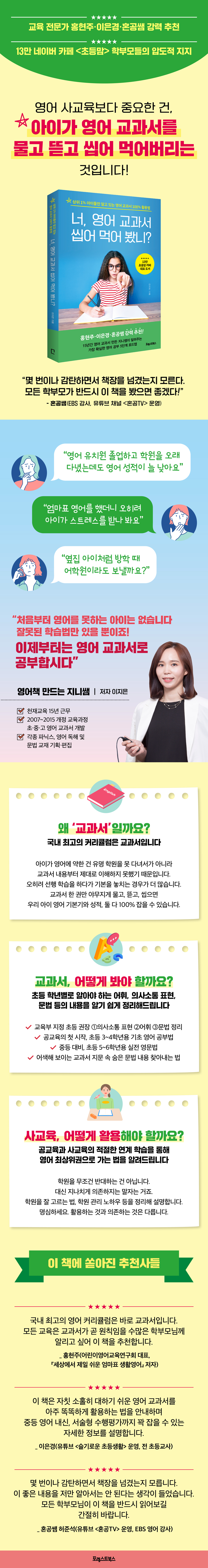PART 1. 이론편 CHAPTER 1. 수능 만점자가 교과서만 봤다고 말하는 이유 진짜 공부 잘하는 아이는 교과서로 공부합니다 ? 교과서를 다르게 볼 줄 아는 아이들 ? 원칙을 배워야 틀 밖에서도 자유로울 수 있다 ? 학교 수업보다 더 중요한 것은 없다 교육과정을 알아야 아이 공부법이 보인다 ? 2015 개정 교육과정 초·중·고 각 단계별로 톺아보기 ? 자녀를 꼭 좋은 대학에 보내고 싶다면 부모가 반드시 알아야 하는 여섯 가지 핵심 역량 ? 영어 과목에서 요구하는 핵심 역량에 대하여 초등 영어는 간단한 의사소통 위주라 쉽다? ? Top Down vs. Bottom Up ? 실제 교실에서 영어 수업은 어떻게 진행될까 ? 우리 아이 현재 영어 수준 점검해보기 영어 교과서는 왜 학교마다 다를까 ? 미국은 교과서라는 개념이 없다? ? 다섯 개 출판사가 각각 만드는 우리나라 초등 영어 교과서 CHAPTER 2. 공교육 영어에 대한 편견, 깨드립니다 공교육이 반드시 필요한 이유 ? 대학이 성공의 마중물인 시대는 끝났다 ? 좋은 성적은 좋은 태도에서 나온다 회화도 학교에서 충분히 배울 수 있다 ? 초등 권장 표현 목록 초등 권장 어휘 800개의 진실 ? 초등 권장 어휘 목록 ? 필수 목록 외에 반드시 알아야 하는 것들 문법은 교과서 속에 숨어 있다 ? 초등 권장 문법 목록 학원만 잘 다니면 된다는 아주 큰 착각 ? ‘덜 배워서’ 아닌 ‘더 배워서’ 문제다 ? 학원 정보는 잘 알면서 아이 교과서는 잘 모르는 현실 ? 공부 잘하는 아이들이 의외로 잘 놓치는 것 CHAPTER 3. 학부모 필독! 영어 교육과정 이것만 기억하세요 과거를 알아야 미래도 알 수 있다 ? 2022 개정 교육과정 미리 보기 공교육 영어, 알고 보면 다 계획이 있다 ? 교과서 속 대화 지문은 왜 어색할까 ? 교과서는 혼자 공부하는 책이 아니다 ? 아이 공부 자신감을 키워줄 최상의 교재 영어 교과서에 문자는 없고 그림만 있는 이유 ? 교육부의 숨은 의도 파악하기 ? 디지털 교과서로 보고 들으며 학습하는 법 ? 언어는 문화로 배우는 것이다 부모의 조바심을 다스려야 아이의 영어력이 자란다 ? 초등 엄마들이 말하는 학교 공부의 현실 ? 언제까지 ‘빨리 빨리 공부’에 끌려다닐 건가요? ? 교과서부터 철저하게 끝내라 PART 2. 실전편 CHAPTER 4. 영어 교과서 제대로 씹고, 뜯고, 맛보는 법 공교육의 첫 시작, 초등 3~4학년 영어 공부법 ? 알파벳과 파닉스를 100% 안다는 것 ? 3학년 첫 영어 수업, 어떻게 대처하면 좋을까 - 문제집 대신 다른 학교 교과서를 준비하자 주제별·상황별 영어 표현 본격적으로 익히기 - 주제별 영어 표현 소재 목록 의외로 교과서에서 다루지 않는 주제 - 동식물 - 우주 중학교를 준비하는 초등 5~6학년 영어 공부법 - 기본 시제 - 8품사 - 명사의 단수와 복수 - 평서문, 부정문, 의문문 - 동사의 종류 및 시제(규칙, 불규칙) & 불규칙 동사표 - 조동사 - 비교급 - 의문사 - 초등 때 하지 않아도 되는 문법 - 독해 공부법 - 쓰기 공부법 CHAPTER 5. 최상위권으로 도약하는 영어 공부법 학교 교과서‘만’ 하는 것과 학교 교과서‘를’ 하는 것의 차이 - 교과서 내용 제대로 이해하고 학원에 간 거 맞나요? - 옆집 아이만 보지 말고 옆집 부모도 보자 실용 영어 vs. 수능 영어, 둘 중 무엇이 먼저일까 - 첫아이 엄마가 가장 흔히 하는 실수 - 유튜브로 영어 노출하는 법 - 영어 원서 읽기 시작하는 법 학원에서 이런 부분을 보충하면 좋아요 - 학원 레벨 테스트 잘 보는 법 - 초등학생 자녀의 학원 관리법 세 가지 - 인터넷 강의 활용법 - 활용하는 것과 의존하는 것은 다르다 중학교 교과서와의 연계성 - 내신 공부법 - 서술형 대비법 - 로마는 하루아침에 이루어지지 않았다 부록 - 초등학교 3~6학년 출판사별 목차 모음 - 중학교 1~3학년 출판사별 문법 목록 모음 참고 문헌 |