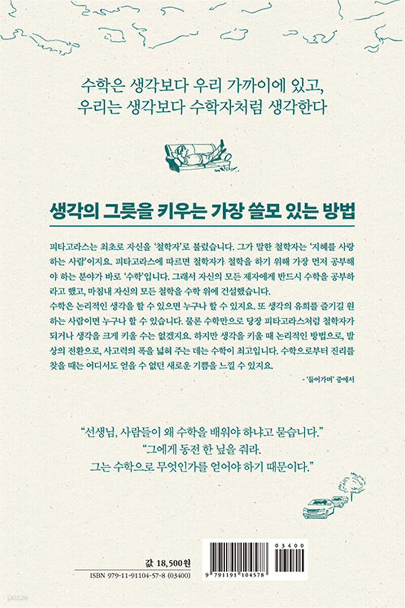 --- p.17 수학을 잘하는 사람들은 대체로 실생활에서 접하는 다양한 문제를 논리적으로 잘 해결합니다. 어떤 사람은 ‘나는 학교 다닐 때 수학을 잘하지는 못했지만 주변의 문제는 논리적으로 해결할 수 있다’라고 주장한다면, 이미 그의 머릿속에서 자신도 모르는 사이에 수학적 사고가 일어나서 논리적으로 쉽게 해결하는 사람입니다. --- p.51 음에 대한 수학적 분류를 오래 전 고대에 이미 했던 사람이 있습니다. 바로, 피타고라스입니다. 그는 사람들이 쉽게 음악을 연주하고 들을 수 있도록 음악적 체계를 세웠는데, 바로 ‘피타고라스의 음계’라고 알려진 ‘도, 레, 미, 파, 솔, 라, 시, 도’ 8음계입니다. 피타고라스는 음악의 가치를 귀하게 생각했습니다. 수학과 마찬가지로 사람들에게 자연의 구조를 볼 수 있게 하고, 몸과 마음을 정화시켜 우리의 육체와 영혼을 완벽하게 유지할 수 있다고 생각했지요. 피타고라스는 이성적으로 판단할 수 있도록 음악을 어떻게 체계화할 것이며, 정확한 소리를 내는 악기를 어떻게 만들지를 궁리했습니다. --- p.77 허준이 교수의 ‘연결’과 ‘구조’에 대한 연구는 현대의 많은 기술이 통신과 네트워크, 복잡계 등과 연결되어 있기에 현대 사회에서 갖는 의미가 큽니다. 특히 오늘날 컴퓨터 연산, 인공지능, 빅데이터 등에 활용되는 알고리즘은 모두 조합론의 대표적인 응용 분야이므로 허준이 교수의 연구 결과에 영향을 많이 받을 것으로 예측됩니다. 허준이 교수의 연구 업적은 정보통신뿐 아니라, 반도체 설계, 교통, 물류, 통계물리 등 여러 분야에 밀접한 관련이 있어 파급효과가 크리라 기대됩니다. --- p.91 가우스의 선생님은 자신이 잠깐 편하게 쉬기 위해서 학생들에게 어려운 수학 문제를 냈습니다. 1부터 100까지를 더하라는 덧셈 문제였지요. (…) 가우스는 선생님이 낸 문제에 일정한 규칙이 숨어 있다는 사실을 알았습니다. 즉 다른 학생들처럼 1부터 차례로 더하지 않고, 1과 맨 마지막 수인 100을 더하면 101, 다시 2와 99를 더해도 101, 3과 98을 더해도 101이라는 사실을 알았지요. 이와 같이 더하면 모두 50개의 101이 되므로 가우스는 1부터 100까지의 합은 50×101=5,050이라고 아주 간단히 정답을 냈습니다. 바로 임의의 등차수열의 합을 구하는 공식을 유도할 때 사용하는 ‘등차수열의 대칭성’을 활용하여 문제를 해결했던 것이지요. --- p.97 수학을 공부하면 문제를 해결하는 방법과 단순히 암기하는 머리가 아닌, 생각하고 이해하는 머리를 쓰는 훈련을 하게 됩니다. 즉, 우리는 수학으로 두뇌 훈련을 하지요. 학교에서도 두뇌 훈련 형식의 수학을 배우는데, 이때 수학은 학년이 올라갈수록 점점 숫자가 아닌 문자를 사용하는 수식으로 가득 차 있습니다. 수식을 이용하여 논리를 펴는 수학의 형식은 분야를 막론하고 사용되기 때문에 효과적으로 응용할 수 있습니다. --- p.195 기억력, 주의력을 키우기 위해 피타고라스의 제자들은 아침에 눈을 뜨자마자 다음과 같은 경구를 읊었다고 합니다. ‘눈을 뜨자마자 해야 할 것은 오늘 해야 할 일을 차례대로 생각하는 것이다.’ 그리고 잠들기 전에는 다음과 같은 경구를 암송하며 하루를 반성하고 잠이 들었다고 하지요. ‘오늘 자신이 한 일을 세 번 되돌아보기 전에는 눈을 감고 잠들지 말라. 잘한 일은 무엇이고, 잘못한 일은 무엇인가? 또, 끝내지 못한 일은 무엇인가?’ --- p.251 |