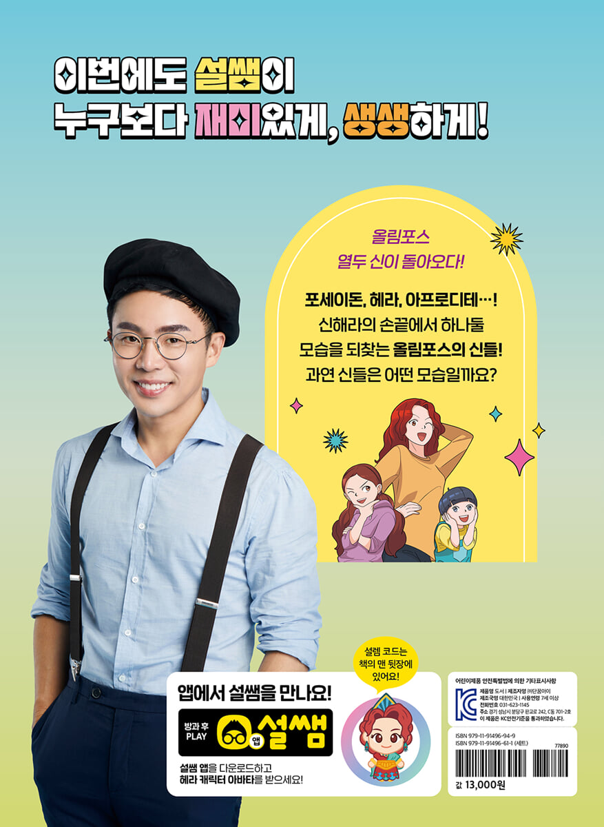 [설민석의 그리스 로마 신화 대모험]은 사람들에게 오랫동안 잊혀져 있던 올림포스의 신과 영웅들을 멋지게 되살려 냈습니다. 설쌤과 함께 떠나는 신화 대모험은 아주 특별한 경험이 될 것입니다. 김헌(서울대학교 인문학연구원 교수) [설민석의 그리스 로마 신화]를 재미있게 보는 5가지 방법! 하나! 설쌤이 들려주는 신들의 이야기에 빠져든다! 최고의 이야기 전달자 설쌤이 마치 직접 읽어 주는 듯한 신들의 이야기가 귀에 쏙쏙 들어와요. 둘! 내가 주인공이라고 상상한다! 만화가 신해라 가족에게 벌어진 신기하고 놀라운 일들이 내게 벌어진 일이라 생각하며 이야기에 흠뻑 빠져요. 셋! 보기 쉽게 정리한 신화 정보로 앎의 재미를 느낀다! 보기 쉽게 차근차근 설명한 깊이 있는 신화 정보로, 신화 속 세상에 한걸음 더 다가가요. 넷! 풍성한 시각 자료를 보며 마치 직접 본 듯 경험한다! 신화와 관련된 명화와 조각, 이야기의 배경이 되는 곳의 사진 등 풍부한 시각 자료로 신화의 다양한 모습을 경험해요. 다섯! 퀴즈에 도전하며, 신화 상식을 뽐낸다! OX 퀴즈, 다른 그림 찾기, 그림 퍼즐, 초성 퀴즈, 낱말 퍼즐, 색칠하기 등 재미난 놀이로 내용을 확인해요. |