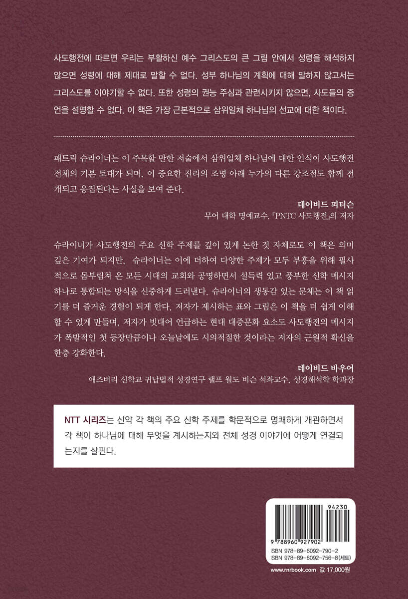 사도행전의 분량과 복합적인 요소를 감안하여 학자들은 신학 주제에 대해 다양한 후보군을 제시해 왔고, 어떻게 하면 그 모든 주제가 함께 조화를 이룰지 분석해 왔다. 패트릭 슈라이너는 이 주목할 만한 저술에서 삼위일체 하나님에 대한 인식이 사도행전 전체의 기본 토대가 되며, 이 중요한 진리의 조명 아래 누가의 다른 강조점도 함께 전개되고 응집된다는 사실을 보여 준다. 이 연구서는 사도행전의 메시지와 취지를 더 깊이 탐구하기 바라는 모든 독자에게 탁월한 자료가 될 것이다. - 데이비드 피터슨 (무어 대학 명예교수, 『PNTC 사도행전』의 저자)