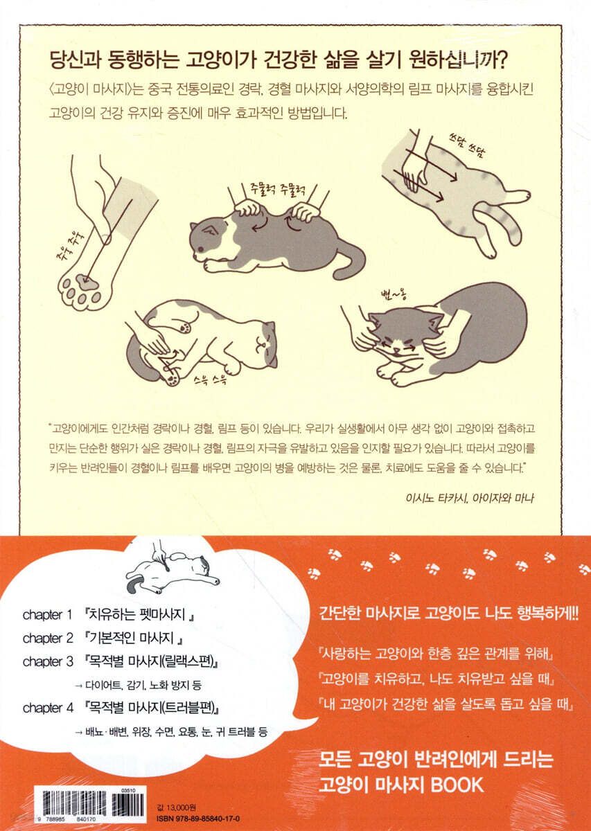 책머리에 고야이에게 치유받는 생활 chapter1 치유하는 펫 마사지 음양론 오행설 경락과 경혈 고양이 마사지를 시작하기에 앞서 마사지의 기본 테크닉 chapter2 기본적인 림프 마사지 림프란 4대 림프절 마사지 얼굴 마사지 손의 경혈 마사지 얼굴의 경혈 마사지 chapter3 목적별 마사지(릴랙스 편) 어깨결림 다이어트 스트레스 해소 노화방지, 면역력 향상 원기보충 chapter4 목적별 마사지(트러블 편) 배뇨 트러블 위장 트러블 배변 트러블 수면 트러블 체력 감퇴, 권태감 귀 트러블 눈 트러블 앞다리 트러블 뒷다리 트러블 요통 무릎 트러블 피부 트러블 감기 |