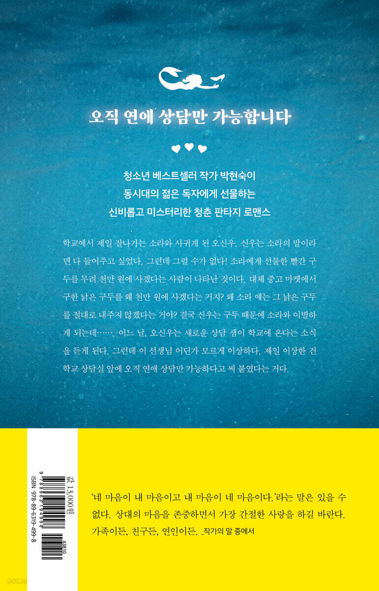 “맞아. 세상에 공짜가 어디 있냐?” “풋!” 소라가 웃었다. 그래, 돈이 삼백만 원이 들어온다는데 웃음이 나야 정상이지. 나는 소라를 따라 웃었다. “오신우. 너는 지금 웃음이 나오냐? 멍청하긴! 아휴, 내가 너랑 사귀는 사이라는 게 쪽팔린다. 나는 있잖아. 보이스 피싱에 홀딱 넘어가서 자기 신분증이랑 통장을 빌려주는 그런 멍청한 짓을 누가 하나, 되게 궁금했거든. 지금 당장 돈을 현금으로 찾아다가 냉장고 안에 넣어 두라는 말에 시키는 대로 하는 사람이 있다고 그러잖아? 나는 그런 거 다 뻥인 줄 알았거든. 그런데 딱 너 같은 사람들이 그렇게 하겠다. 바보인 거니, 세상 물정을 모르는 거니?” “야! 내가 미쳤냐? 냉장고에 돈을 넣어 놓게?” “됐고. 나는 30퍼센트 필요 없으니까 너 혼자 다 먹어. 나는 통장 빌려주고 범죄에 연루되고 싶지 않아. 너랑 나란히 잡혀서 경찰서에 잡혀가고 싶지 않다고.” --- p.16 학교가 뒤숭숭했다. 김나성이 생각보다 많이 다쳤다고 했다. 양심이라는 것이 시도 때도 없이 불쑥불쑥 고개를 쳐들려고 했다. 그럴 때마다 나는 나에게 외쳤다. 달팽이껍질 속에 그냥 가만히 처박혀 있어! 네가 밝힐 필요 없어. 언젠가는 김나성이 밝힐 거야. 아닌 말로 맞은 김나성이 입을 다물고 있는데 내가 뭔 상관이람? “누군지 모르지만 강심장이야. 어떻게 학교 운동장에서 싸울 생각을 하냐? 아무리 넓어서 싸우기 좋아도 그렇지. 학교잖아, 학교! 대체 누구냐? 김나성은 왜 입을 다물고 있는 거야? 속 시원히 누구한테 맞았는지 말하지.” 아이들은 김나성이 왜 침묵하는지 궁금해했다. --- p.64 주변이 어둑어둑해져서야 나는 길게 한숨을 내쉬며 돌아섰다. 이미 우산은 필요 없었다. 나는 우산을 접어 들었다. 분리수거 장이 있는 건물을 돌아설 때였다. 나는 걸음을 멈췄다. 저만큼 빗속에 서 있는 사람의 모습이 보였다. 상담 선생님이었다. ‘뭐 하는 거야?’ 나는 내 눈을 의심했다. 상담 선생님이 하늘을 향해 두 팔을 펄럭이고 있었다. 쏟아지는 비를 그대로 맞으며 말이다. 날개가 젖어 날 수 없는 나비처럼 상담 선생님은 애타게 두 팔을 펄럭였다. 그 모습은 물길을 헤쳐 나가는 물고기 같았다. 상담 선생님은 한 번씩 고개를 쳐들고 빗물을 받아 마셨다. ‘미쳤나 봐.’ 절대 정상적인 사람의 모습은 아니었다. 어둠은 더 짙어지고 비바람도 더 심해졌다. 어둠에 가려 상담 선생님은 더 이상 보이지 않았다. 집으로 돌아와서도 충격은 가시지 않았다. --- p.92 상담 선생님 얼굴이 환해졌다. 뭔가 설레는 듯한 상담 선생님 표정을 보자 양심의 가책이 느껴졌다. 미안했다. 하지만 나는 생각을 다르게 하기로 했다. 빨간 구두를 찾아 주는 일은 못 해도 다른 뭔가로 상담 선생님을 도와줄 일이 생길 수도 있을 거다. 그러면 그 일에 최선을 다할 거라고. 어찌 생각하면 나 스스로를 위로하는 생각이었다. 내가 상담 선생님을 도와줄 일이 뭐가 있을 거라고. “선생님. 연애 상담 말이에요. 연애를 하다가 일어난 일들은 모두 상담 가능한 거죠? 그러니까 제 말은 복수 상담도 가능한 건지 그게 궁금해요. 복수하고 싶은 마음도 결국은 연애 끝에 오는 거니까 꼭 상담해 주셨으면 좋겠어요.” “글쎄다. 복수를 하고 싶은 모양이구나?” --- p.134 “마실래?” 상담 선생님이 빨간 캐리어에서 보라색 티백을 꺼냈다. “먼저 빗물부터 닦아야 할 거 같은데요? 갈아입을 옷 있으세요? 제가 잠시 나갔다 들어올까요?” “아니, 괜찮아. 시원하고 좋은데 뭘. 비를 맞으면 아주 깊은 곳에 숨죽이고 있던 여러 가지 기억들이 되살아나거든. 기억들이 되살아나면 내가 누구인지 깨닫게 되기도 하고, 그러면 숨통도 트이고.” 문득 그날 일이 떠올렸다. 빗속에서 빗물까지 받아먹고 있던 상담 선생님의 모습 말이다. 상호가 말했던 물고기는 아닌 거 같고 그렇다고 해서 정신이 이상한 것도 아닌 듯했다. 아마도 비와 관련된 마음 아픈 기억이 있다는 생각이 들었다. 비가 내리는 날 맹목적으로 좋아하던 사람에게서 혹독한 말을 들었다면 비가 내리는 날을 절대 그냥 지나갈 수가 없을 거다. 내가 요트를 영원히 잊을 수 없다고 생각한 것과 마찬가지로. 비가 내리는 날이면 하도 괴로워서 마구마구 빗속을 헤매고 다니고 싶을 수도 있다. --- p.159 |